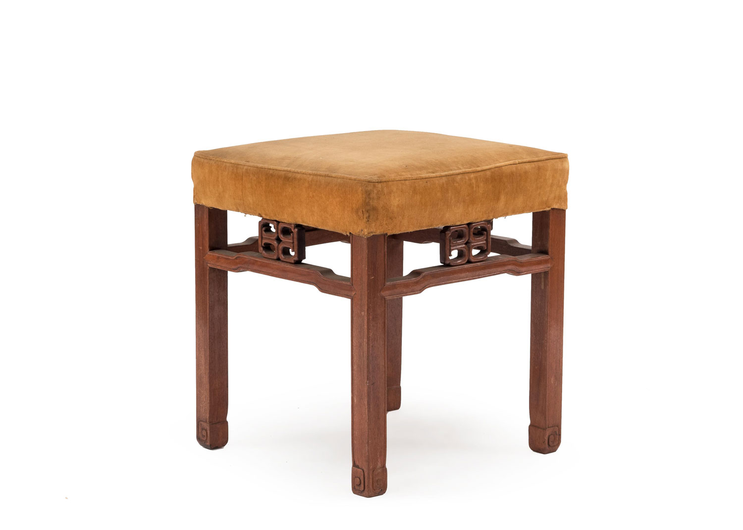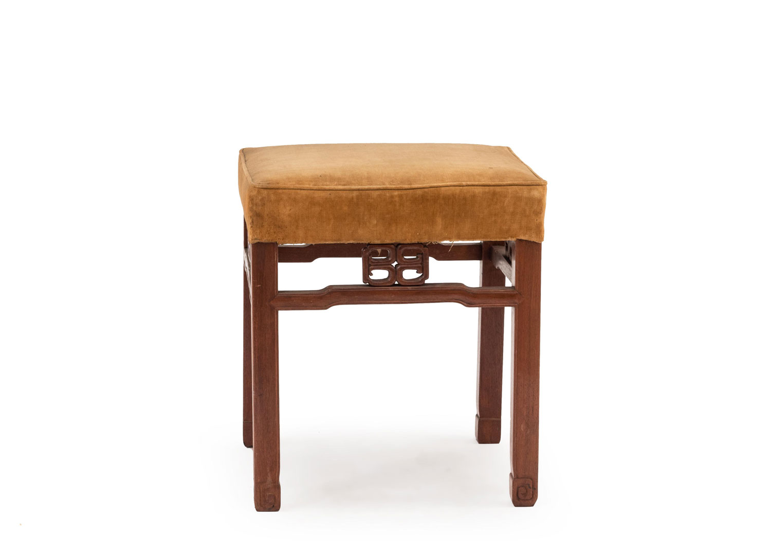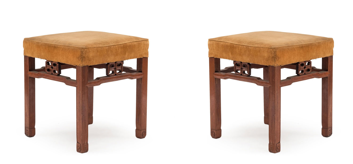 Pair of Asian Chinese style (20th Cent) square teak benches with filigree apron and mustard velvet seat