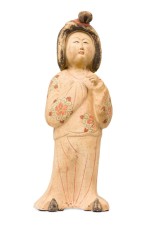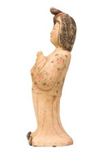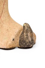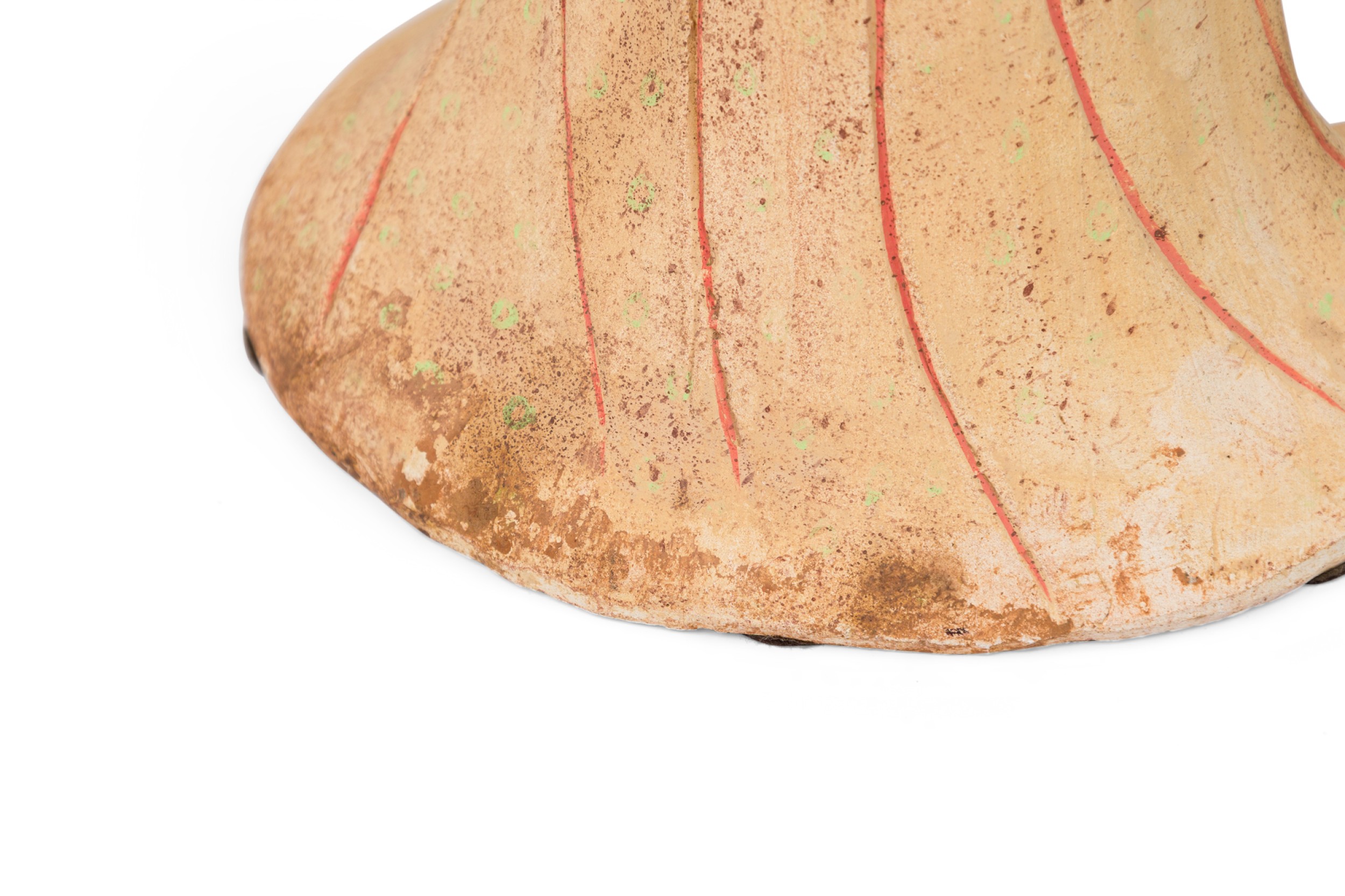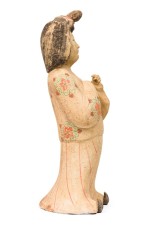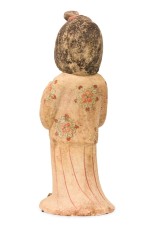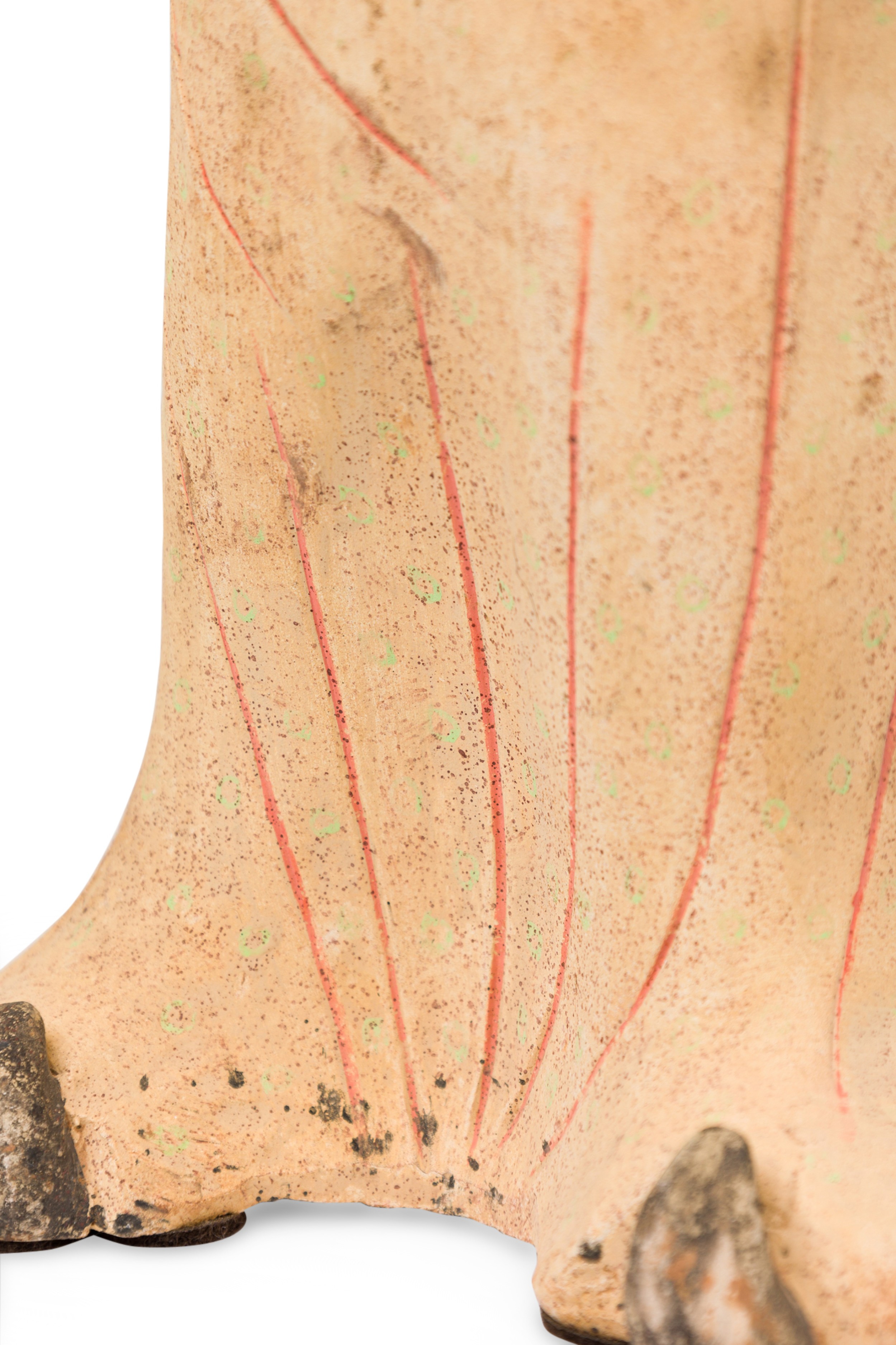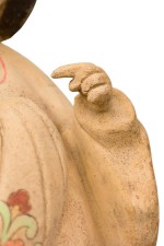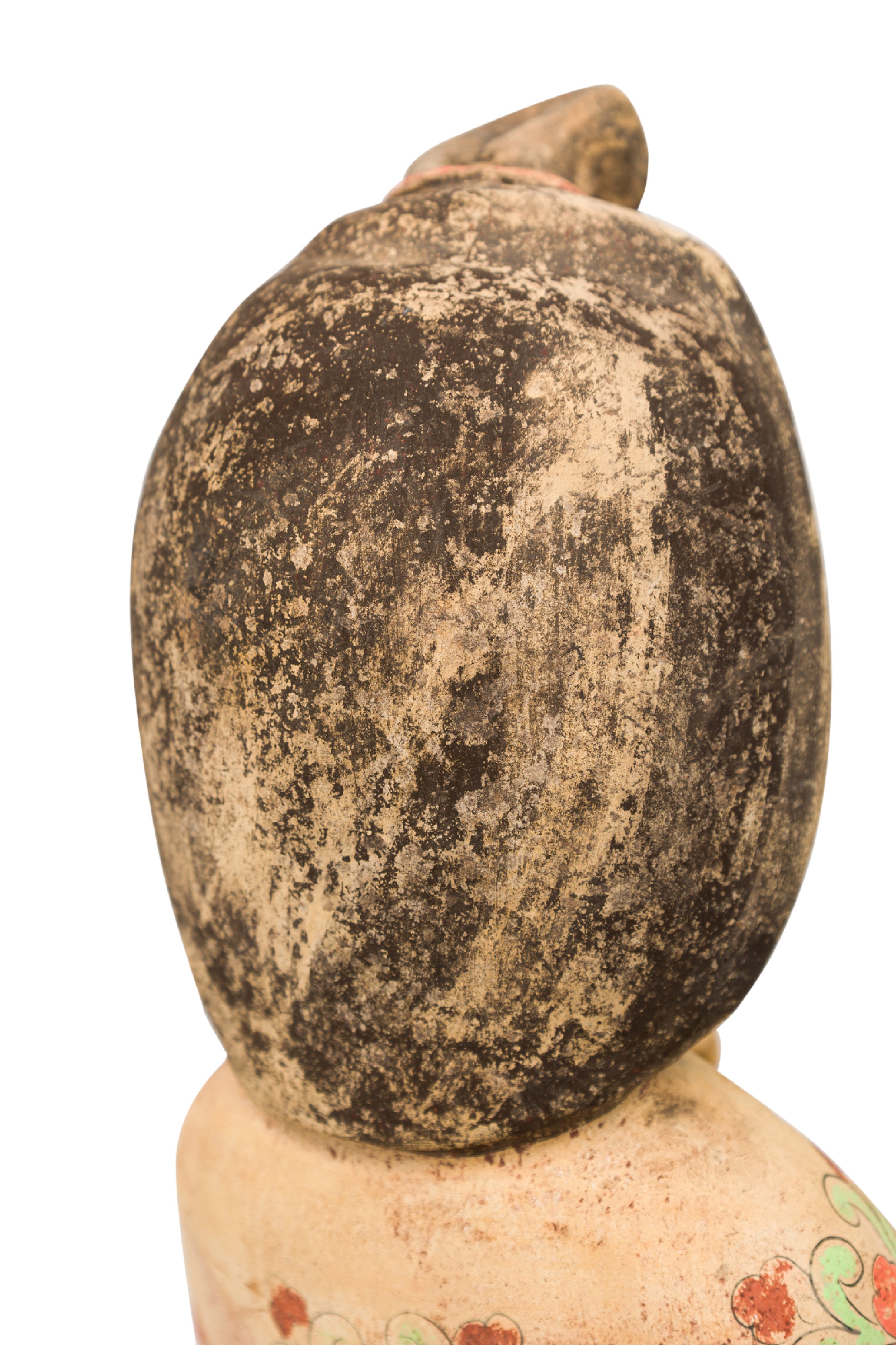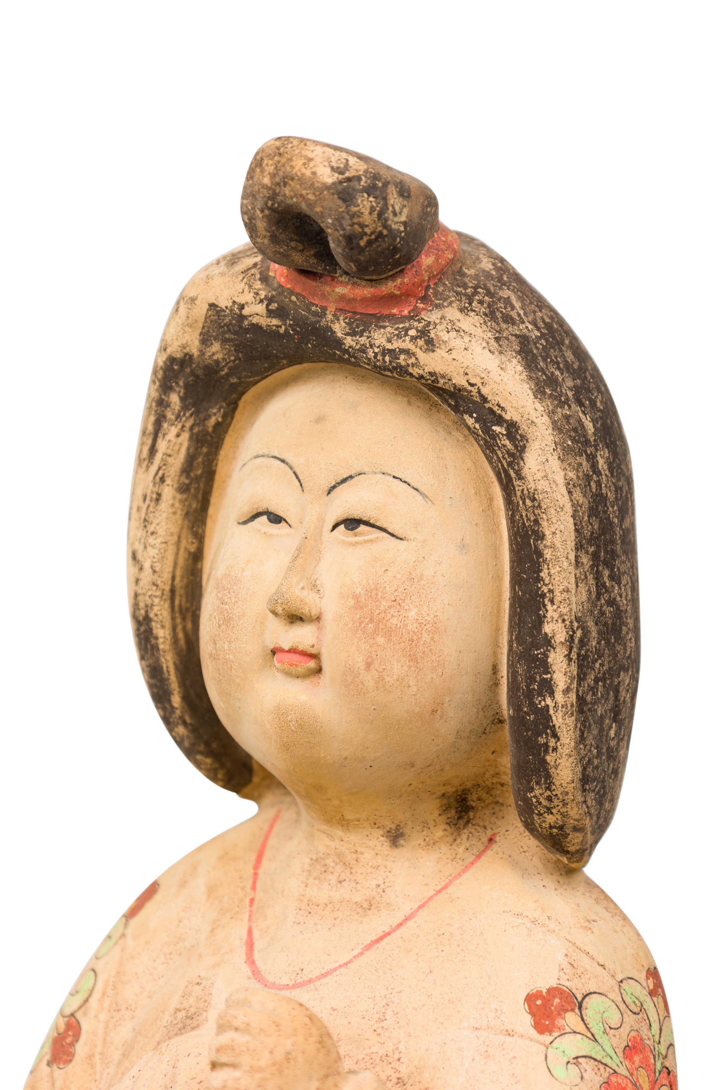 Style: Asian Materials & Techniques: Ceramic, painted Category: Cleared Sculpture Condition: Paint loss on the hair plus erosion on the bottom rim, some discoloration. Dirt and dust accumulation on the surface. Good; Wear consistent with age and use