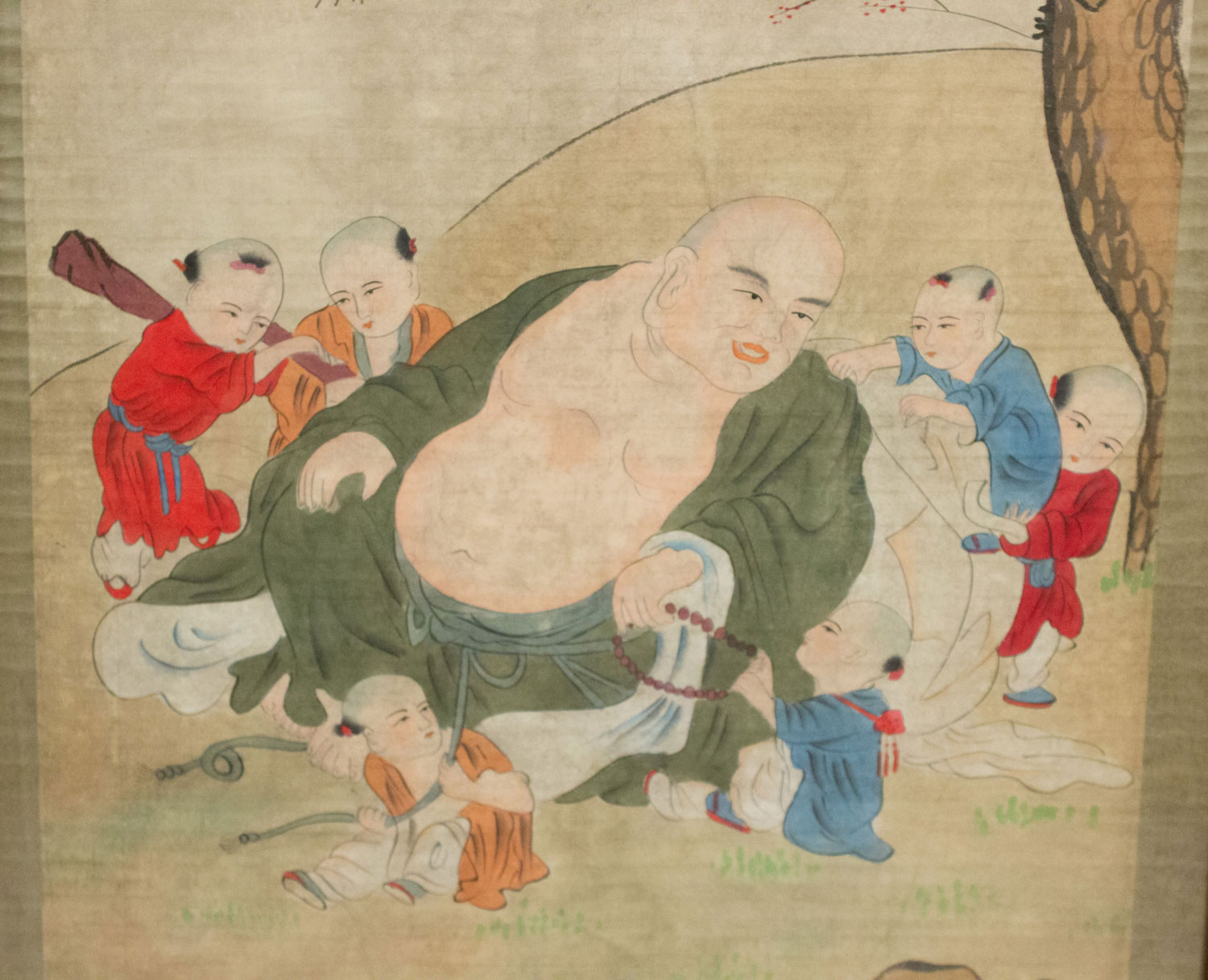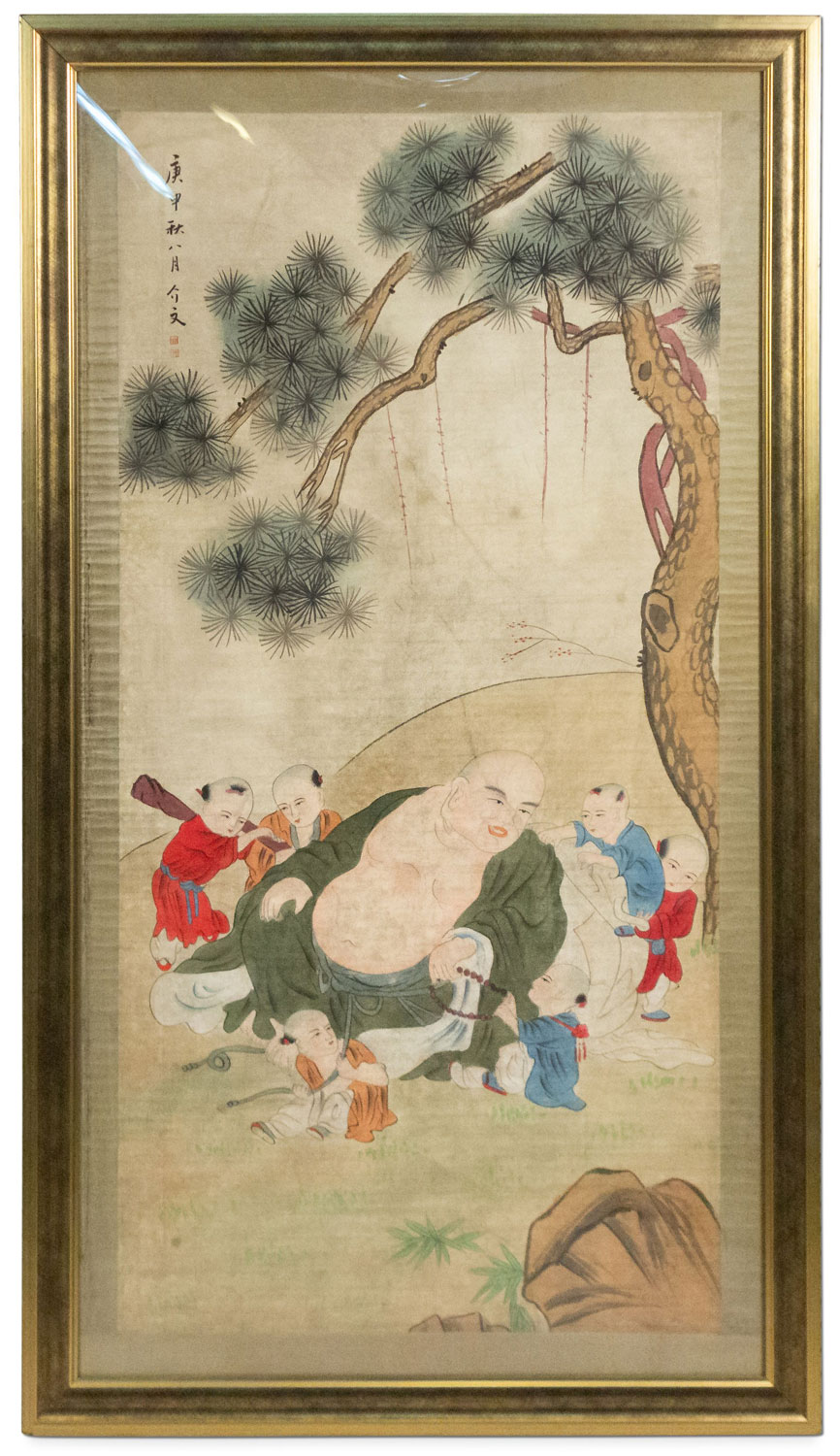 Asian Chinese style (19th Cent) watercolor portrait on paper of fat seated figure surrounded by 6 children in a gilt frame