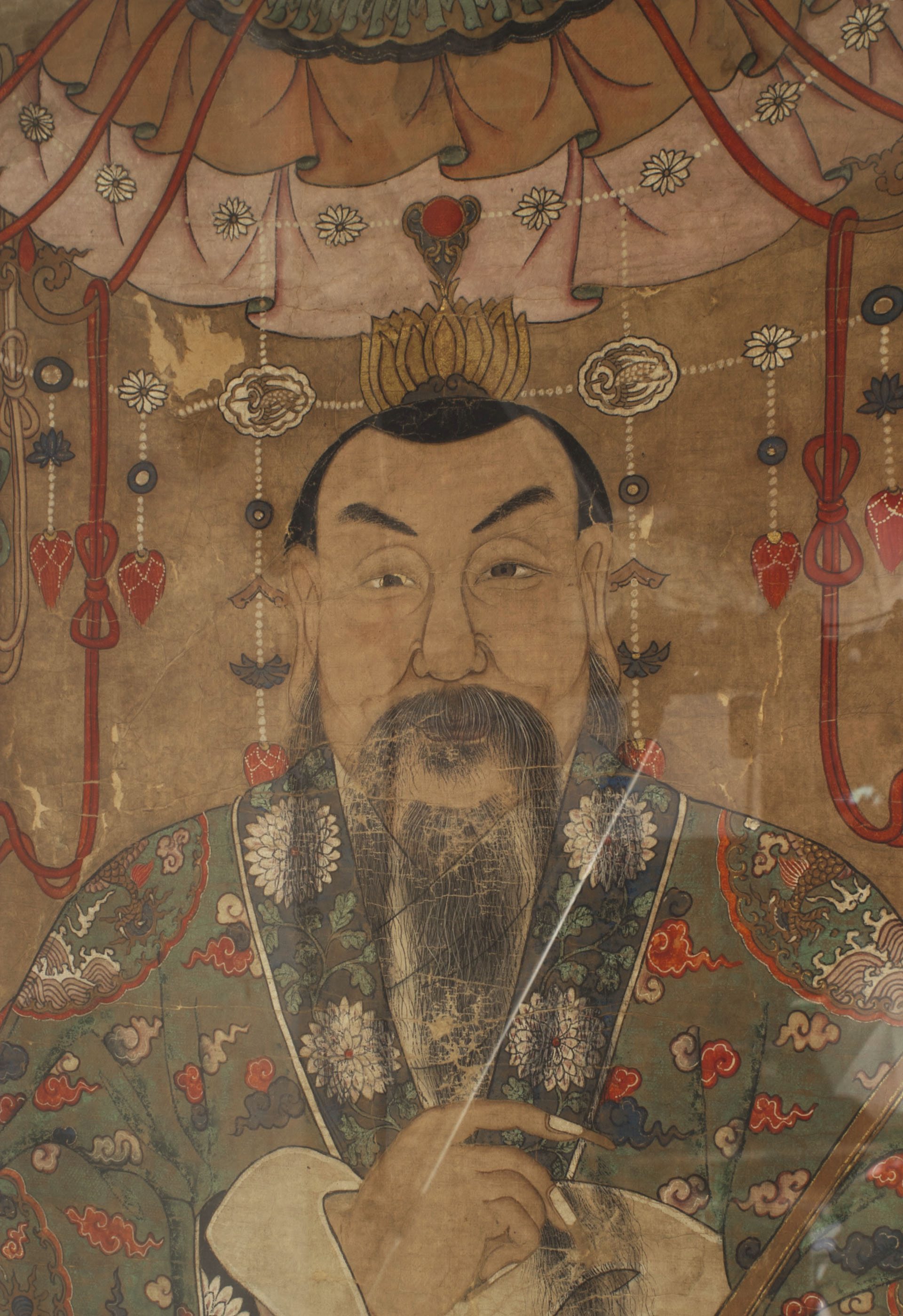 Set of 3 Asian Chinese (18/19th Cent) watercolor portraits each with 2 elaborately costumed figures in gilt trimmed frames..