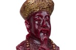 Chinese wax figure molded in a reddish-brown shade with gilt highlights depicts a robed emperor leaning slightly back, his left hand stroking his beard, right arm grasping a sheathed sword with hanging sash..