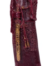 Chinese wax figure molded in a reddish-brown shade with gilt highlights depicts a robed emperor leaning slightly back, his left hand stroking his beard, right arm grasping a sheathed sword with hanging sash.