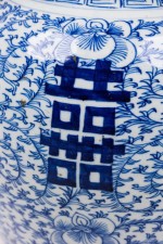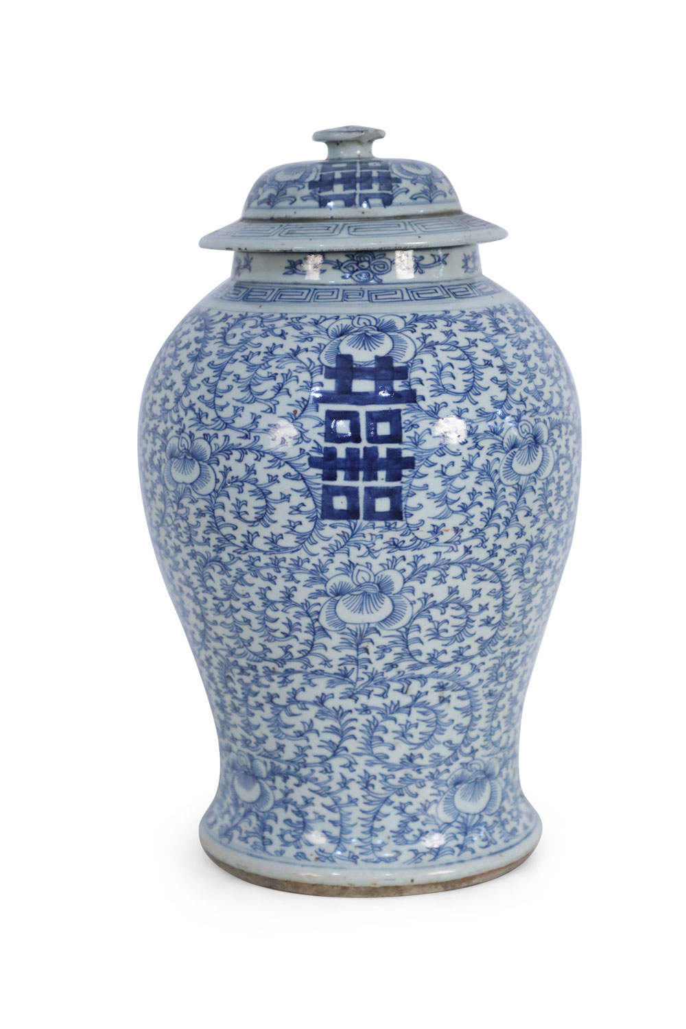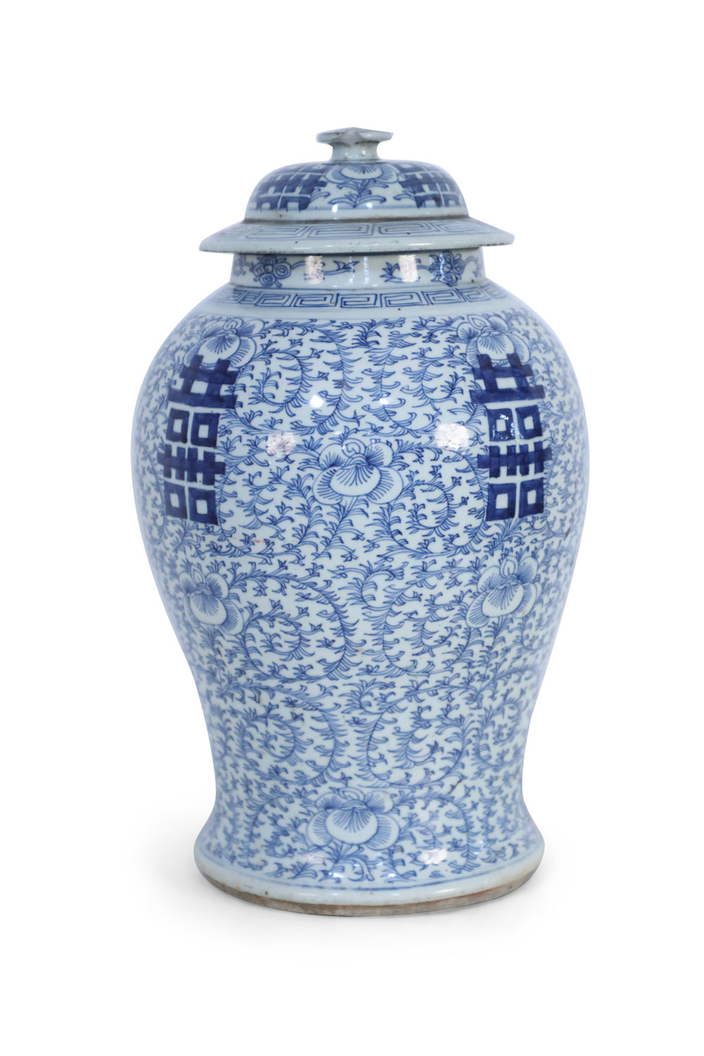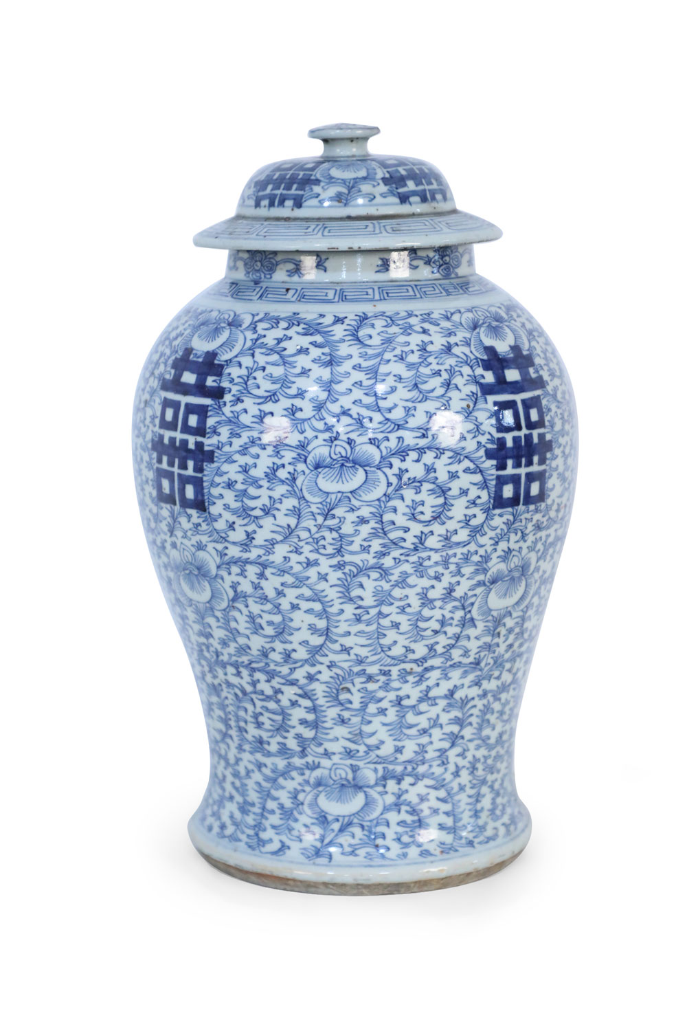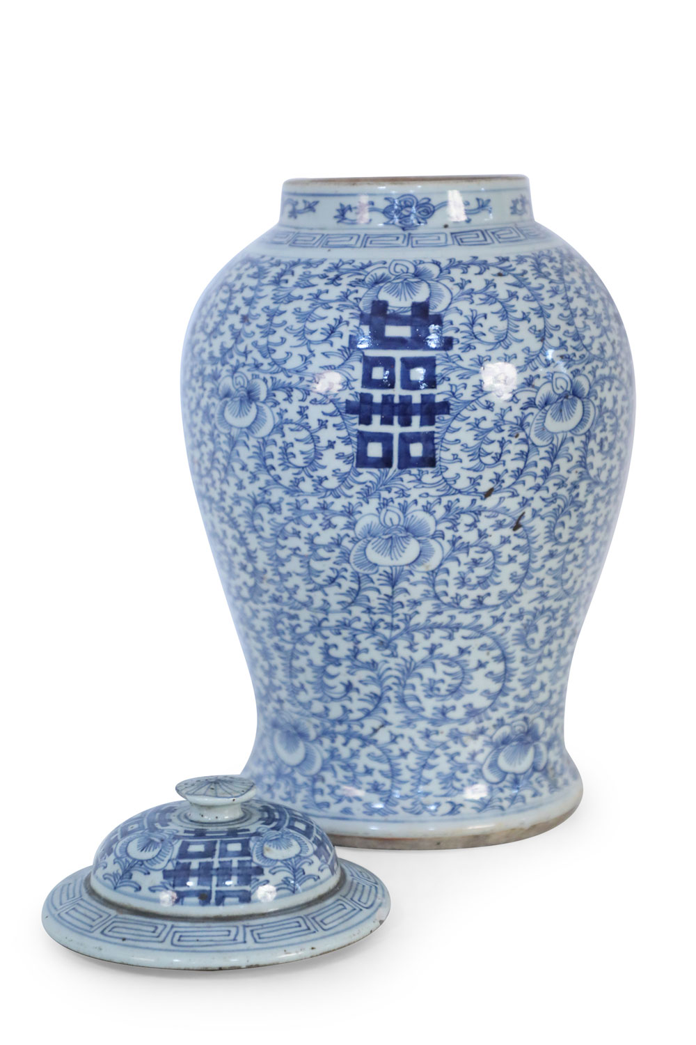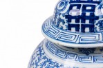Chinese White and Blue Character and Floral Lidded Ginger Jar