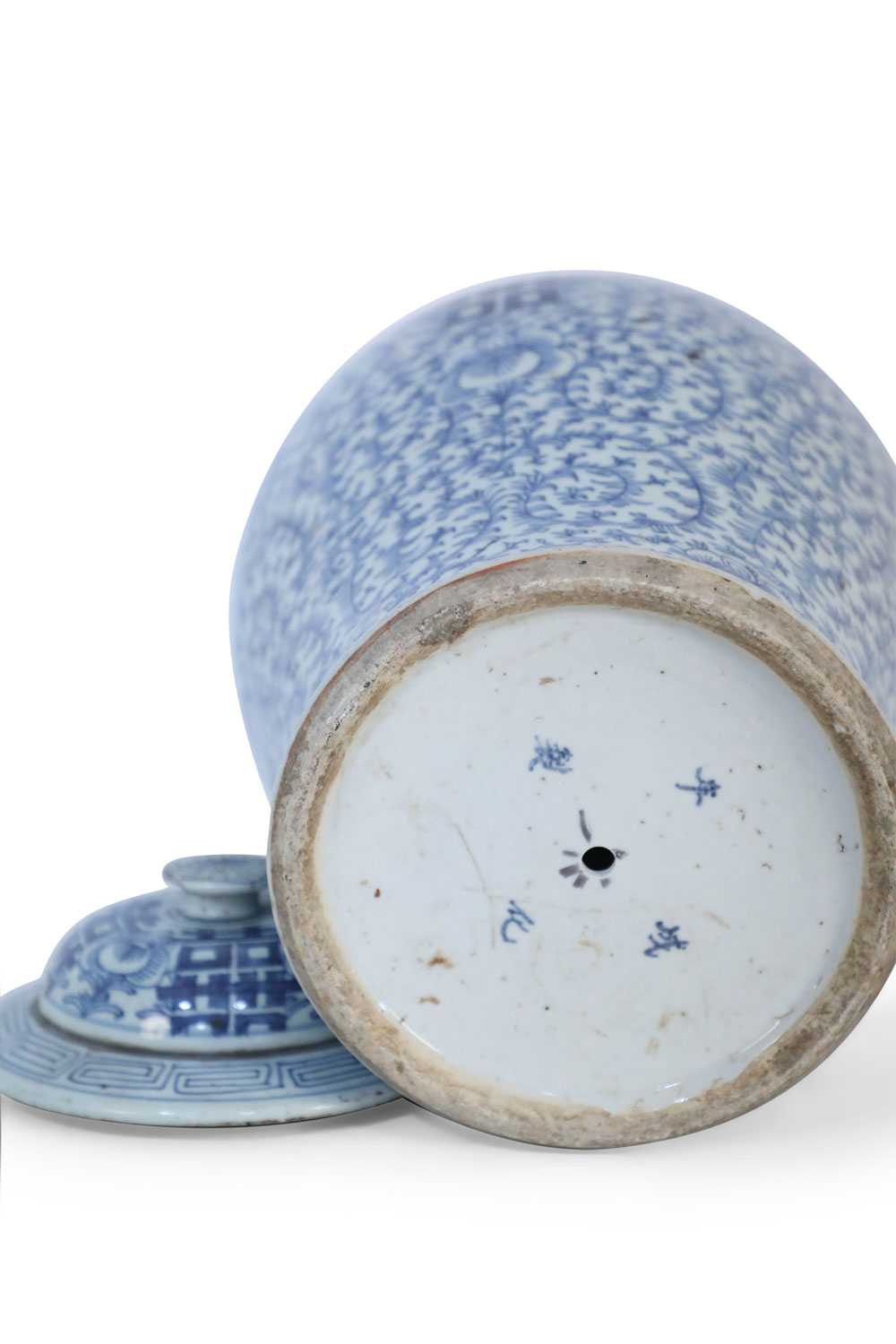 Antique Chinese (Late 19th Century) lidded ceramic ginger jar urn with blue floral designs surrounding bold, centered characters on 4 sides.