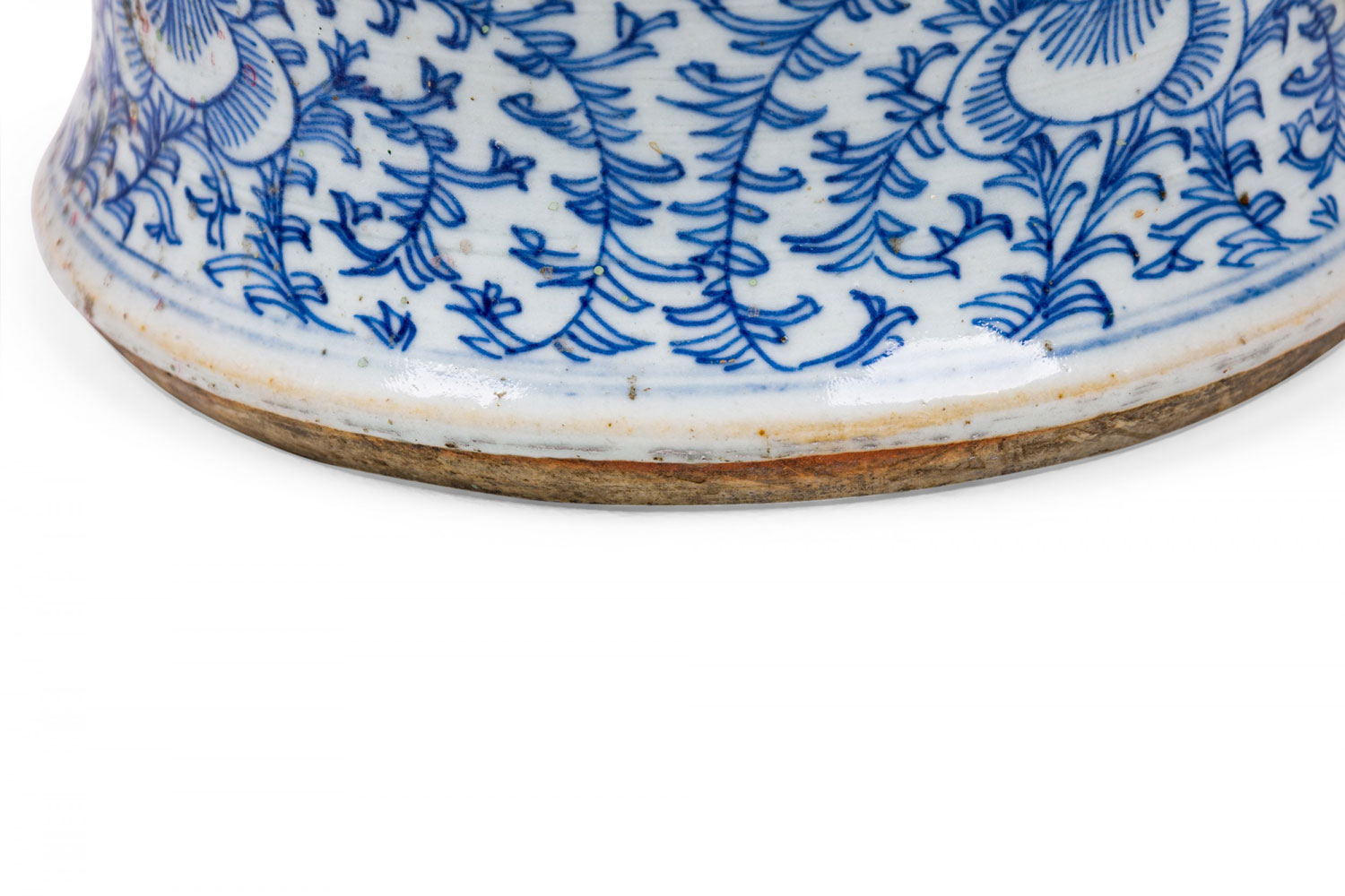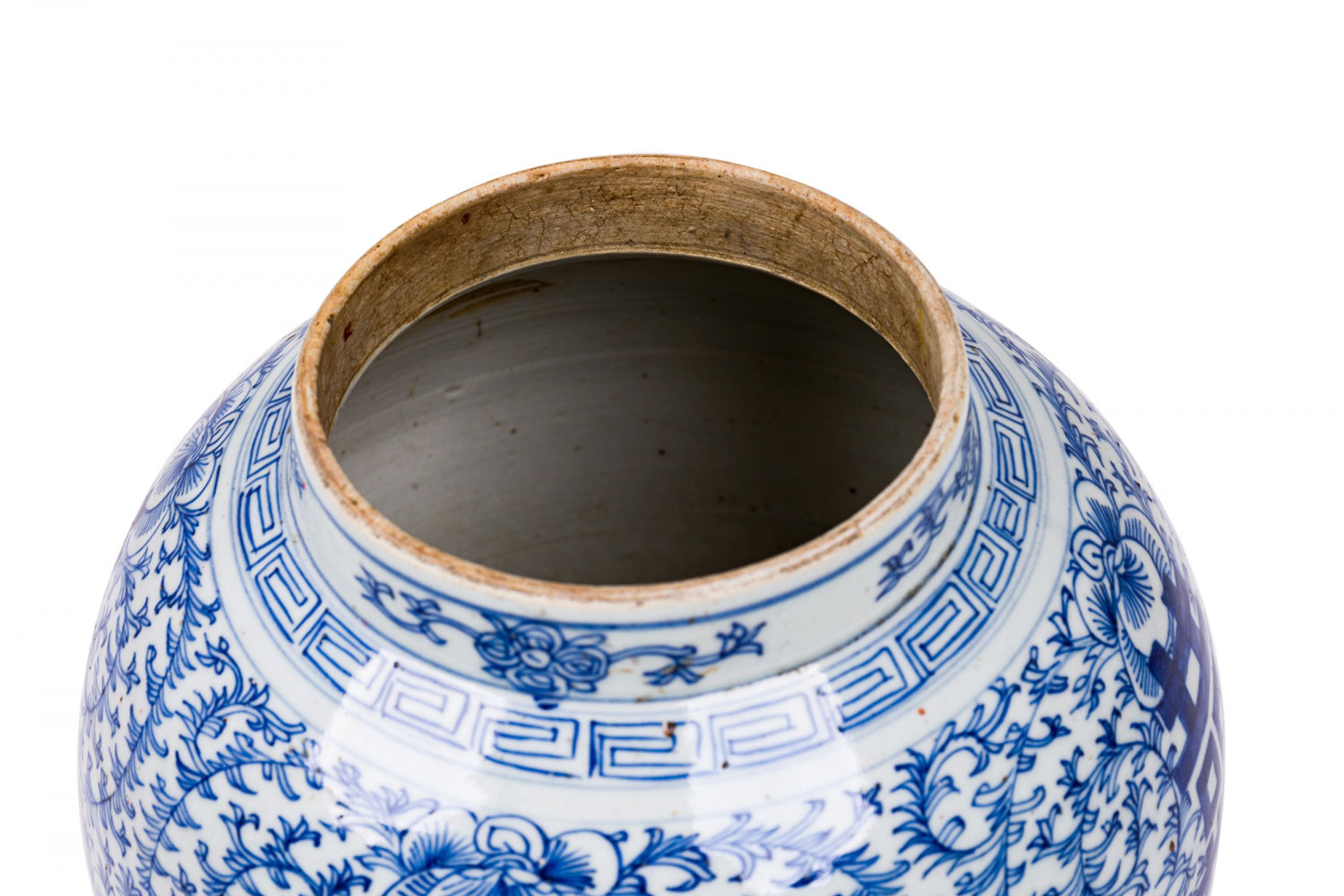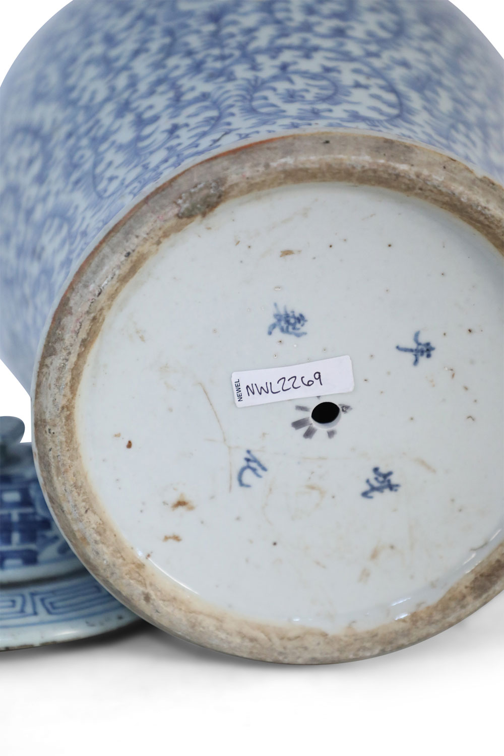 Antique Chinese (Late 19th Century) lidded ceramic ginger jar urn with blue floral designs surrounding bold, centered characters on 4 sides..
