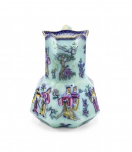 English Vicctorian light blue porcelain pitcher decorated with Chinoiserie figures and a dragon handle with gilt accents (Copeland Late Spode).