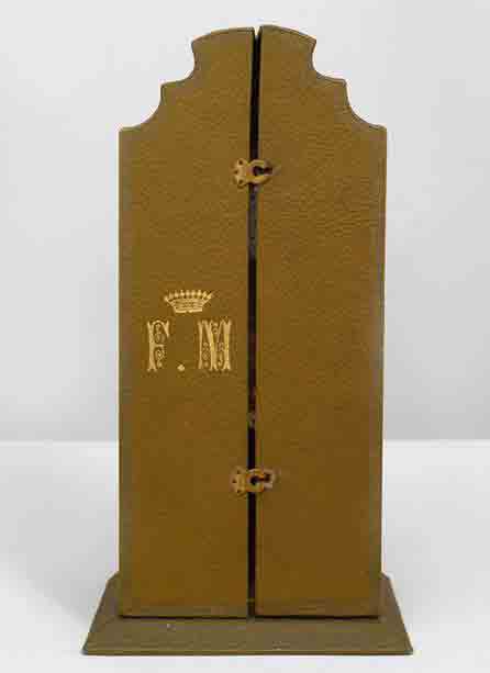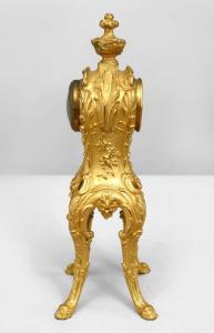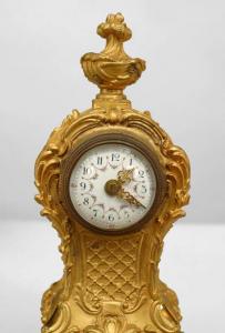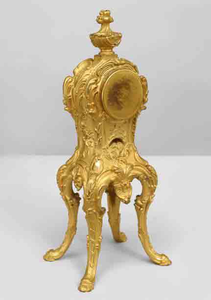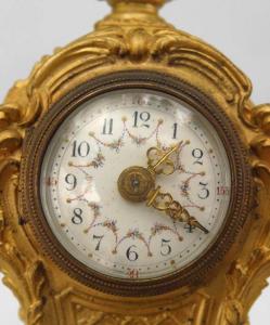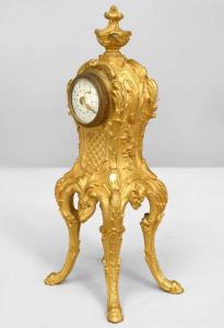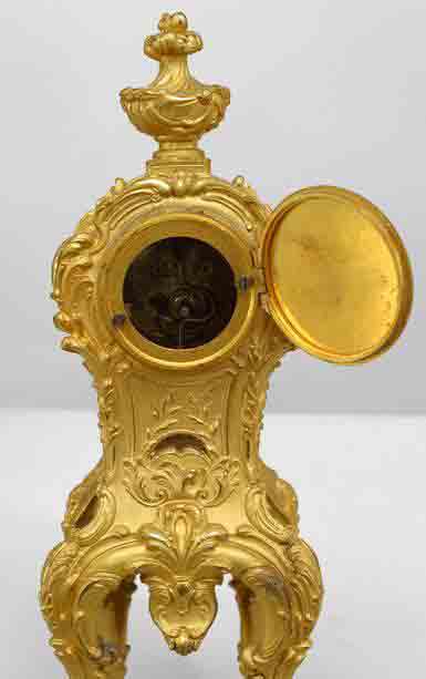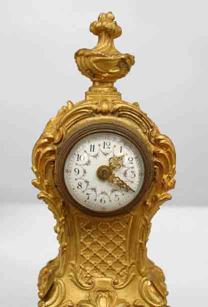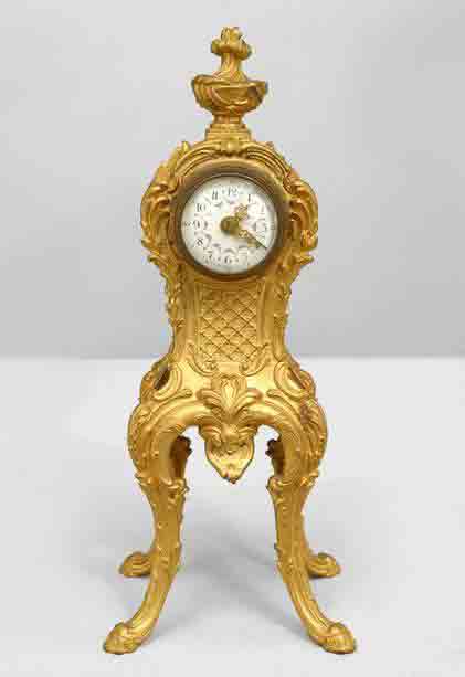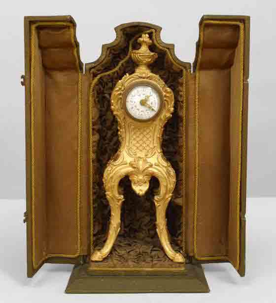 French Louis XV style (19th Cent) miniature metal dore desk clock on legs in case (not working).