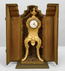 French Louis XV style (19th Cent) miniature metal dore desk clock on legs in case (not working)