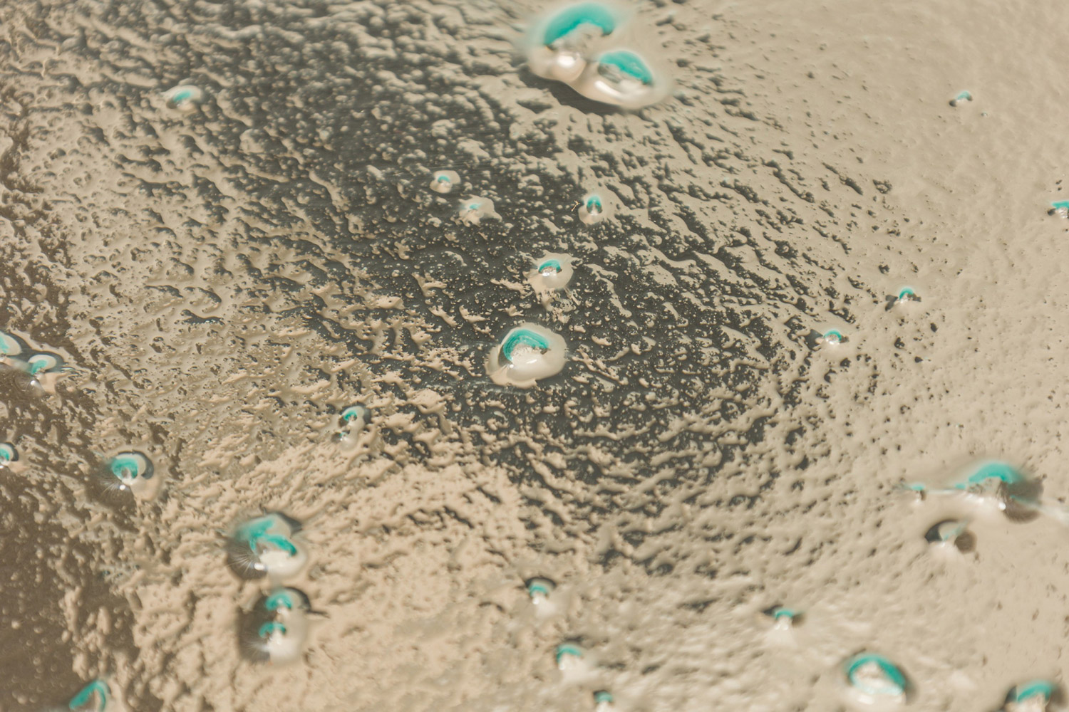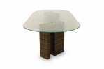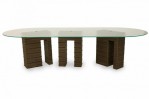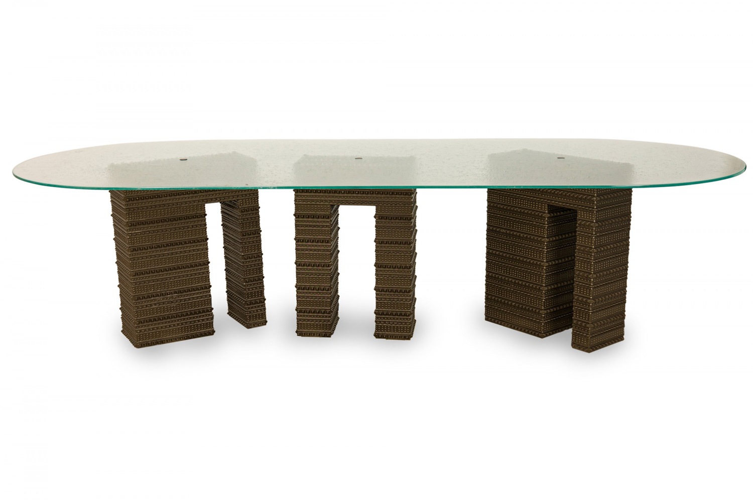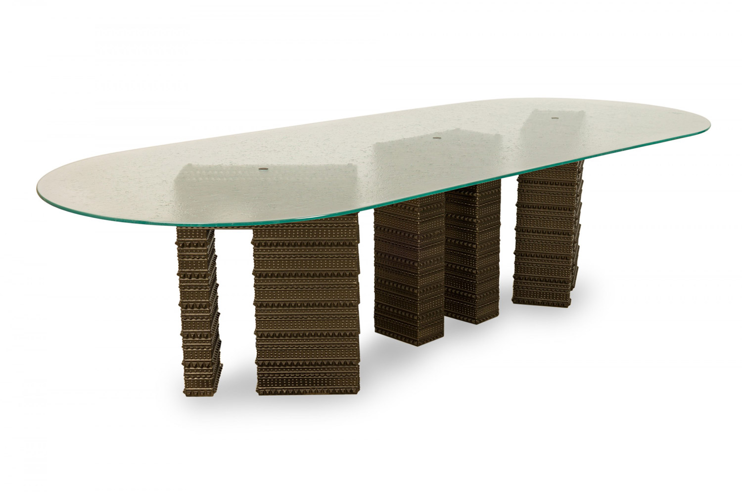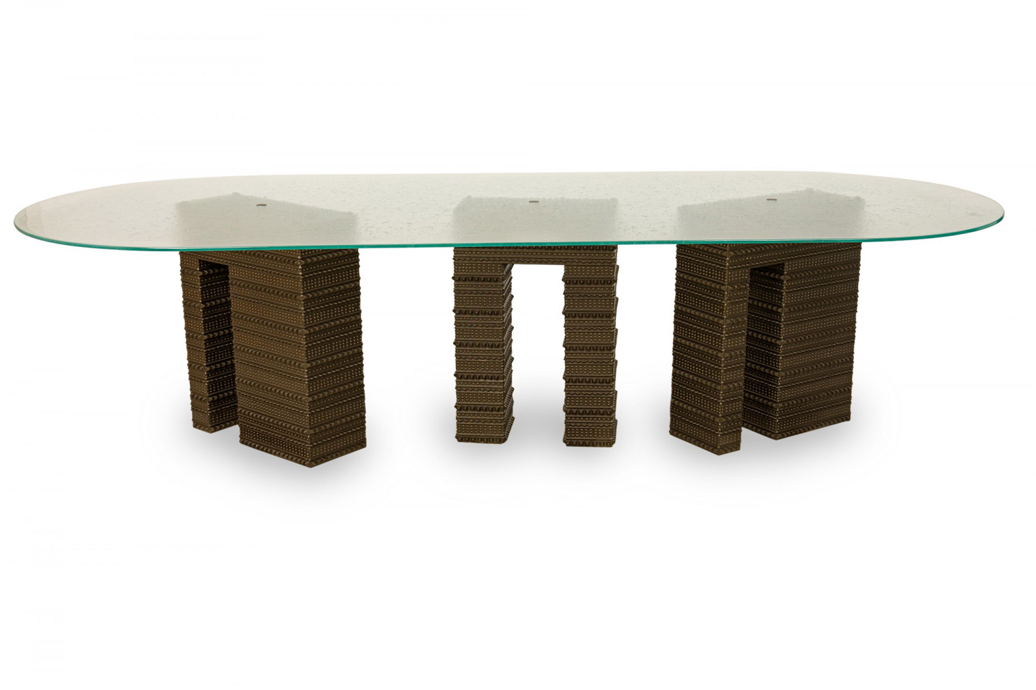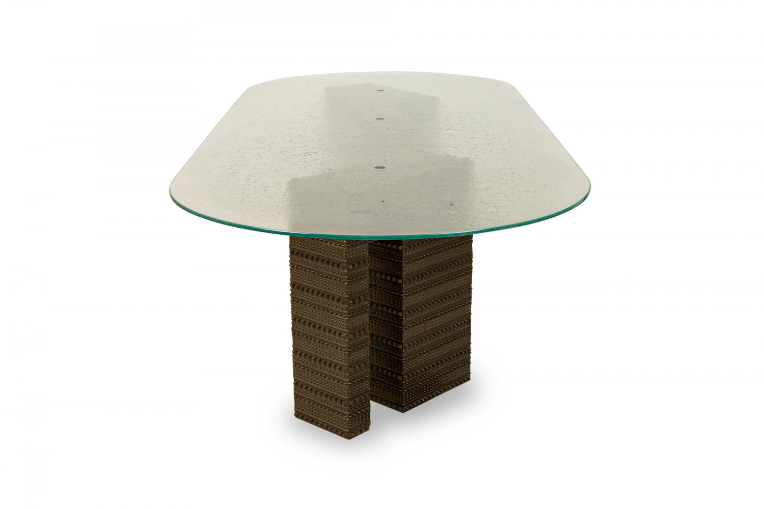 Contemporary Modern dining / conference table with an oval clear seeded glass top resting on three geometric rectangular bases made of bronze coated aluminum..