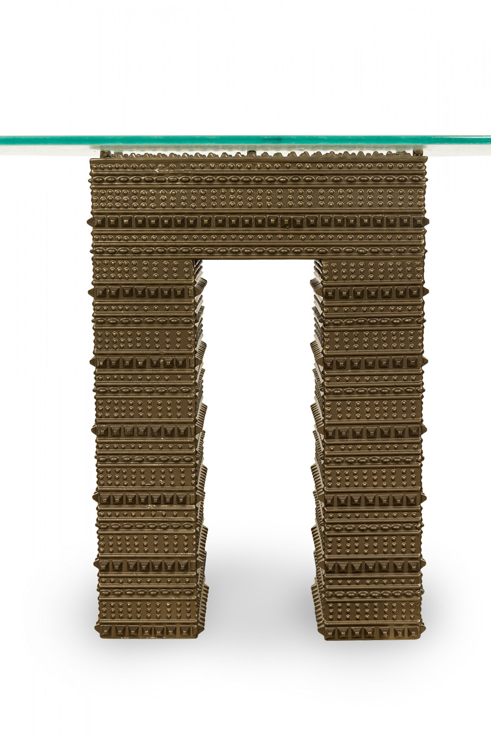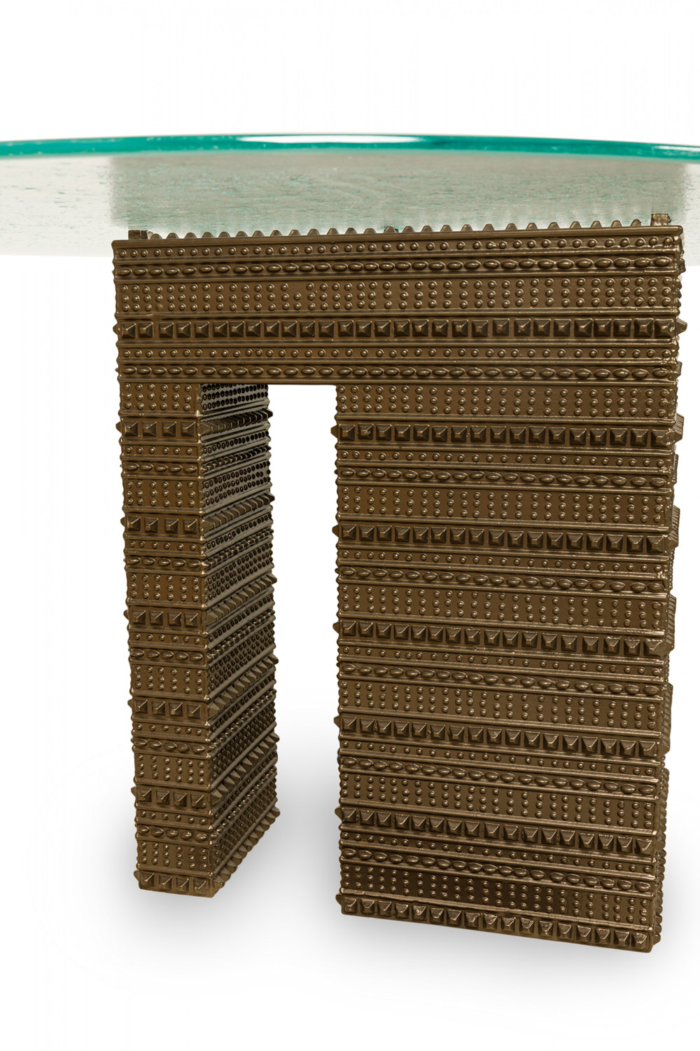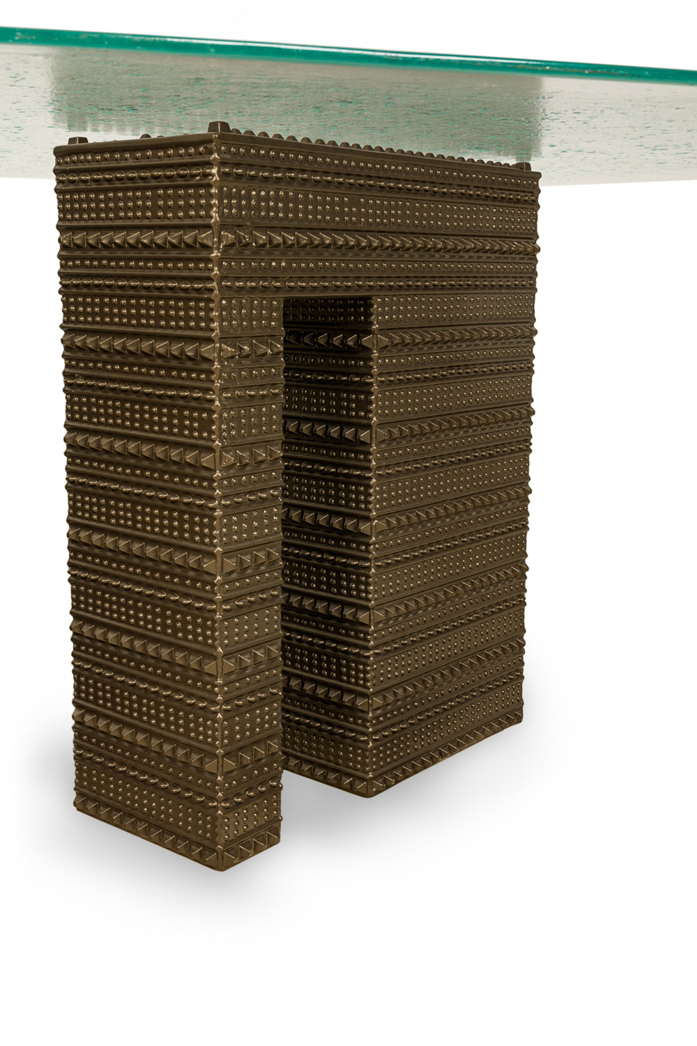 Contemporary Modern dining / conference table with an oval clear seeded glass top resting on three geometric rectangular bases made of bronze coated aluminum.