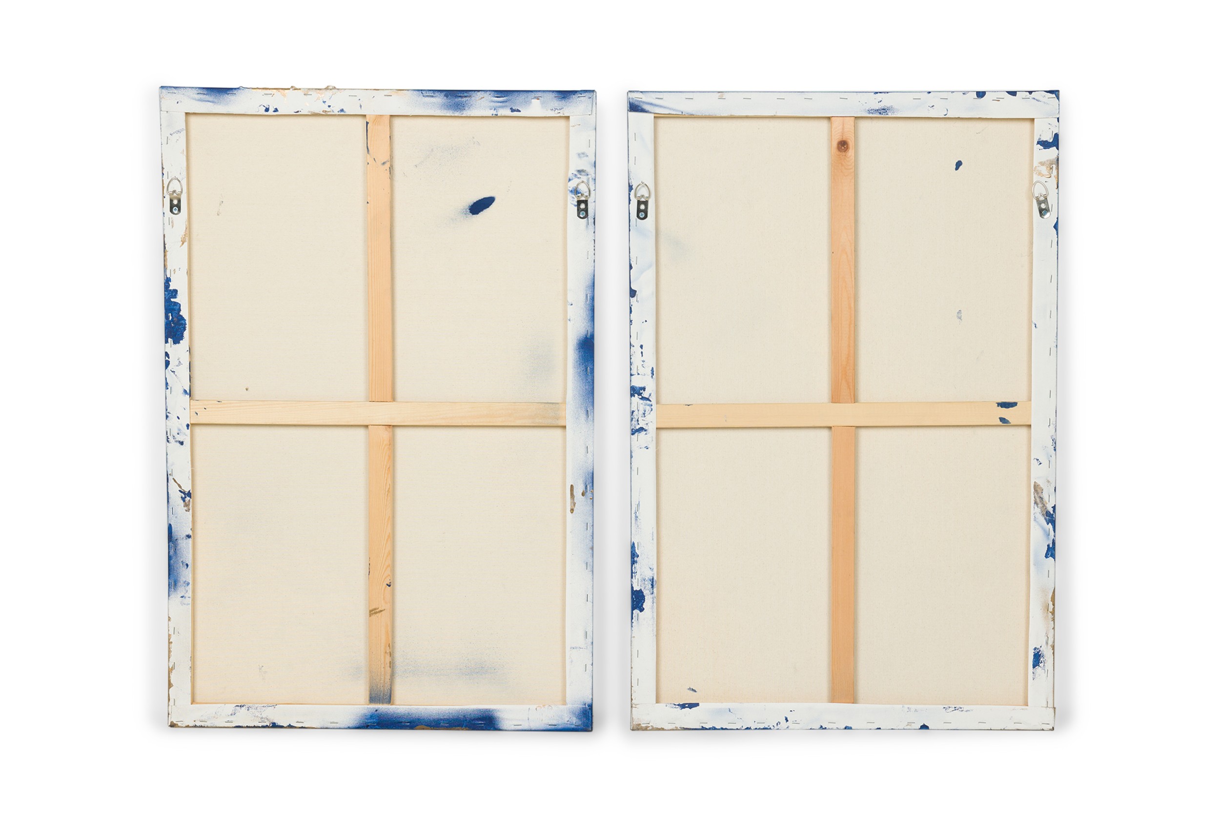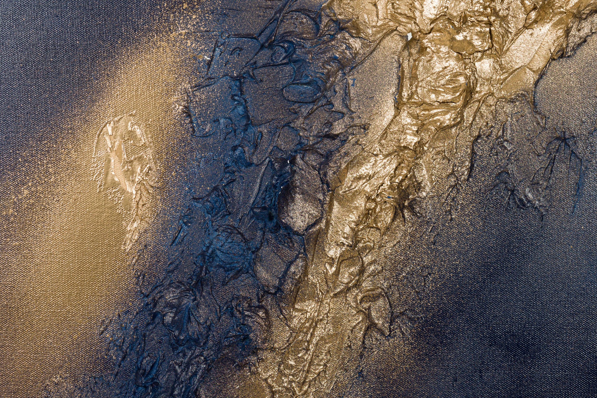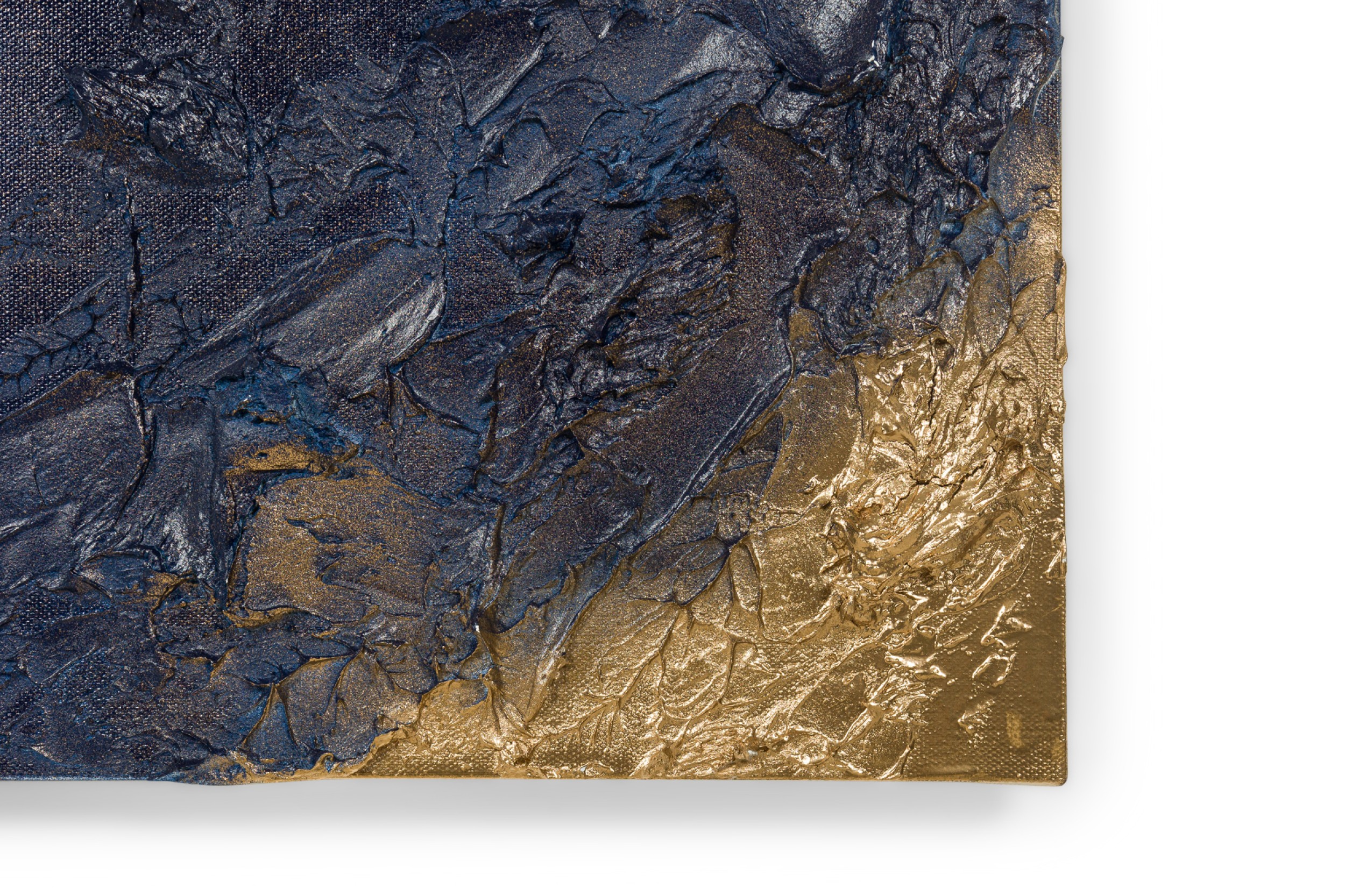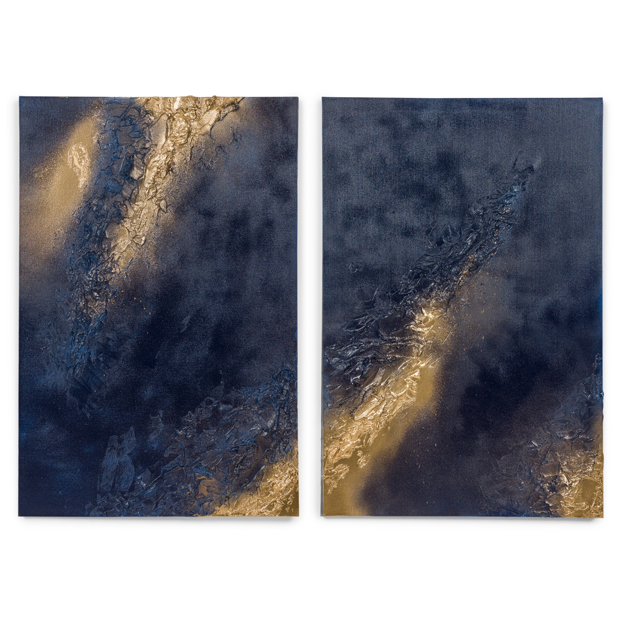Contemporary diptych of abstract mixed media paintings with textured 3D shapes highlighted in gold on blue rectangular stretched canvases. (BARBARA KISKOVSKI)