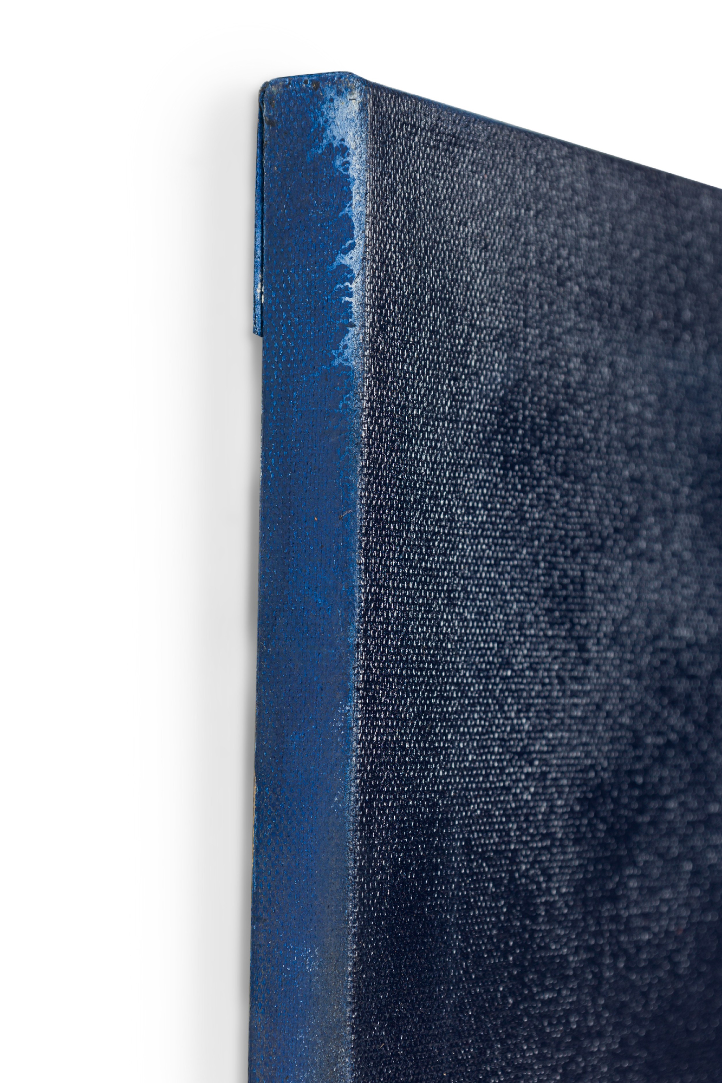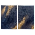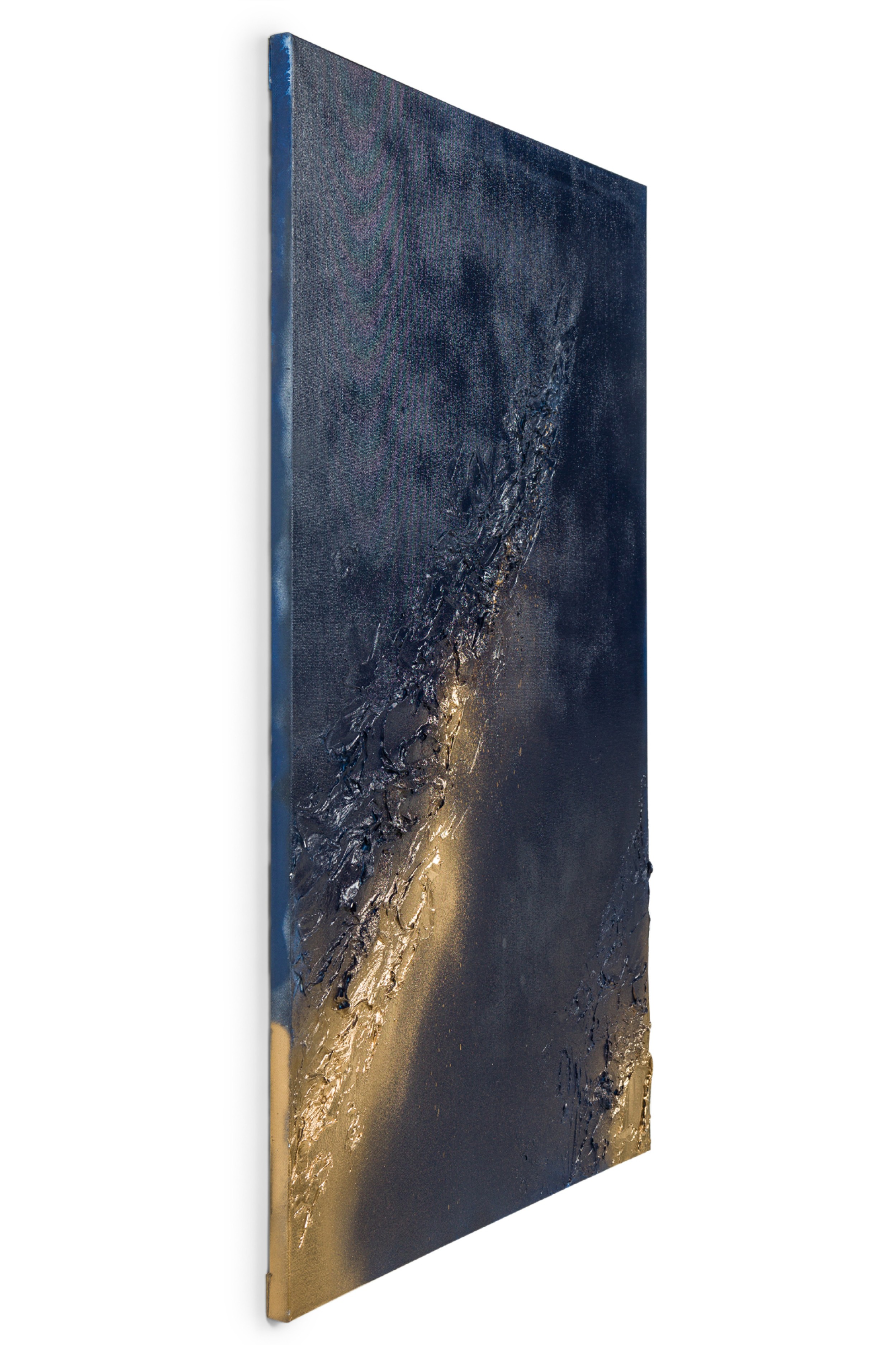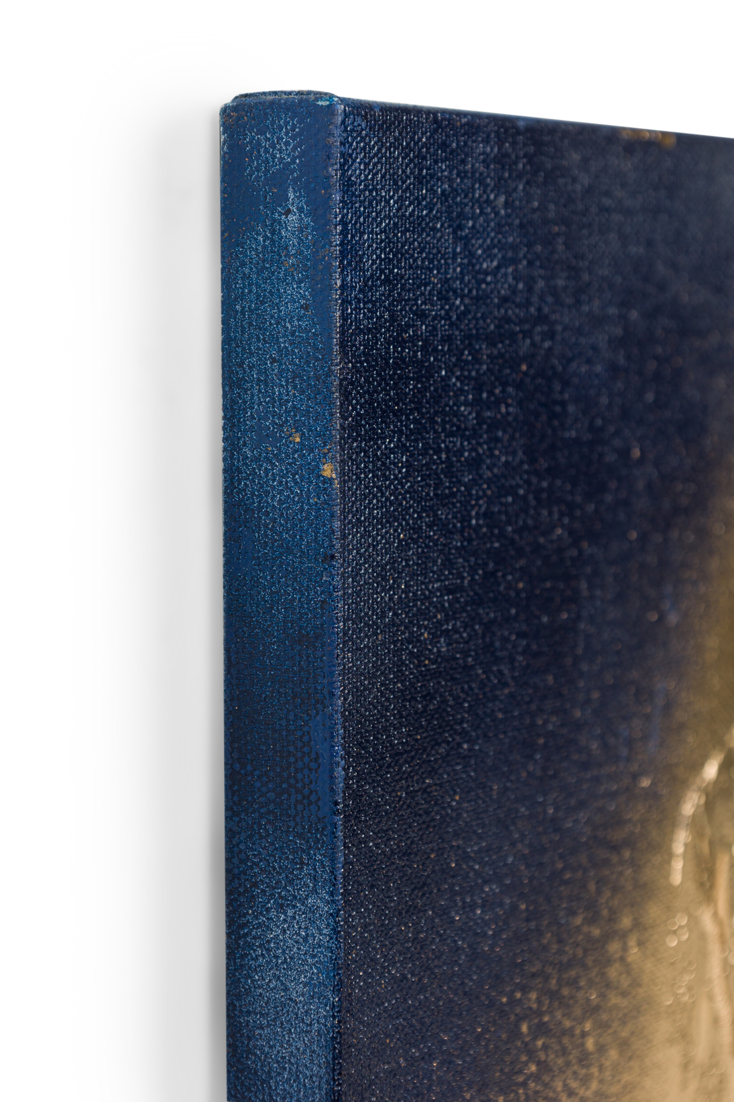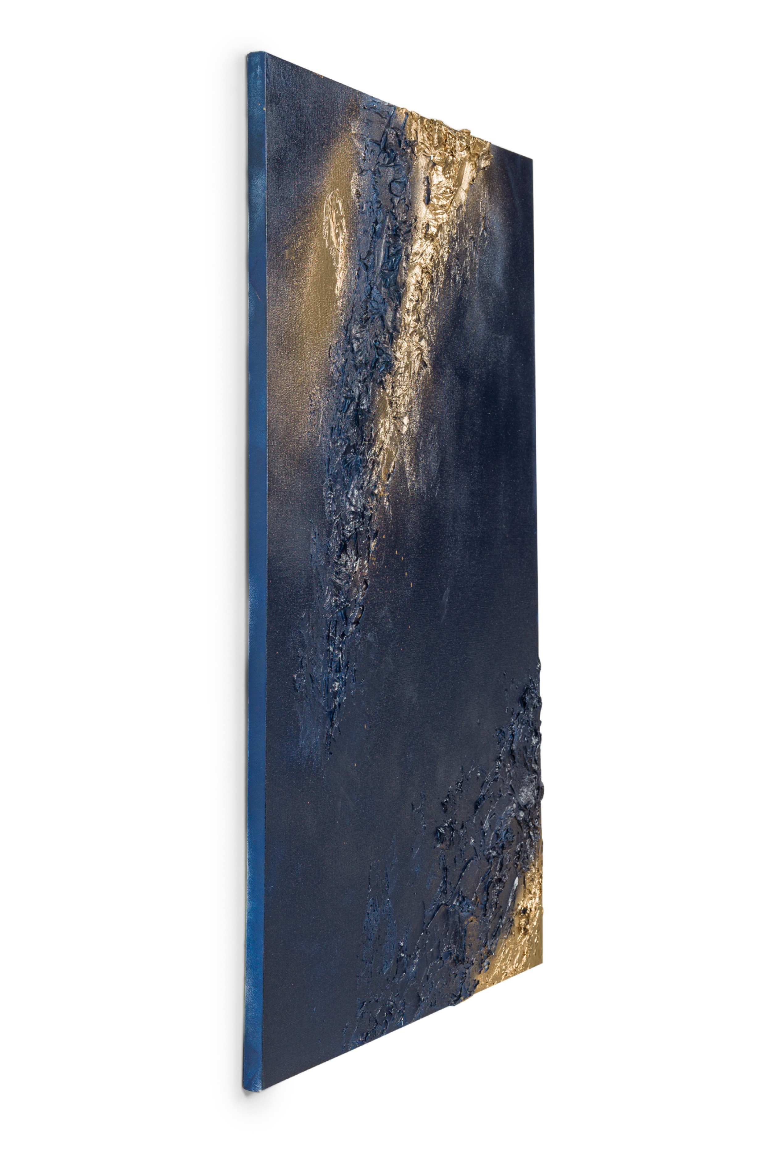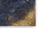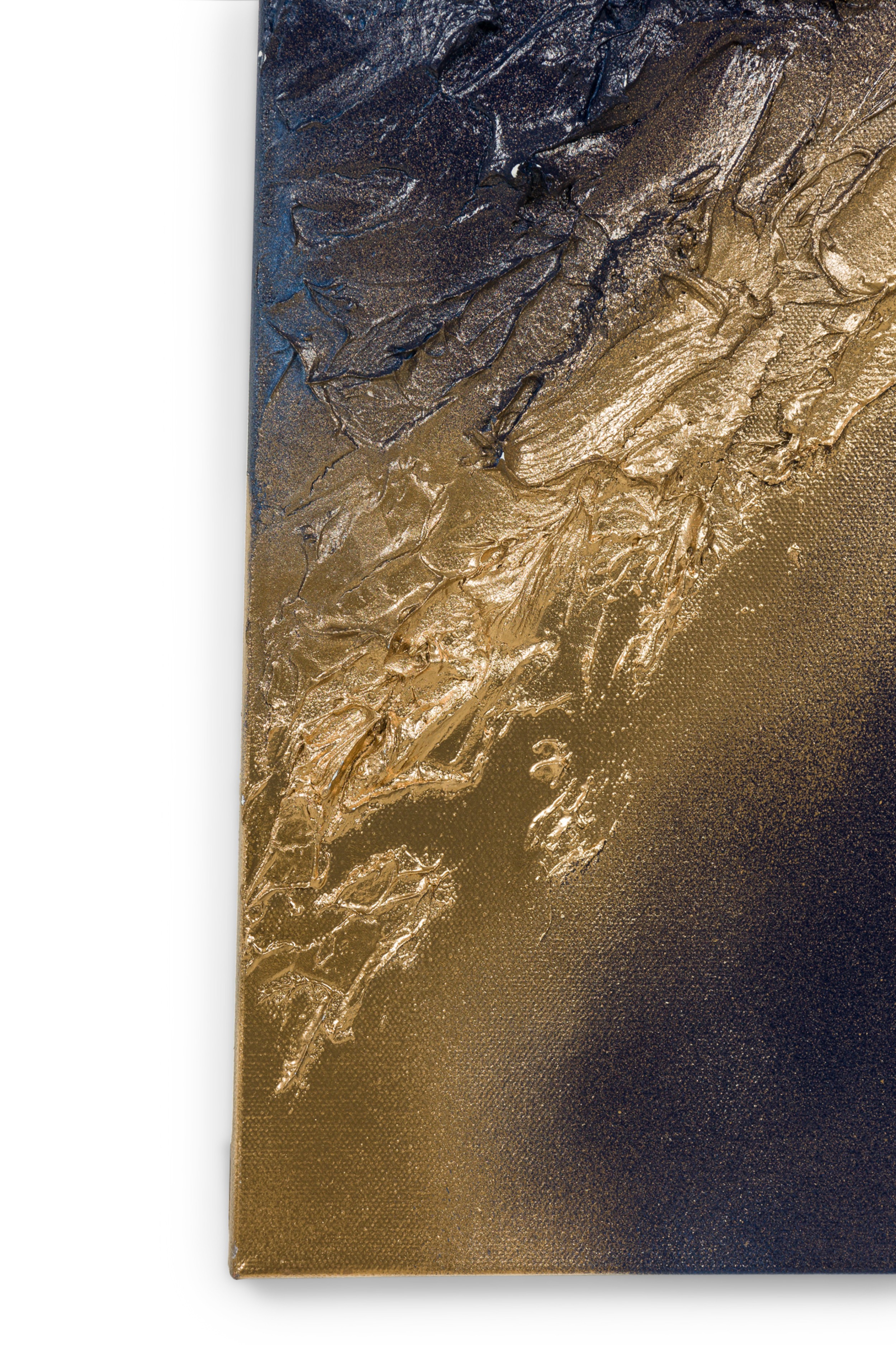 Contemporary diptych of abstract mixed media paintings with textured 3D shapes highlighted in gold on blue rectangular stretched canvases. (BARBARA KISKOVSKI).