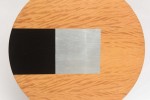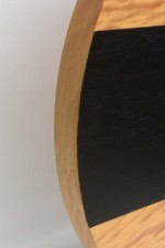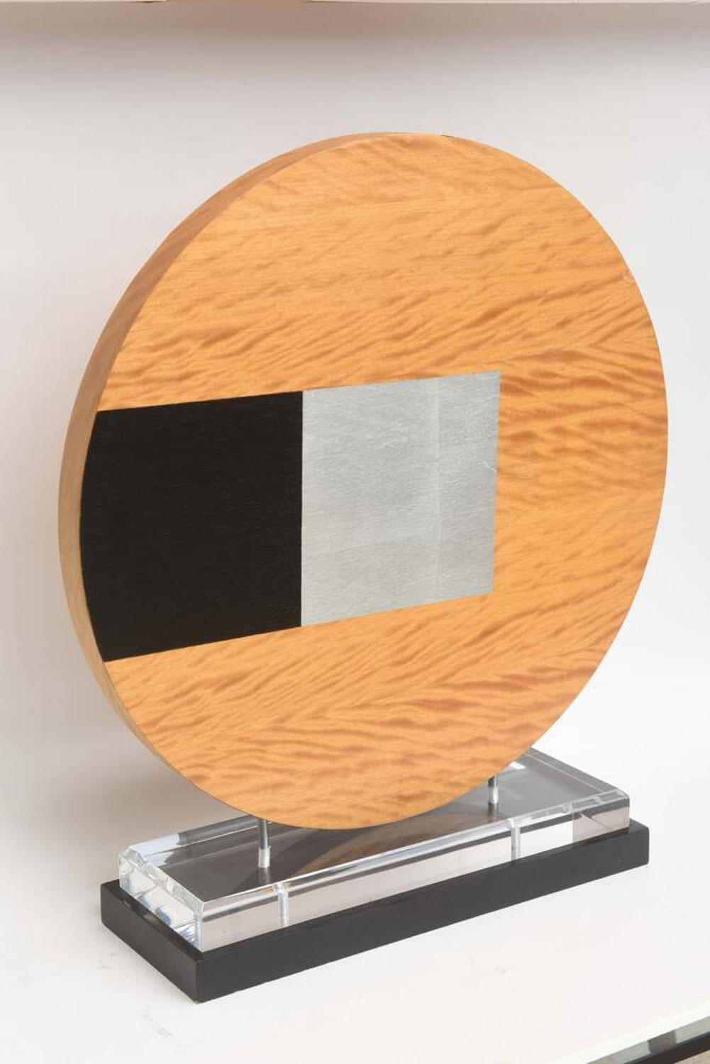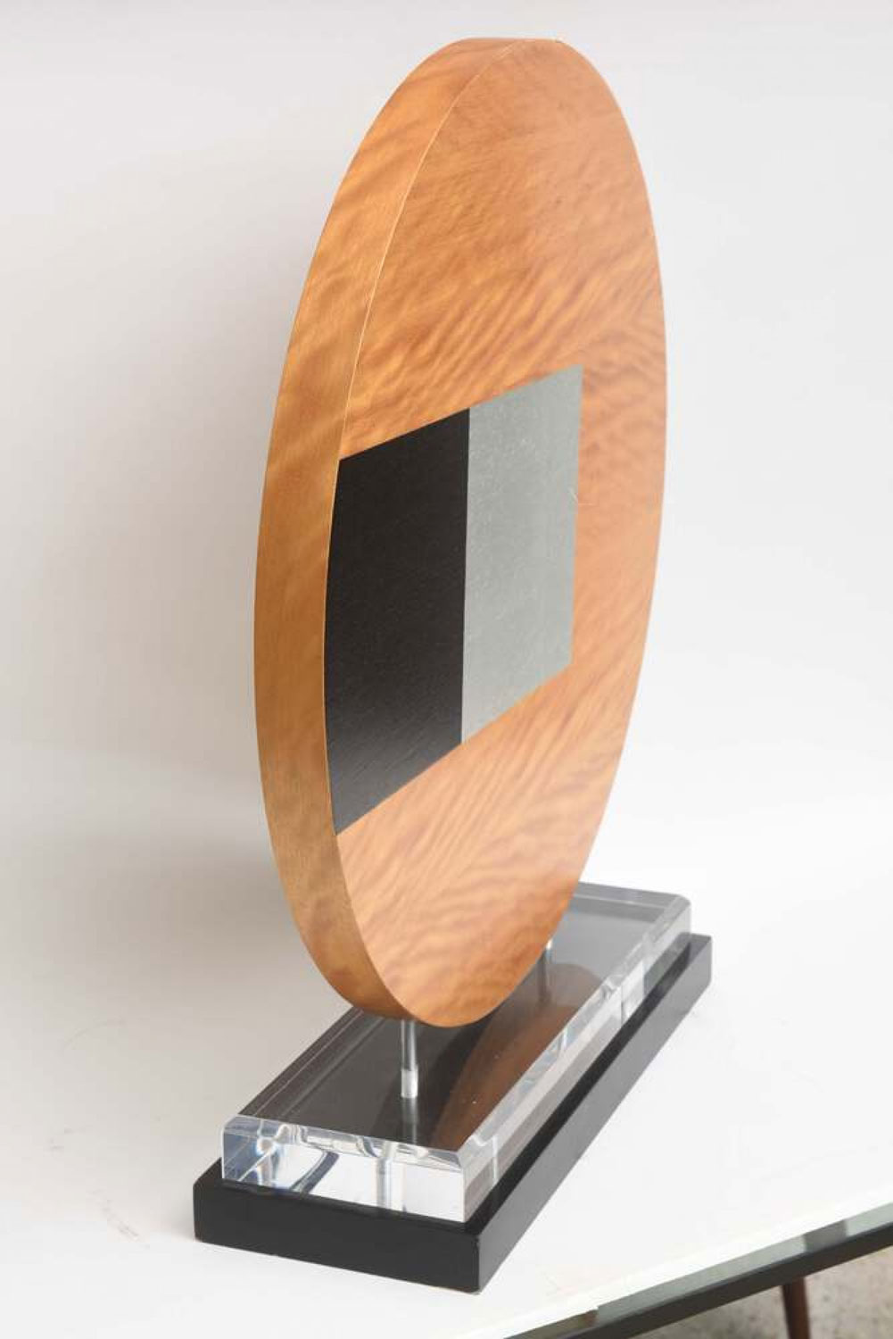 Contemporary American abstract sculpture featuring a wooden desk with geometric black and gray designs, mounted on a rectangular base..