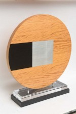 Contemporary American abstract sculpture featuring a wooden desk with geometric black and gray designs, mounted on a rectangular base.