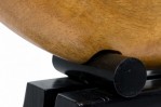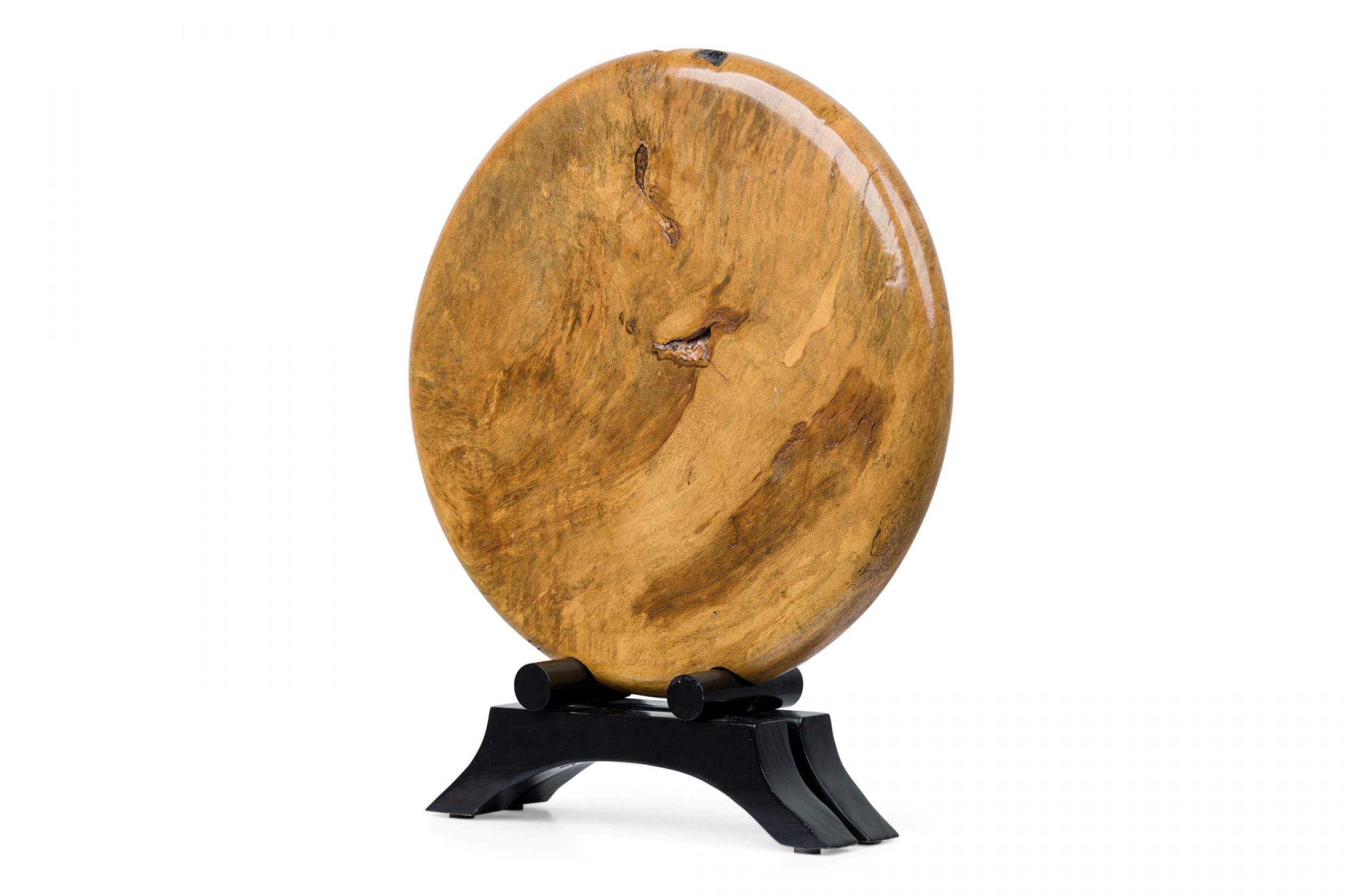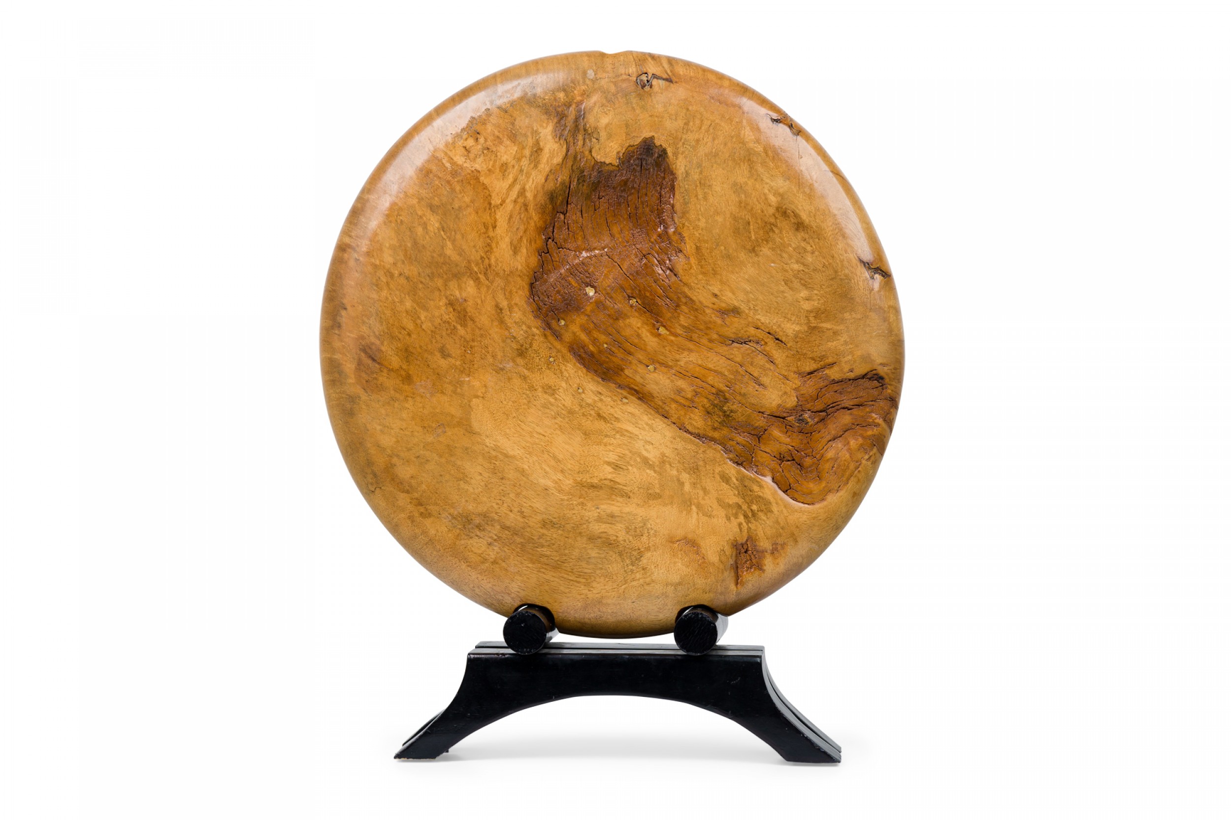 Contemporary American Modern circular / disc burl wood sculpture on and ebonized stand.