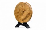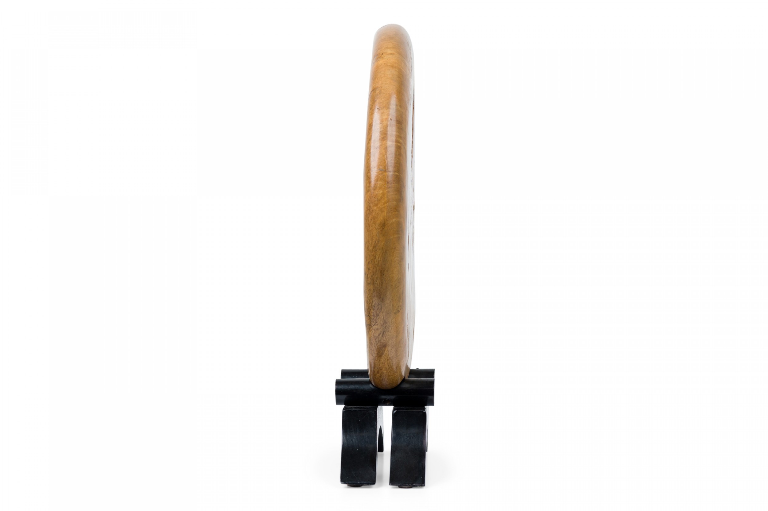Contemporary American Modern circular / disc burl wood sculpture on and ebonized stand..