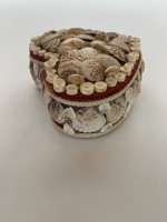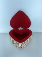 Contemporary American Modern heart shaped jewelry box, with an applied seashell exterior and red velvet interior..