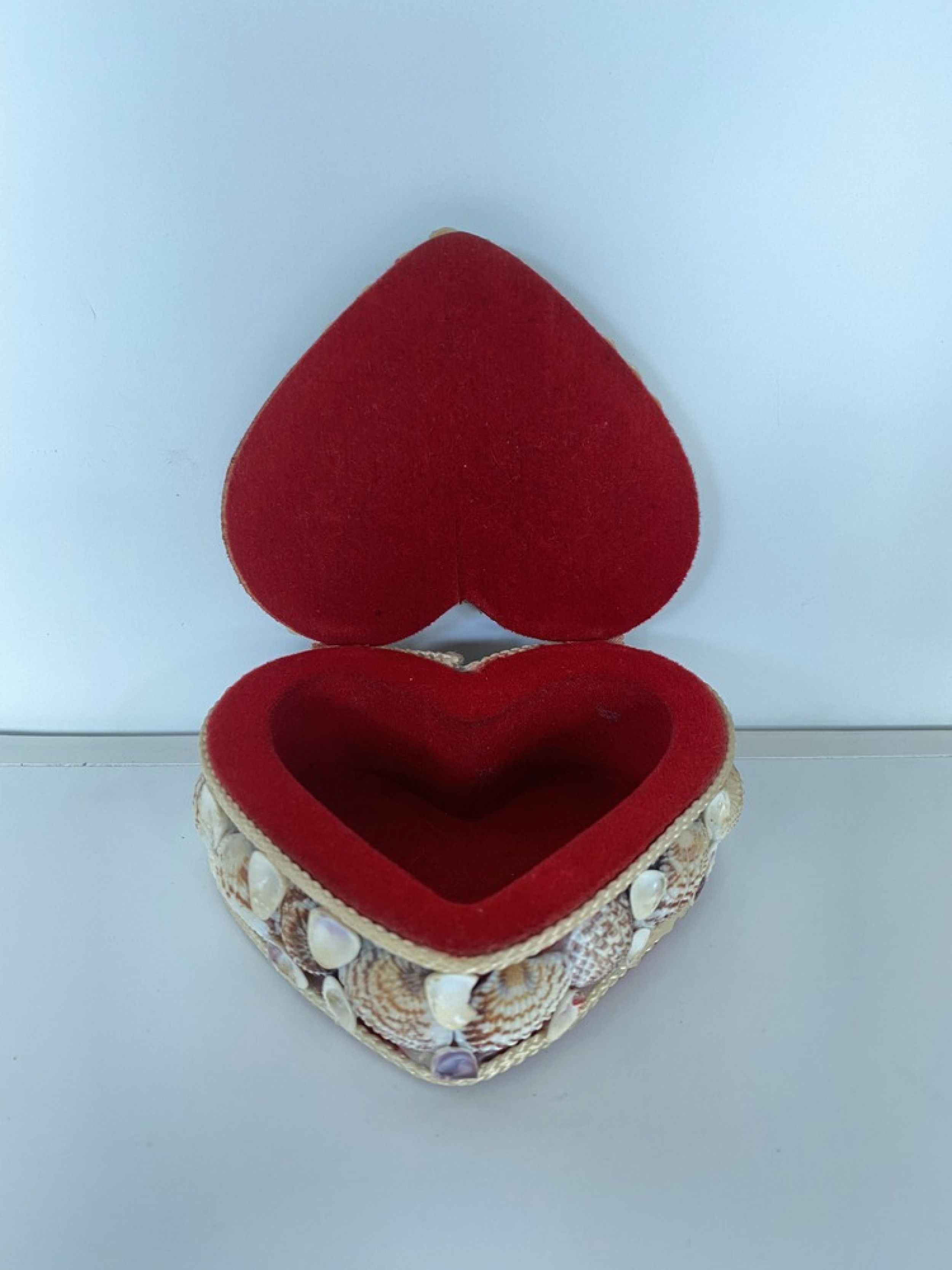 Contemporary American Modern heart shaped jewelry box, with an applied seashell exterior and red velvet interior.