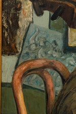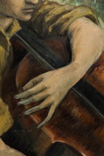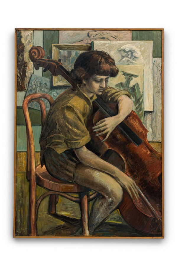 Contemporary American oil on board featuring a young cellist conveying a sense of melancholy through the muted palette in a cluttered studio in a plain wood frame ( (ROBERT SPRINGFELS) (Titled: Composition #35).