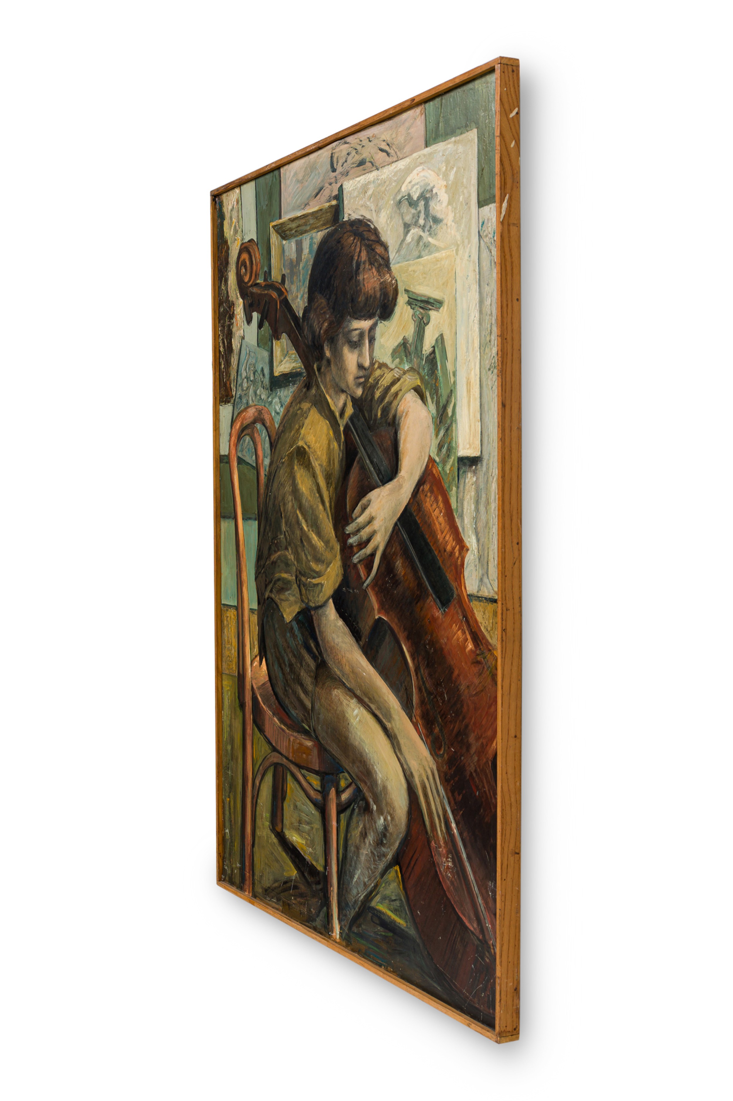 Contemporary American oil on board featuring a young cellist conveying a sense of melancholy through the muted palette in a cluttered studio in a plain wood frame ( (ROBERT SPRINGFELS) (Titled: Composition #35)