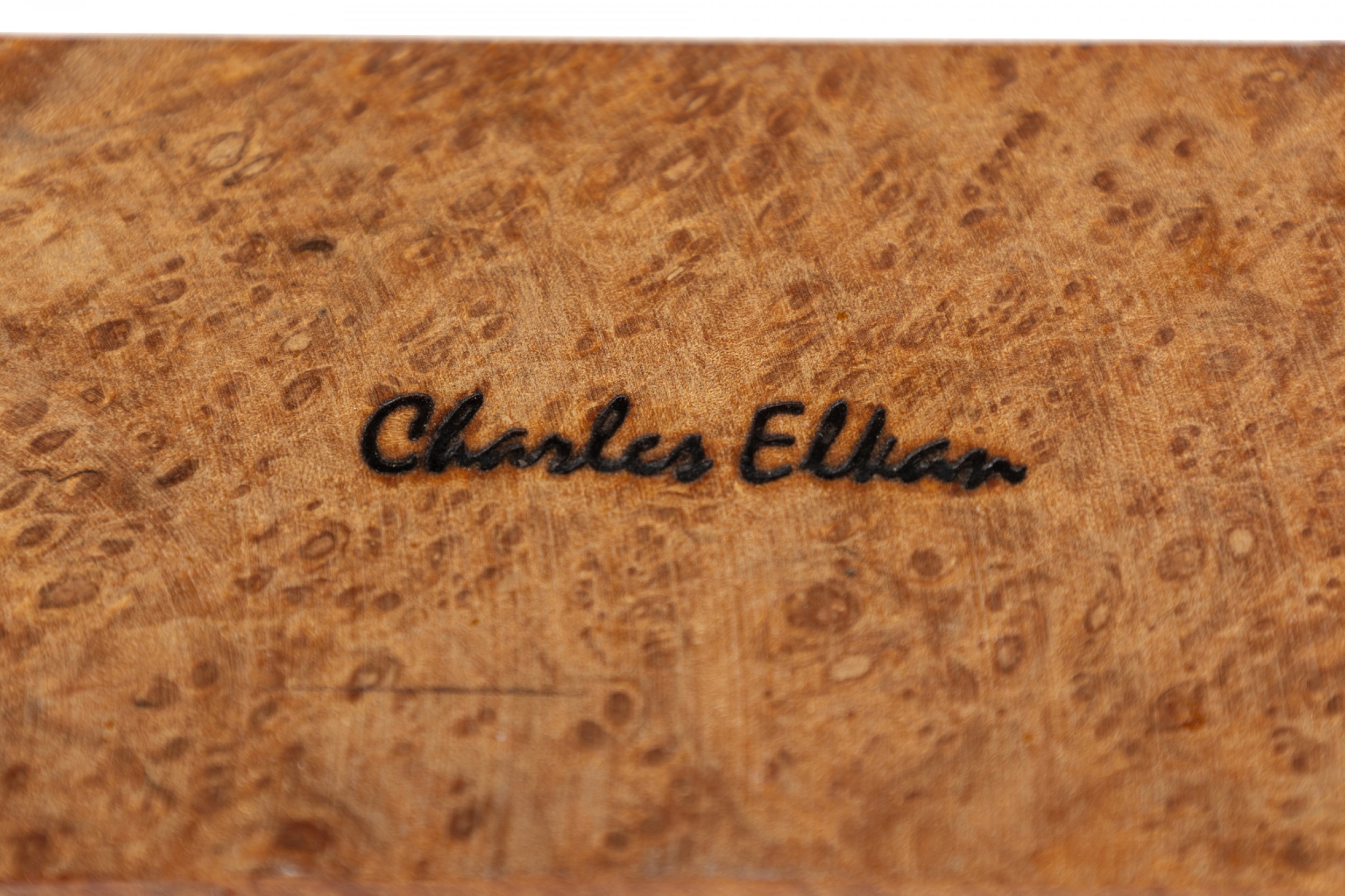 Contemporary American decorative maple burl box with an oiled and waxed finish plus a fitted lid and slightly irregular rectangular form. (Signed on the bottom by Charles Elkan)..