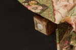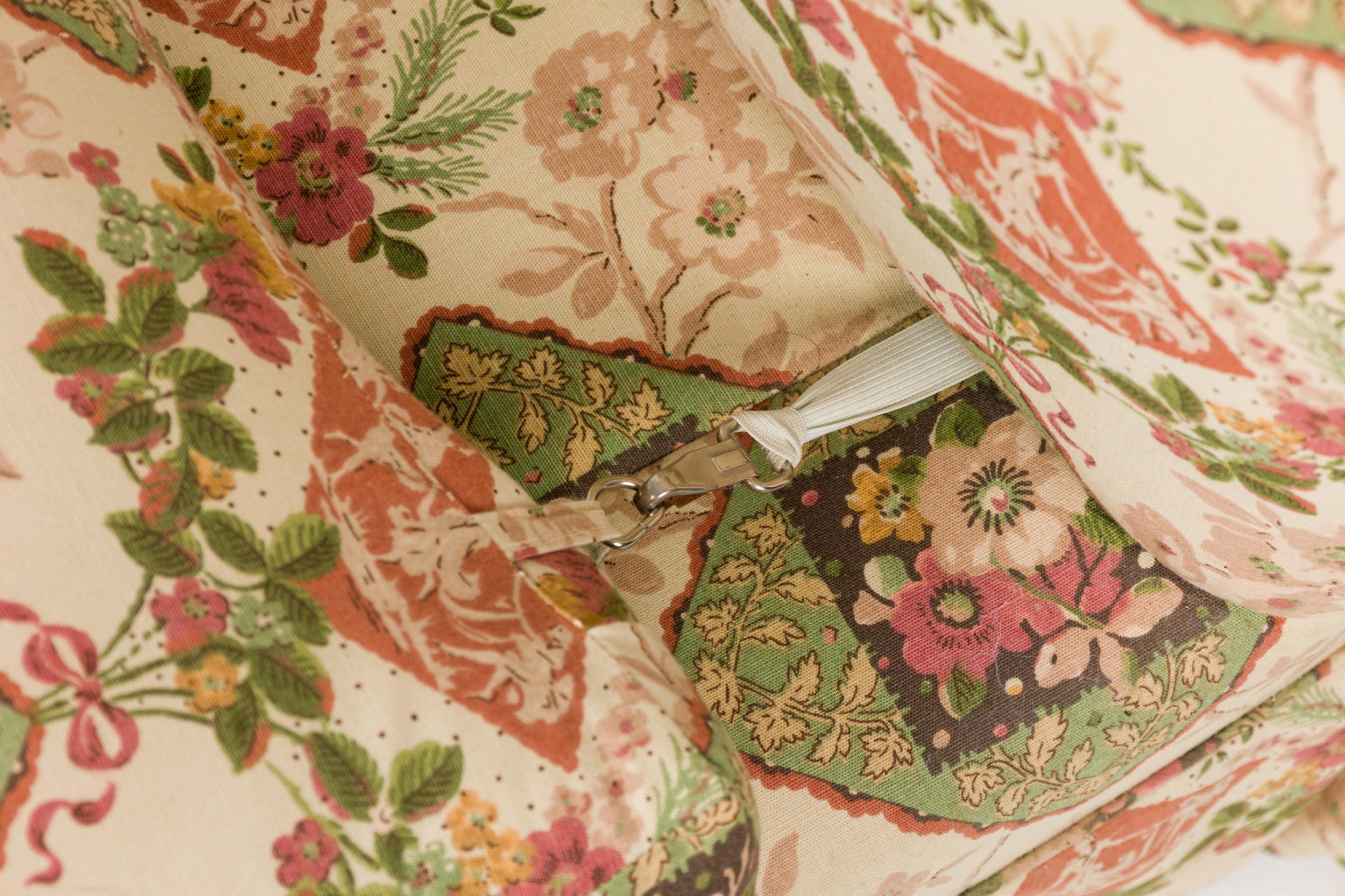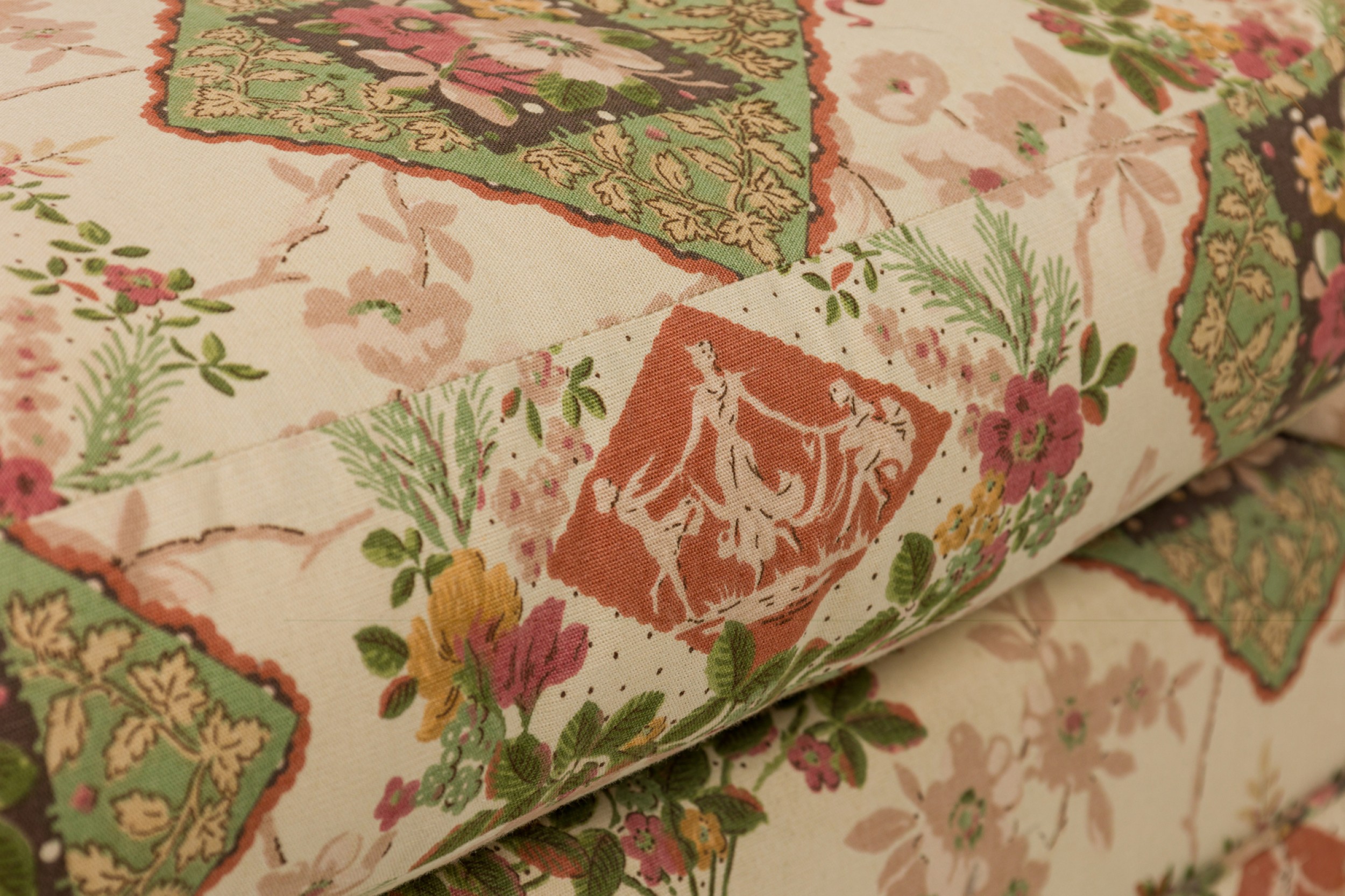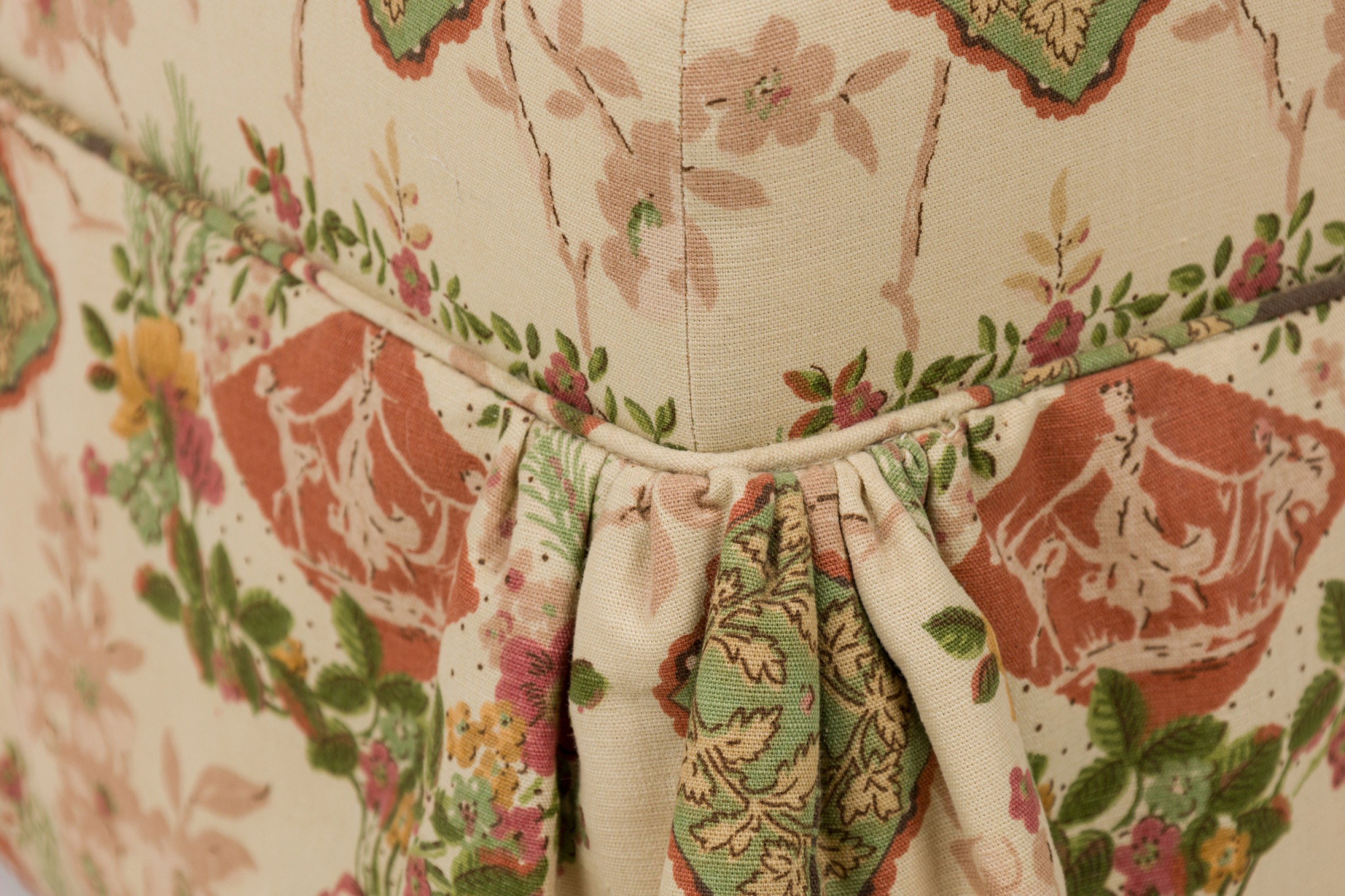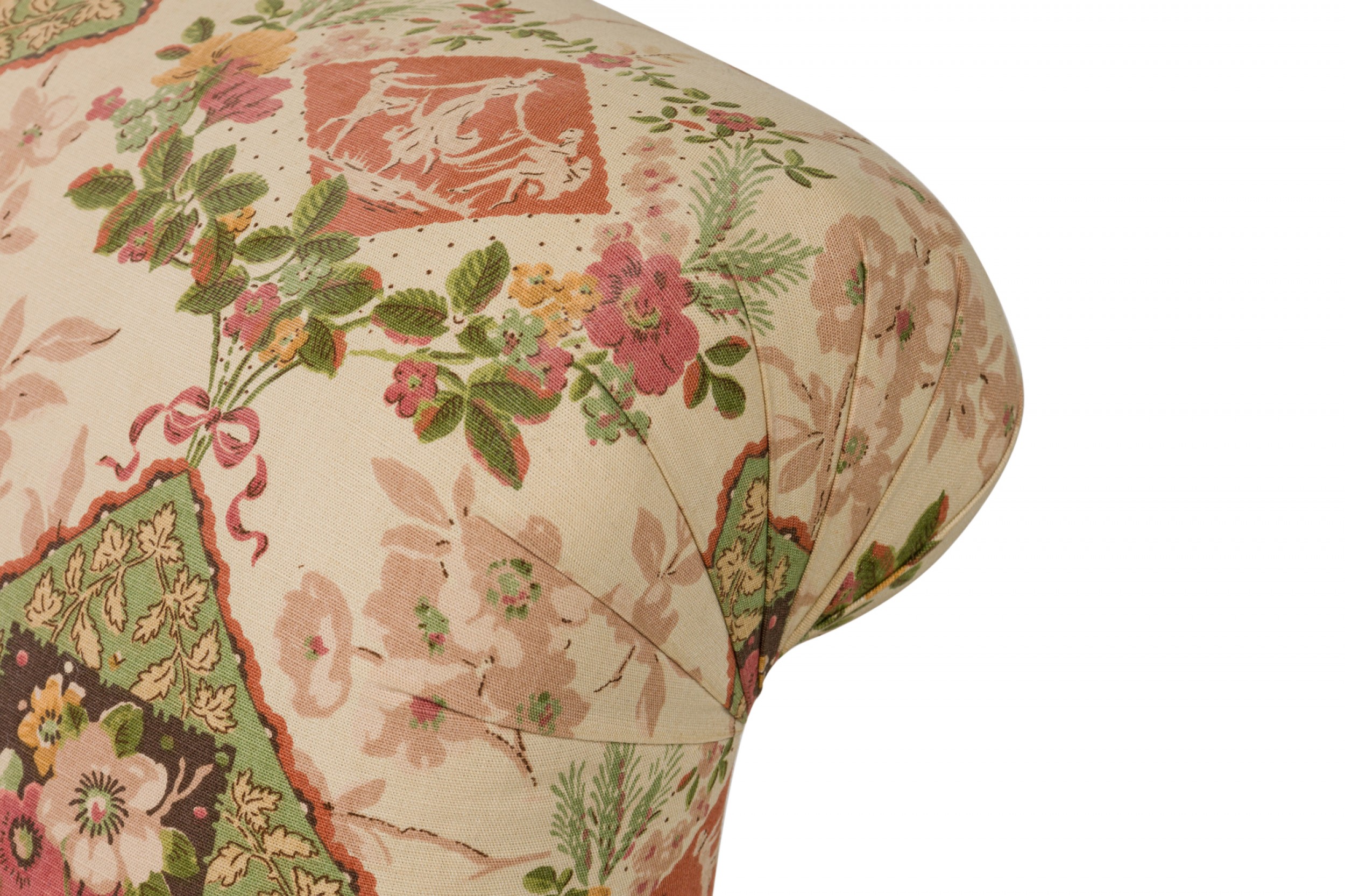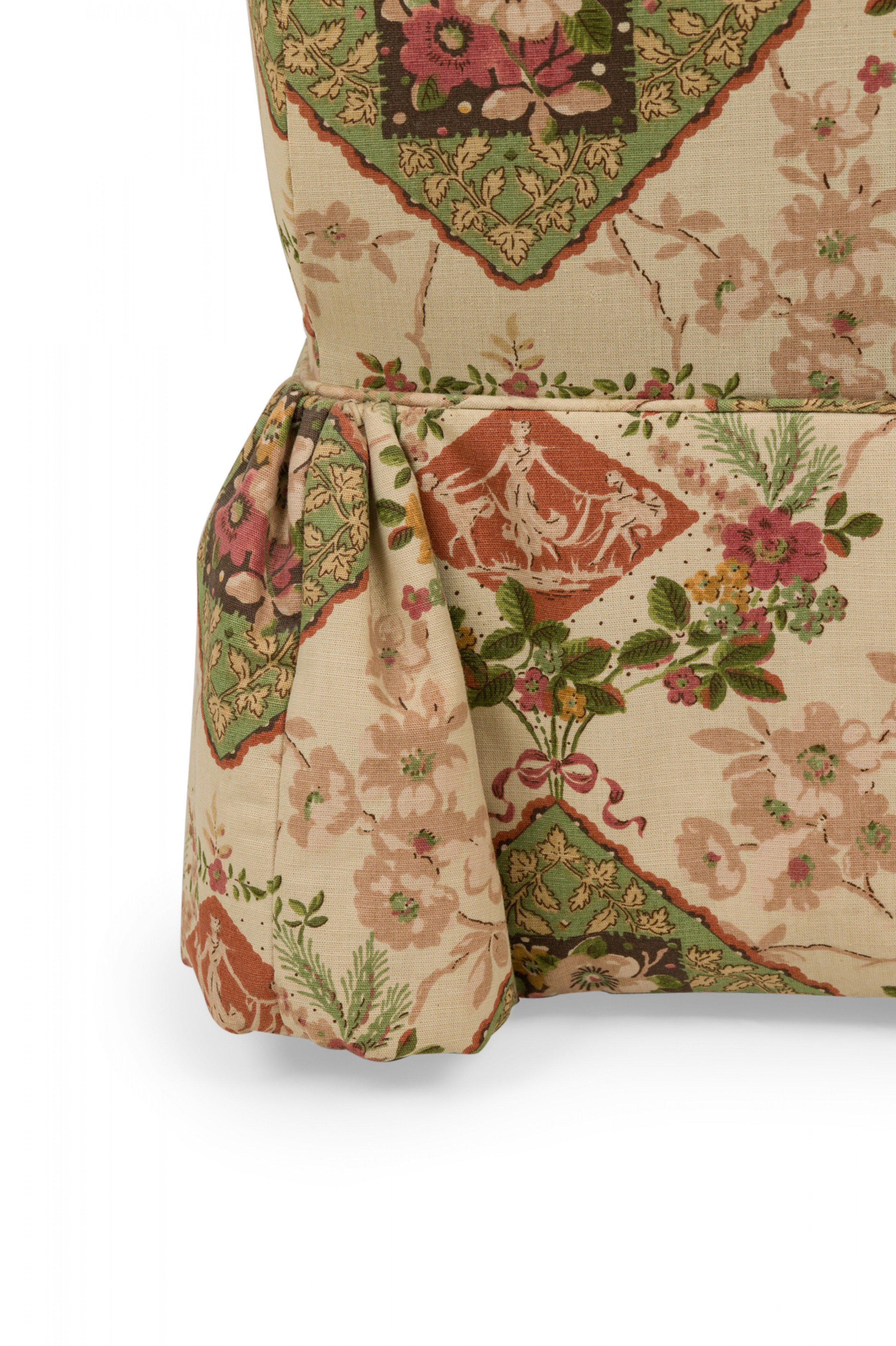 Contemporary slipper chair with beige, green and pink upholstery and skirt featuring floral patterns and figural silhouettes.