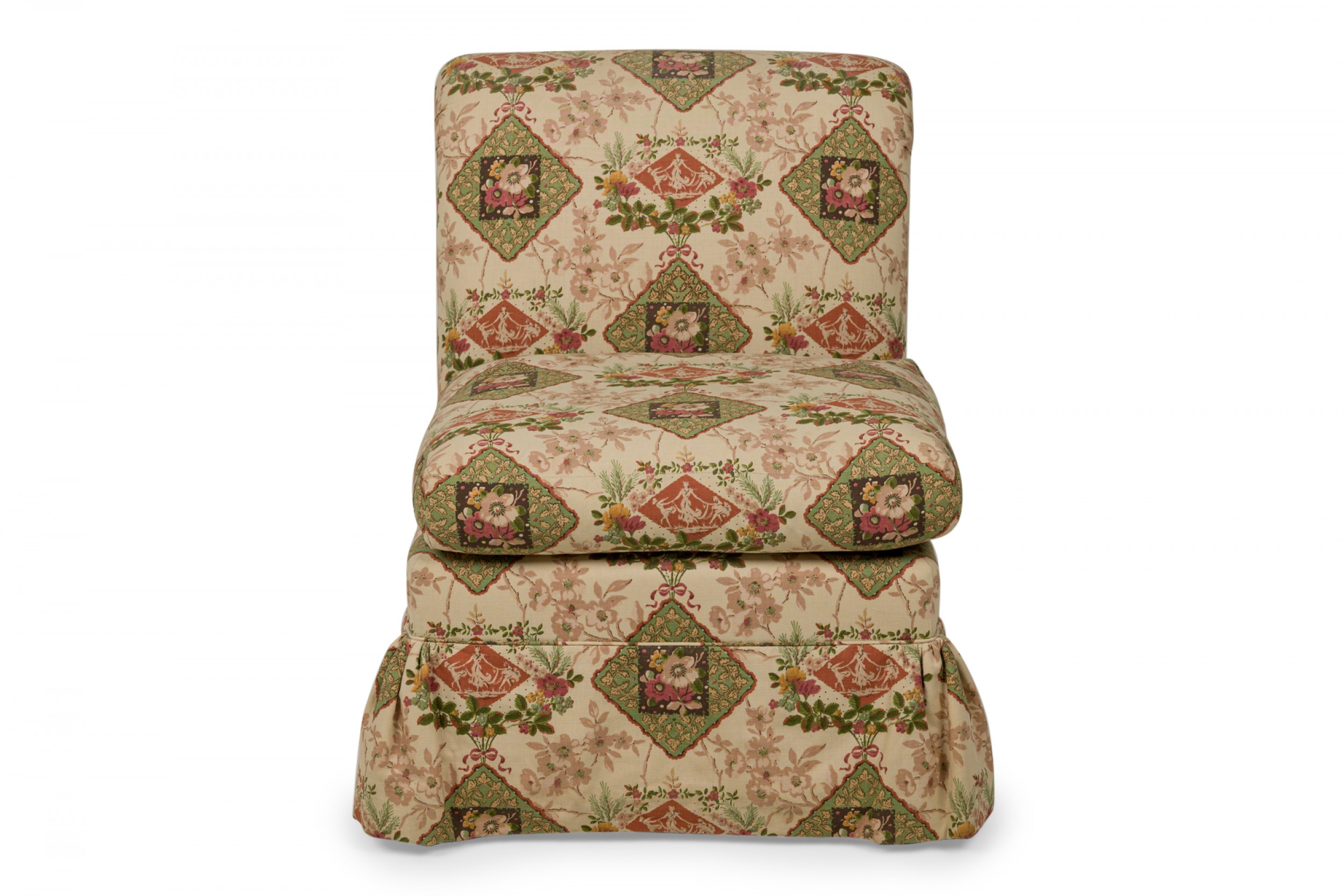 Contemporary slipper chair with beige, green and pink upholstery and skirt featuring floral patterns and figural silhouettes..