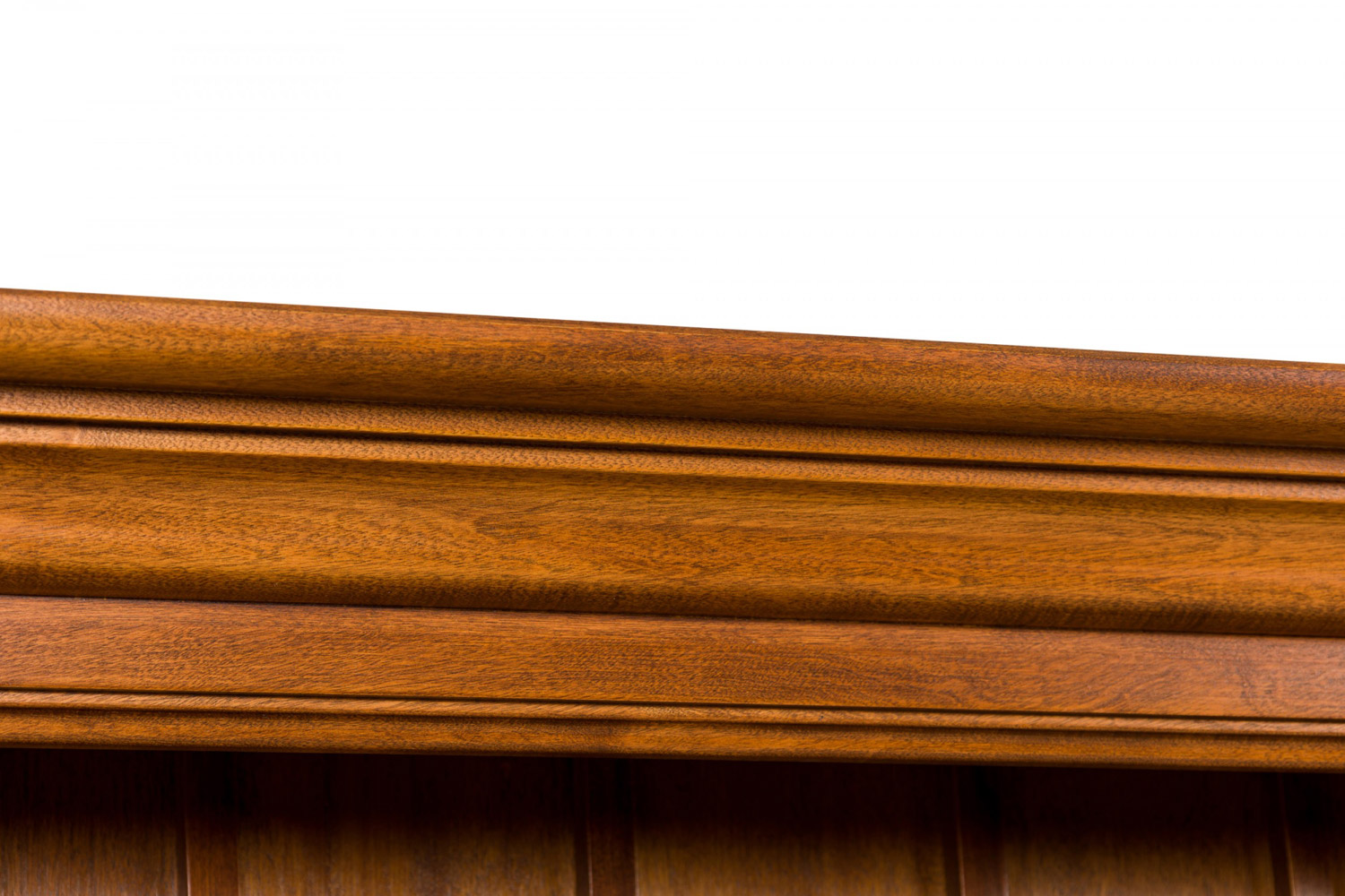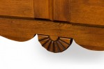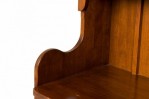 Contemporary birch wood hutch / cabinet with an upper section with a pediment top containing three open shelves above a lower enclosed two-door cabinet compartment containing a single dividing shelf, with turned wood door pulls, small carved decorations, and brass hinges and hardware, resting on four carved square feet connected by a small decorative apron.