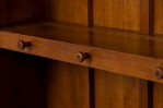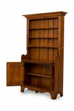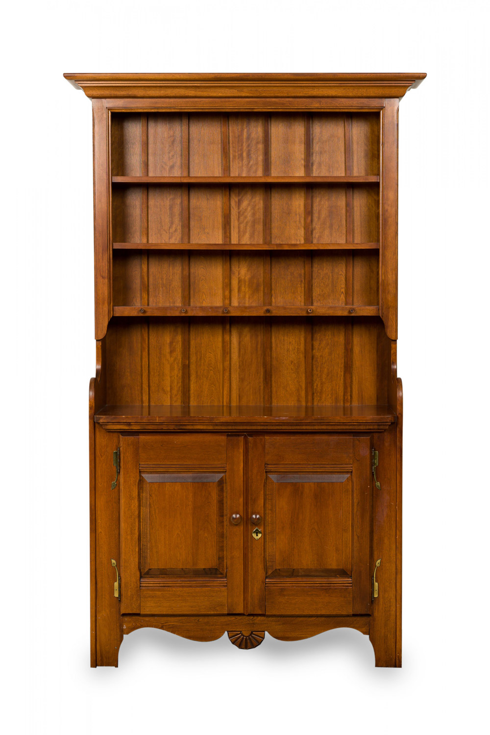 Contemporary birch wood hutch / cabinet with an upper section with a pediment top containing three open shelves above a lower enclosed two-door cabinet compartment containing a single dividing shelf, with turned wood door pulls, small carved decorations, and brass hinges and hardware, resting on four carved square feet connected by a small decorative apron..