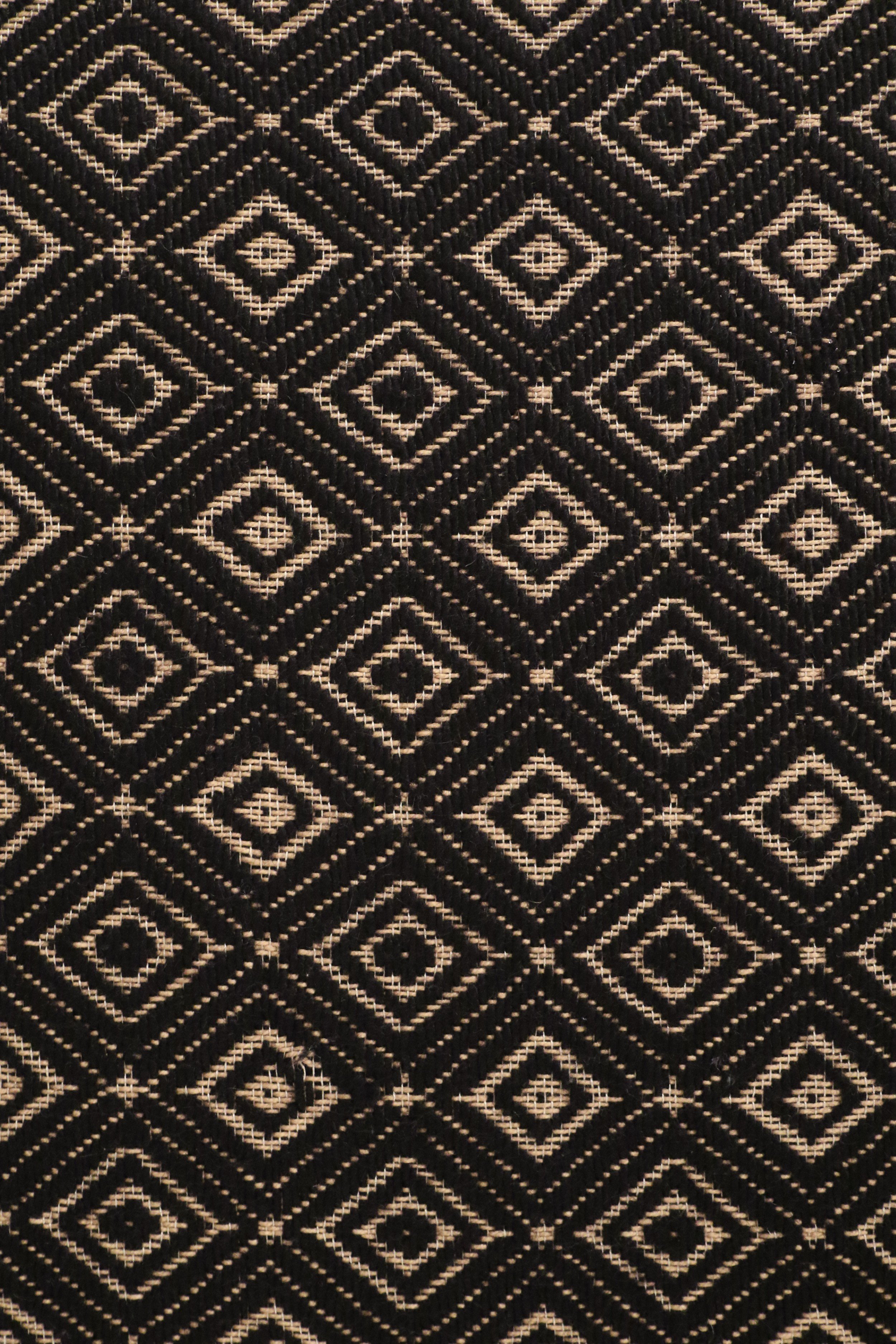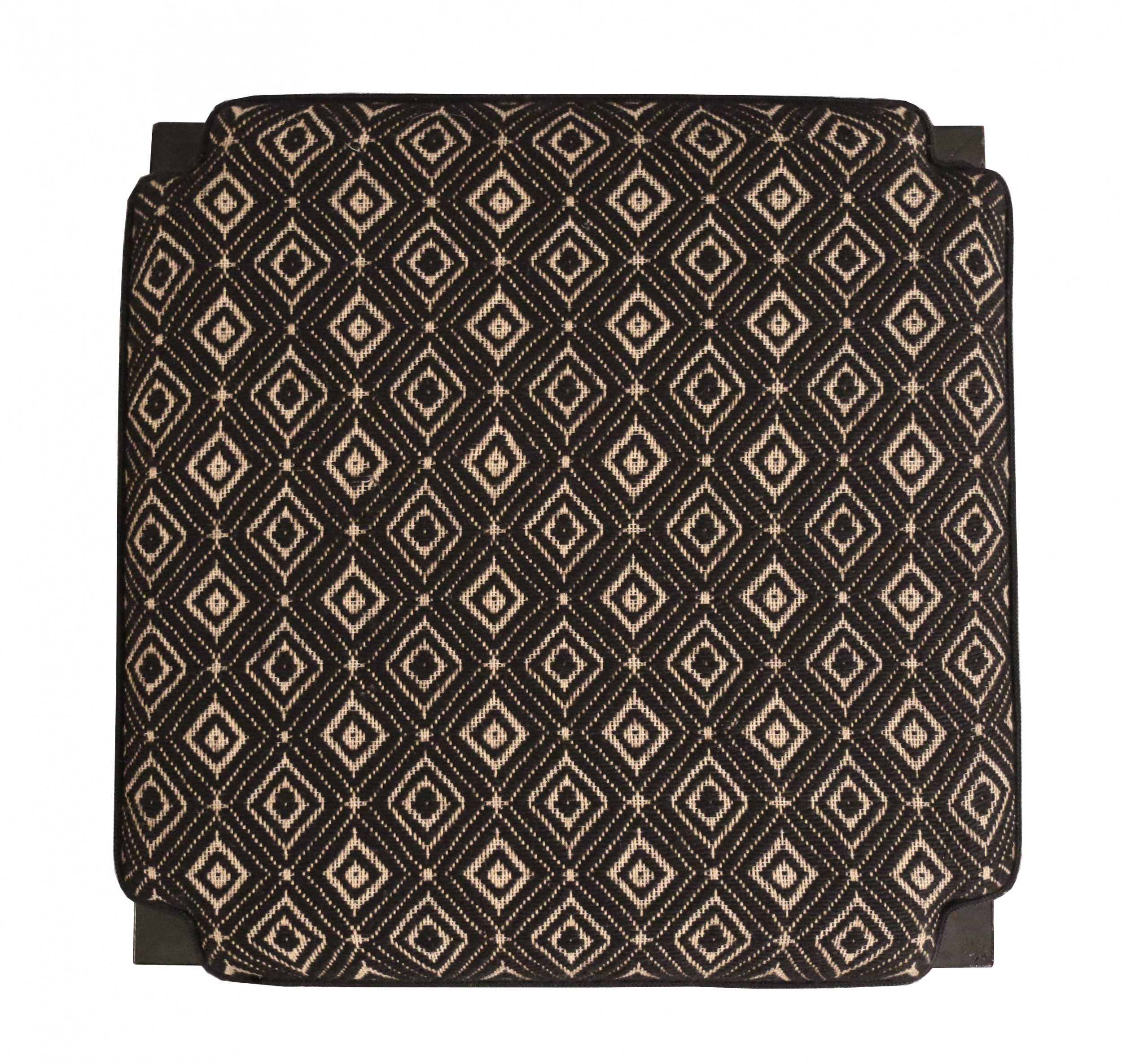 4 Contemporary square footstools with shaped black lacquered legs and a black and beige patterned tapestry upholstered top cushion. (PRICED EACH)