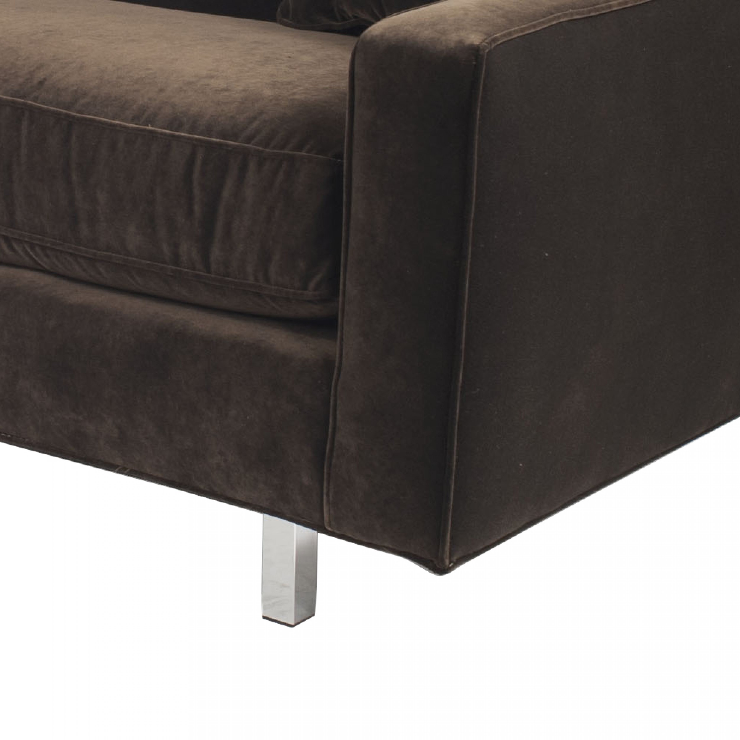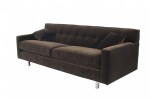 Contemporary chocolate brown velvet sofa with chrome plated rectangular legs, two seat cushions, a button tufted back, and two matching throw pillows.