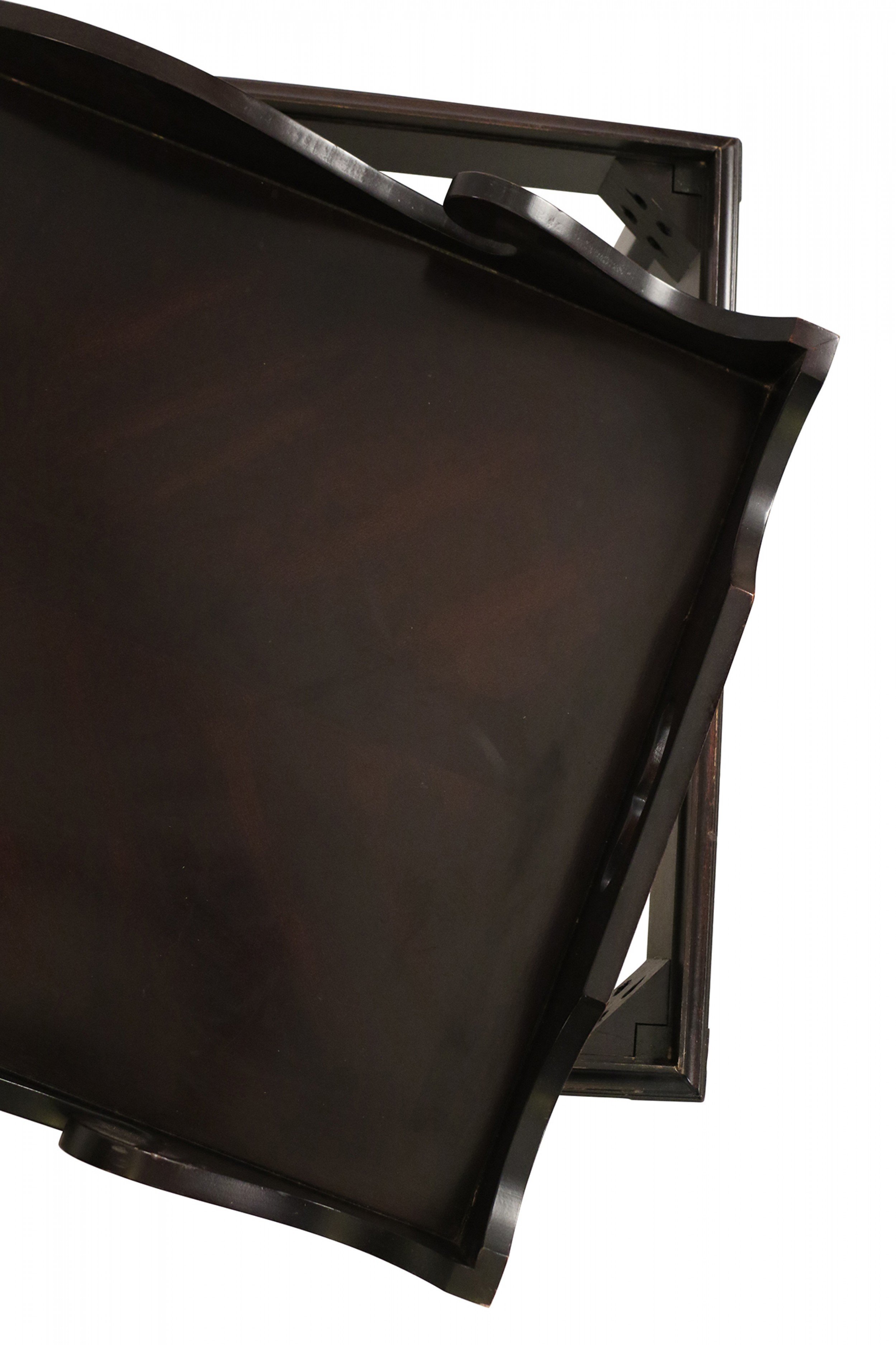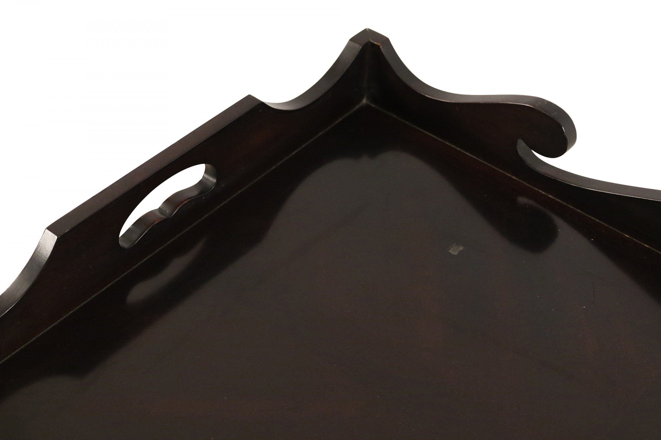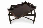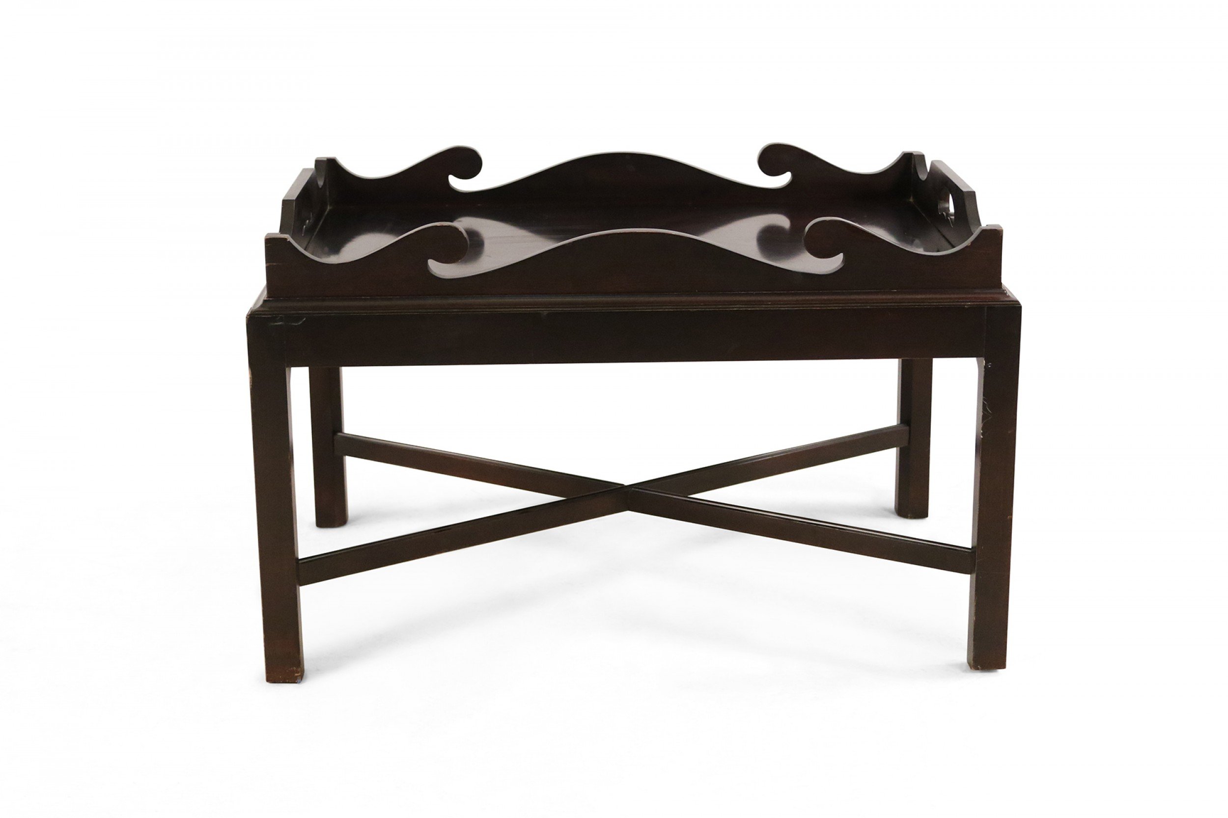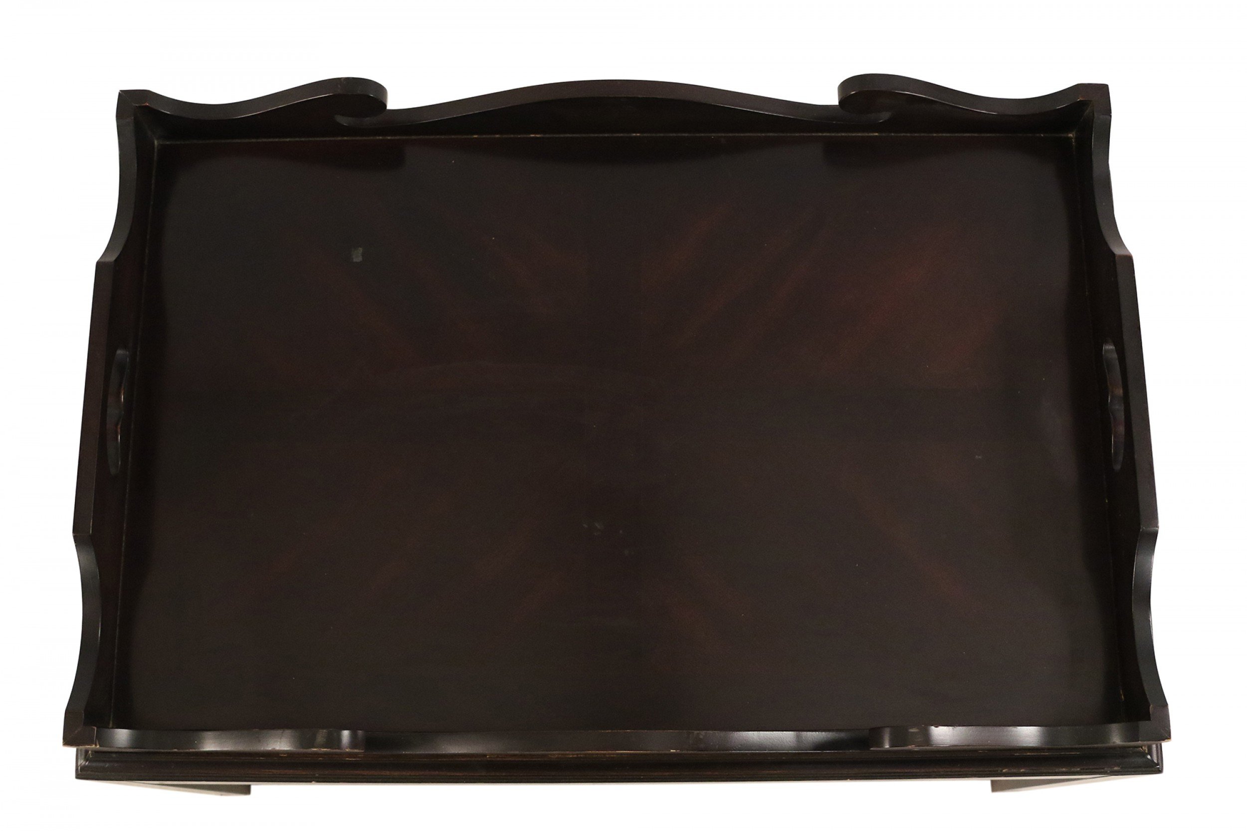 Contemporary mahogany tray top coffee table with 3" decorative gallery with two cut out handles and an espresso brown finish. (table height without tray: 20")