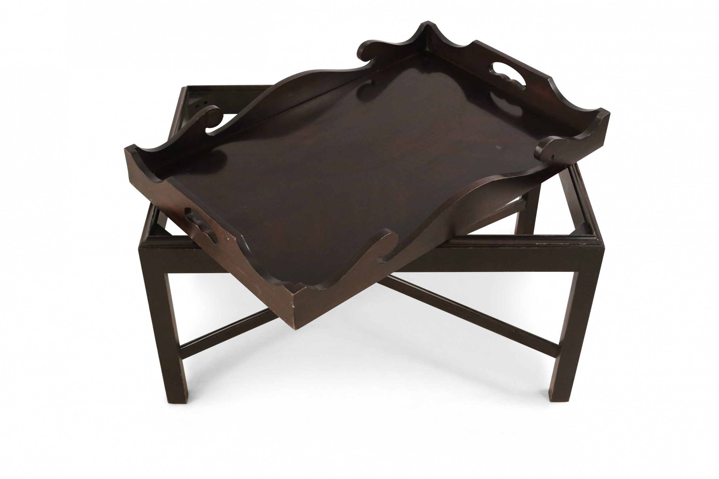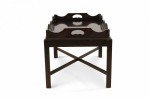 Contemporary mahogany tray top coffee table with 3" decorative gallery with two cut out handles and an espresso brown finish. (table height without tray: 20").