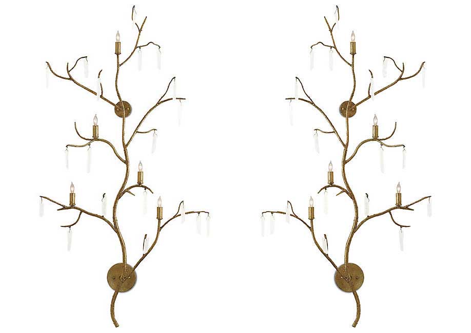 PAIR of Contemporary design large gilt metal wall sconces with five lights, a tree branch shape, and decorative hanging pieces of clear quartz (PRICED AS PAIR)
