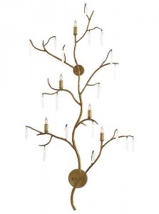 PAIR of Contemporary design large gilt metal wall sconces with five lights, a tree branch shape, and decorative hanging pieces of clear quartz (PRICED AS PAIR).