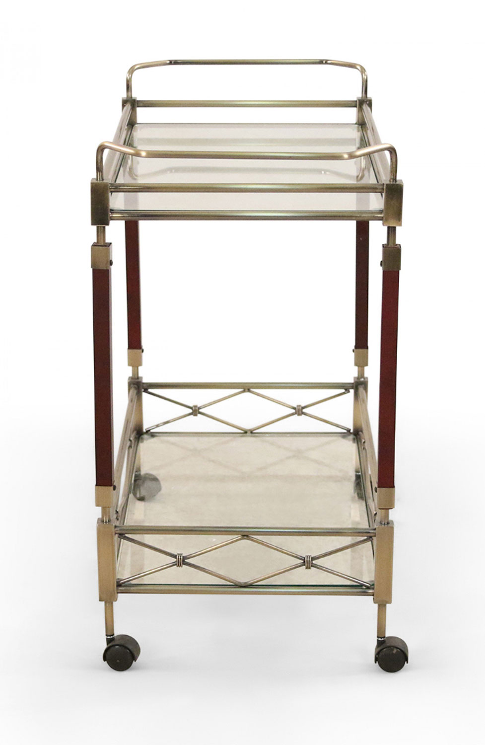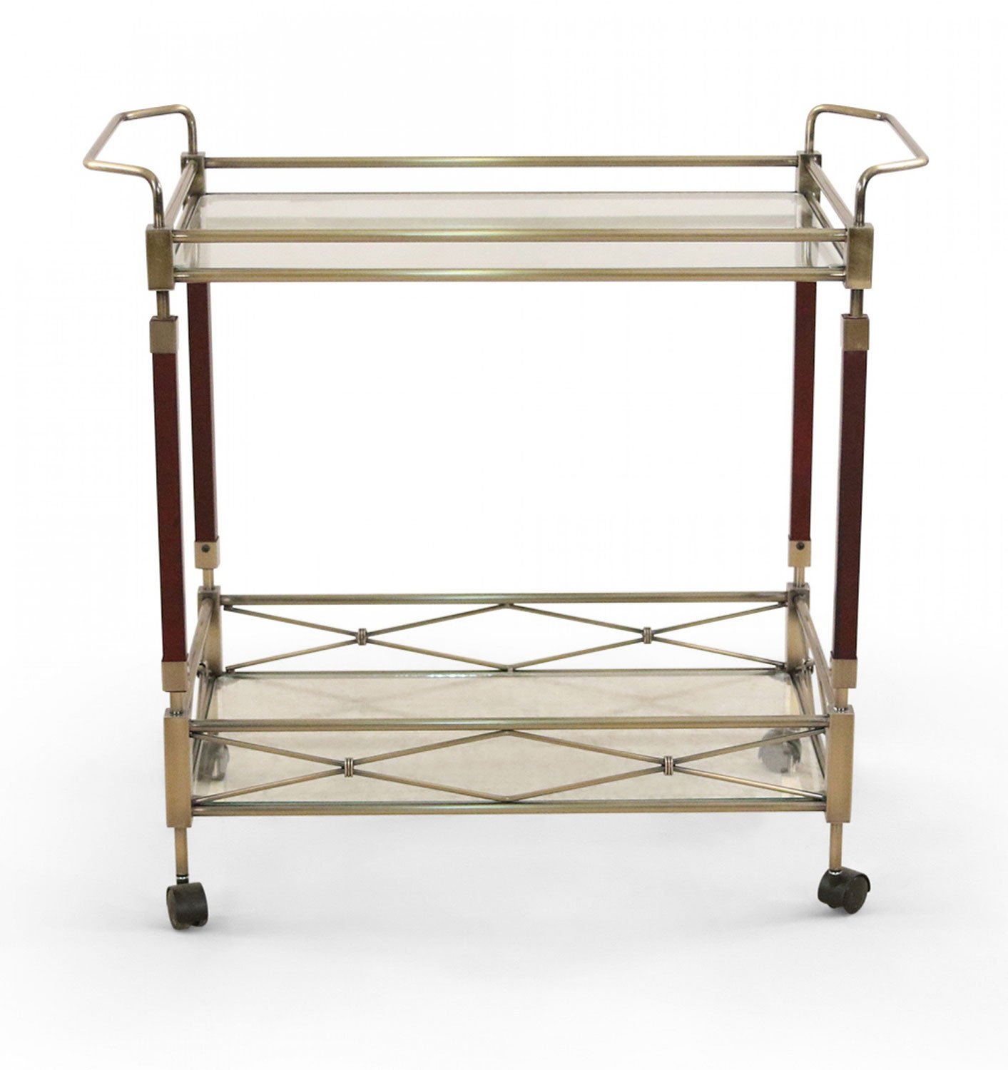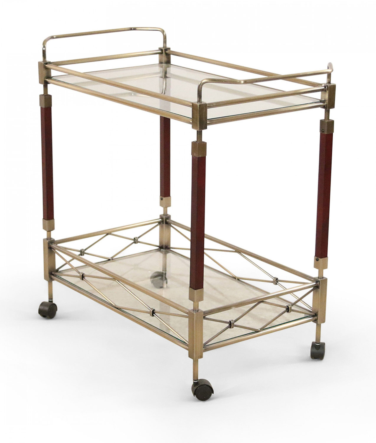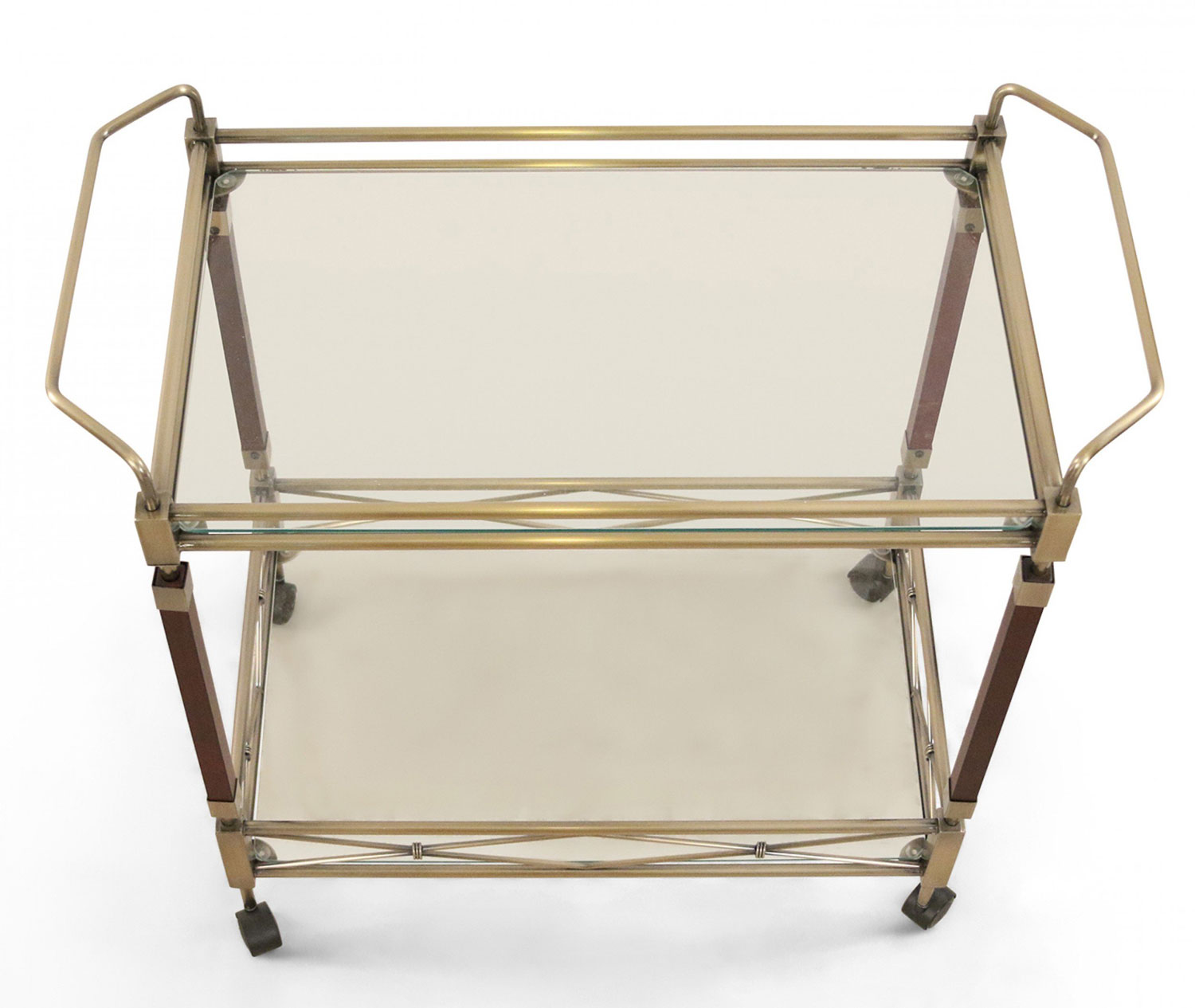 Contemporary bar/tea cart with a brushed brass frame with partially square wooden legs and two glass shelves..