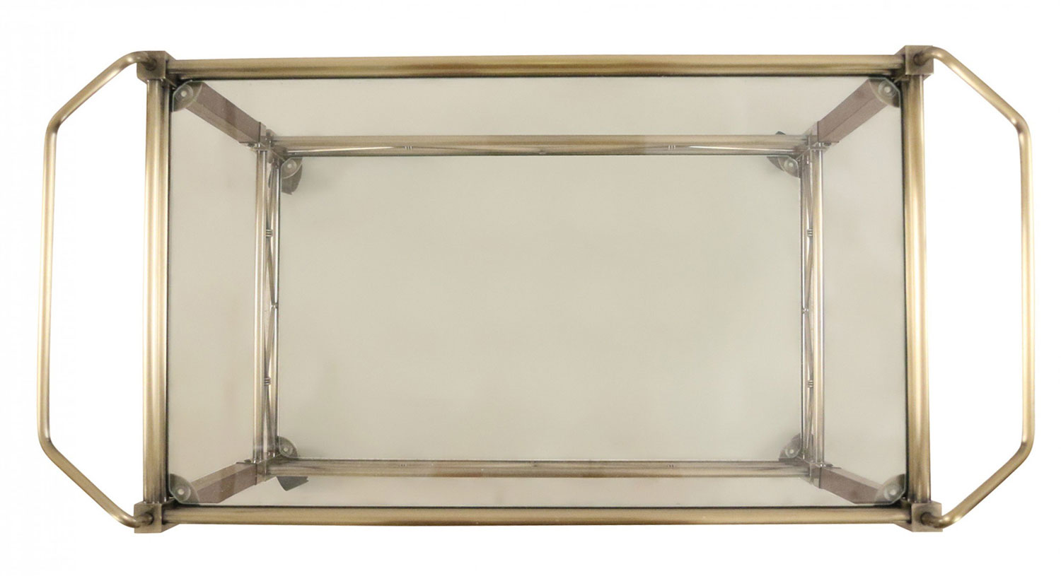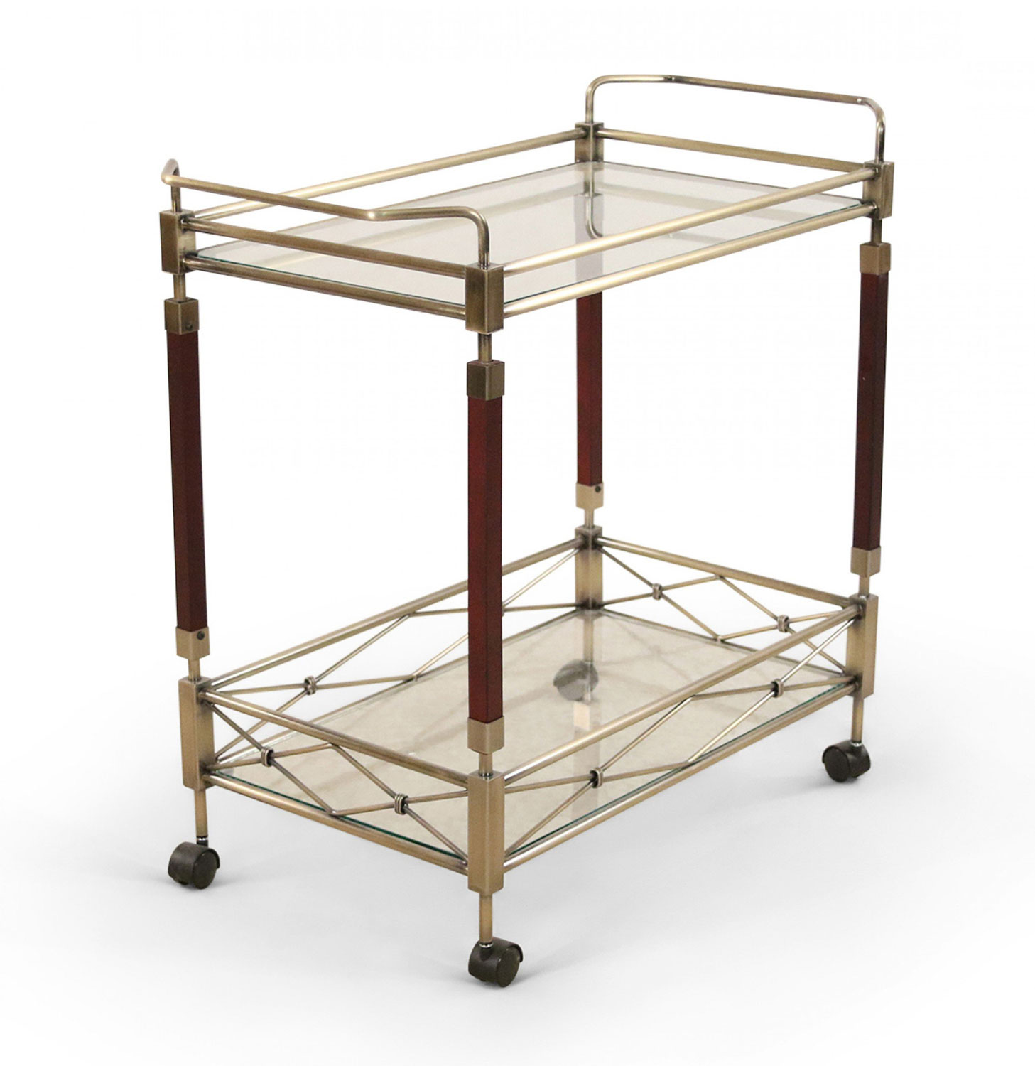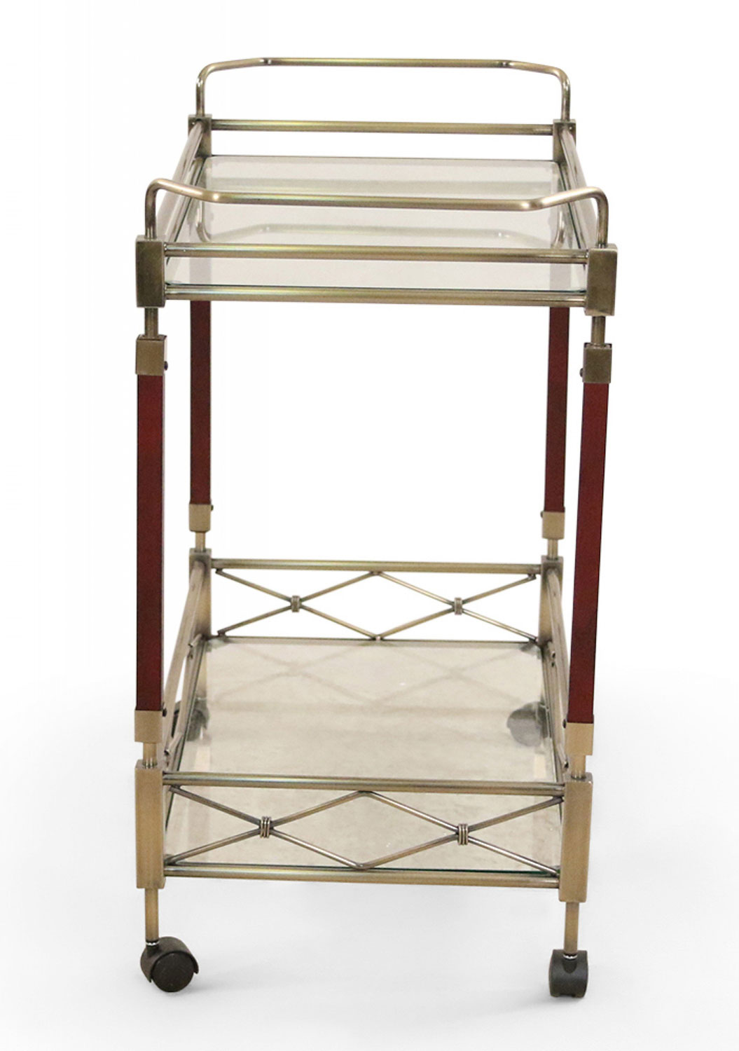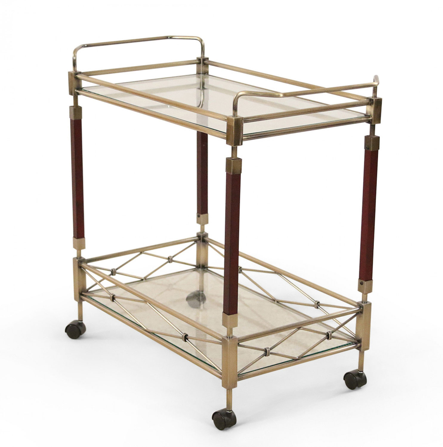 Contemporary bar/tea cart with a brushed brass frame with partially square wooden legs and two glass shelves..
