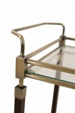 Contemporary bar/tea cart with a brushed brass frame with partially square wooden legs and two glass shelves.