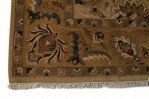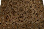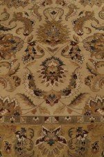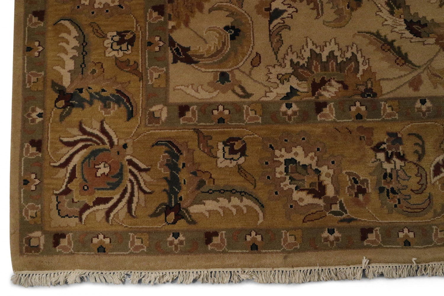 Middle Eastern Turkish style rectangular area rug with gold, beige, and brown pattern with a border and beige fringe (8.75' x 12')