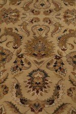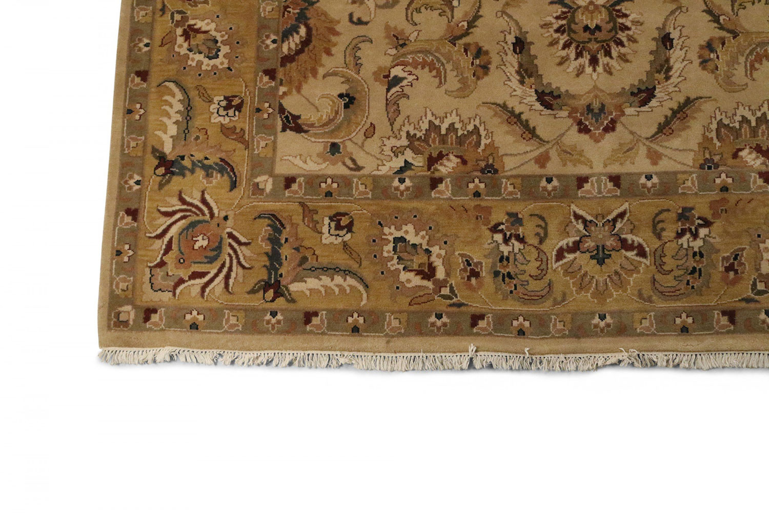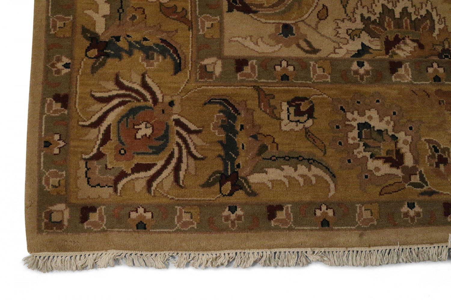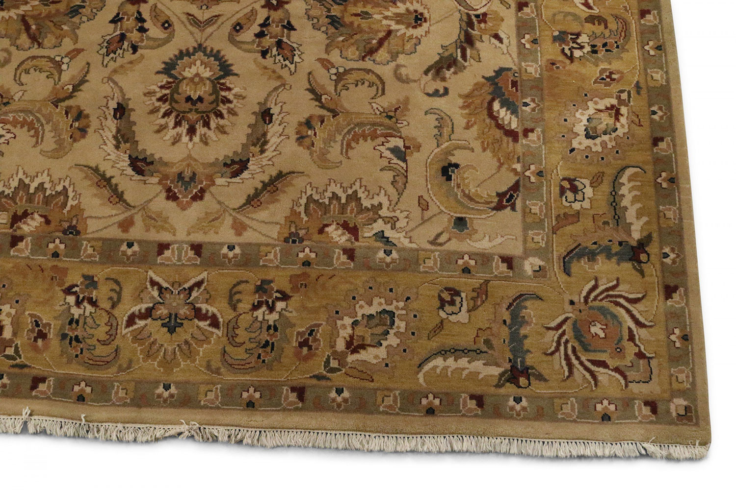 Middle Eastern Turkish style rectangular area rug with gold, beige, and brown pattern with a border and beige fringe (8.75' x 12').