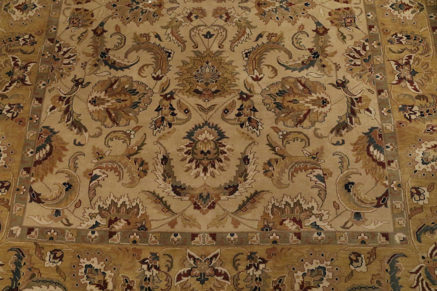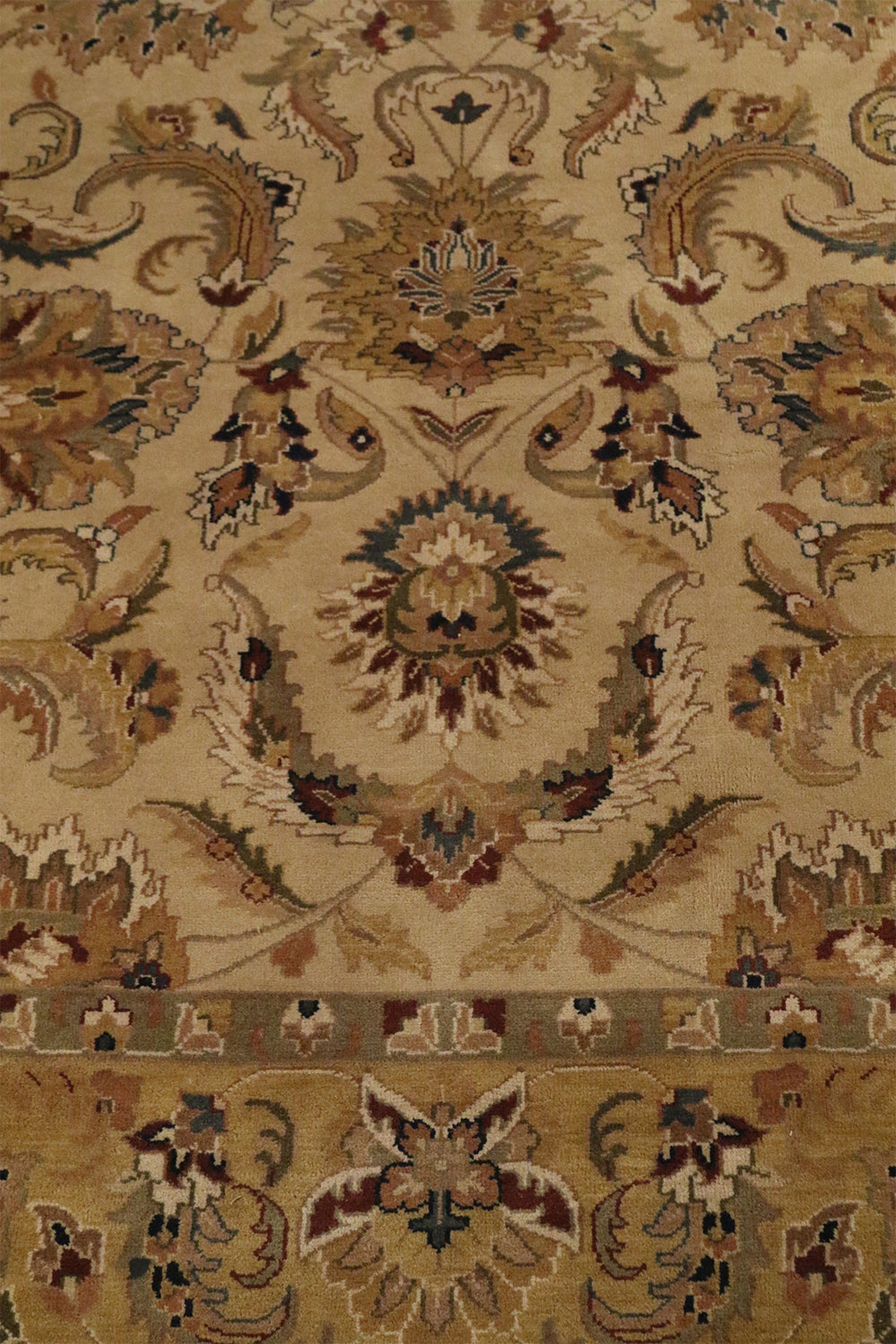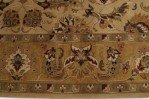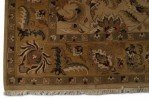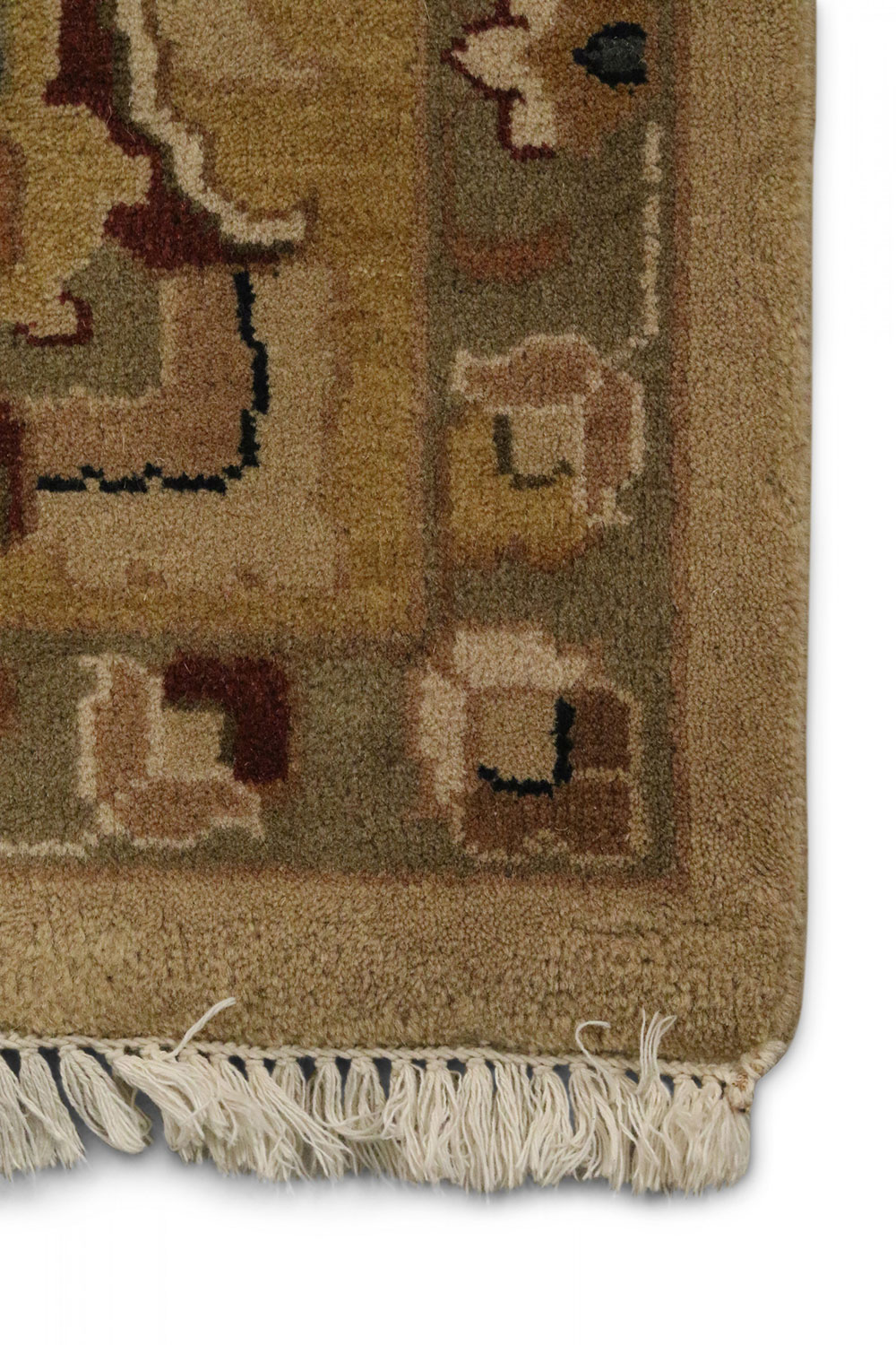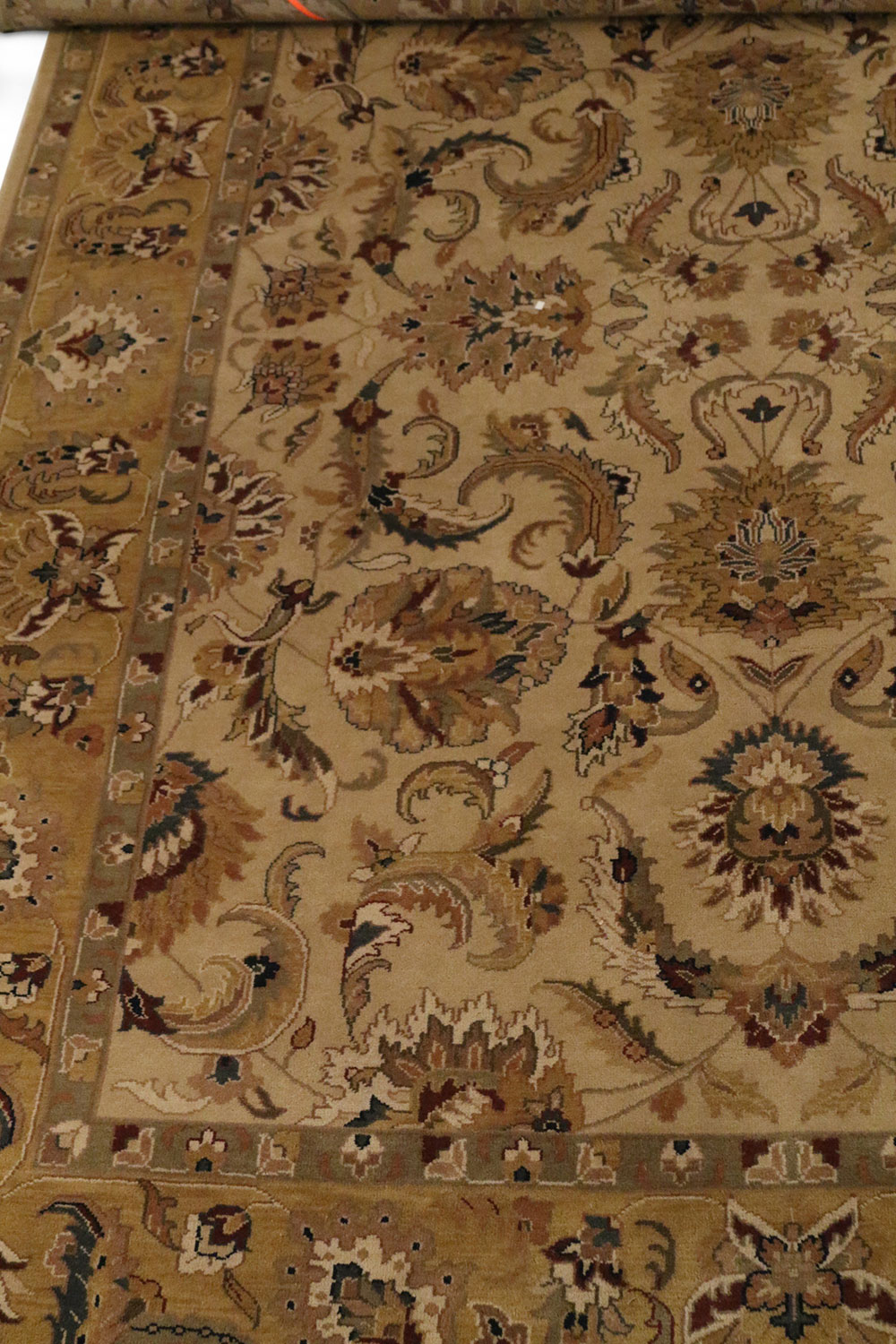 Middle Eastern Turkish style rectangular area rug with gold, beige, and brown pattern with a border and beige fringe (8.75' x 12').