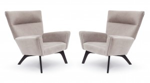 4 Contemporary oversize easy chairs with gray leather upholstery and black tapered legs (PRICED EACH).