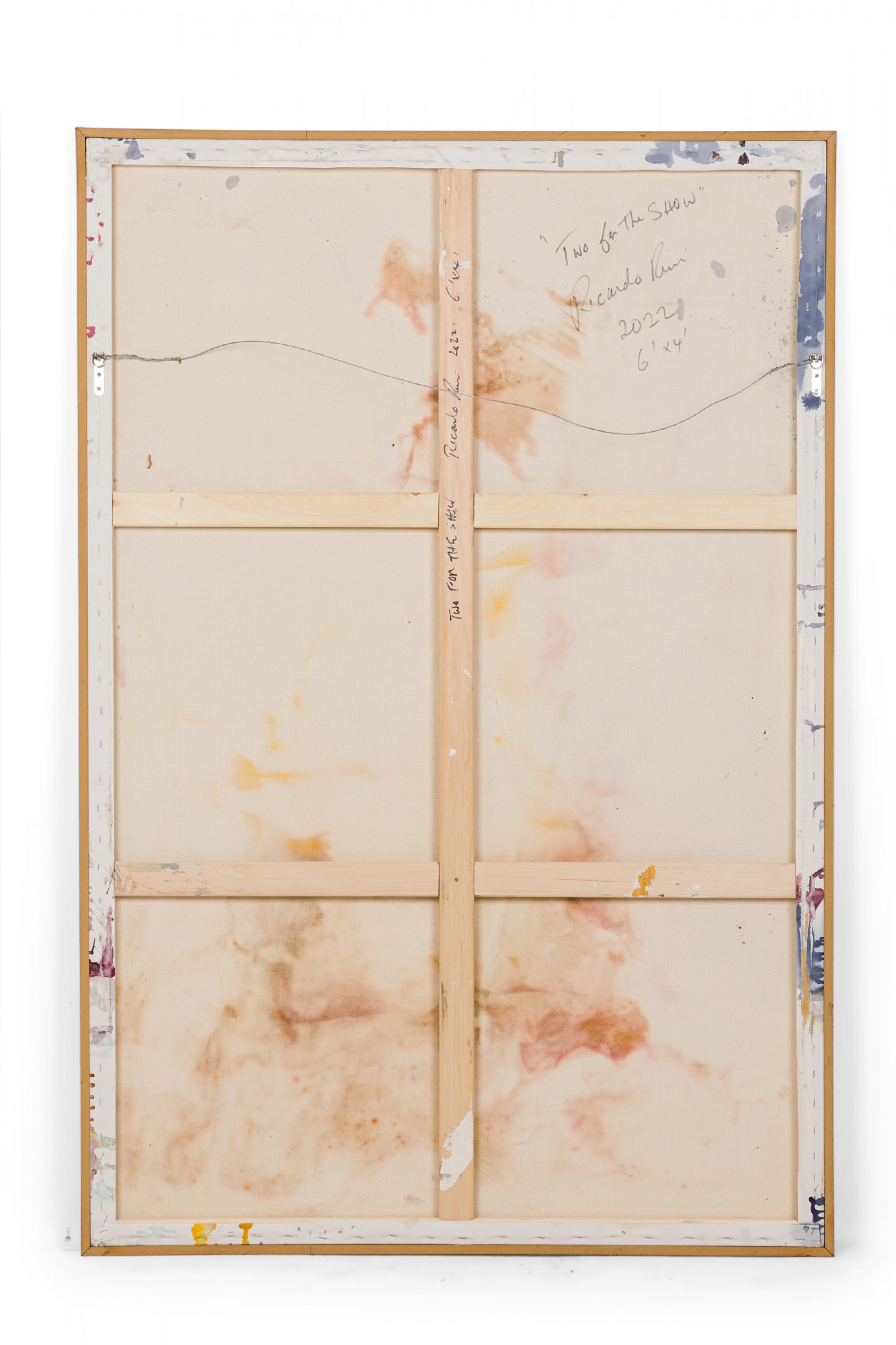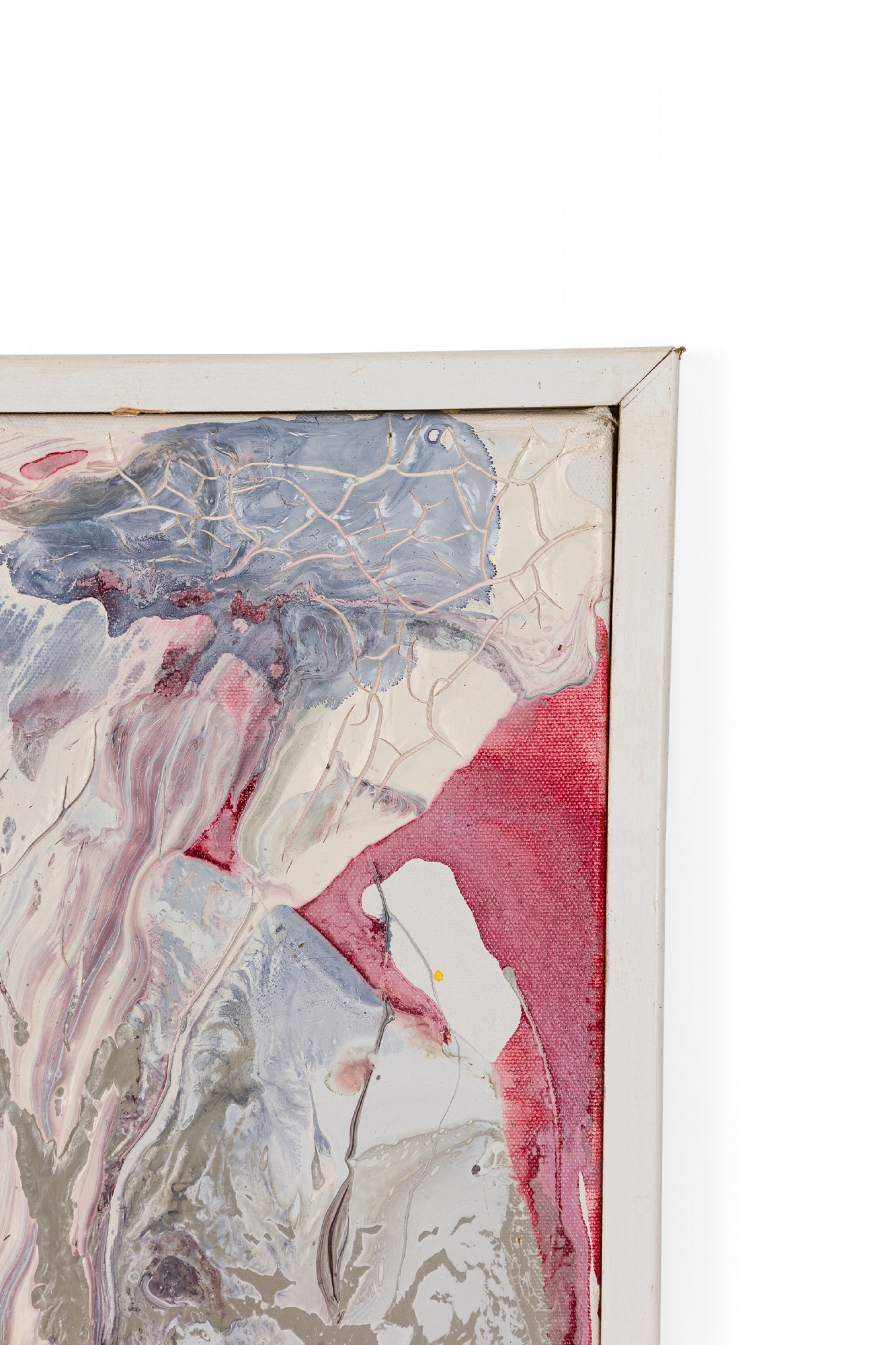 Contemporary abstract multicolored painting featuring thick brushstrokes in gray, white, yellow, and red on stretched canvas in a white wooden frame. ("Two for the Show," RICARDO RUMI)(Companion piece: NWL6779)