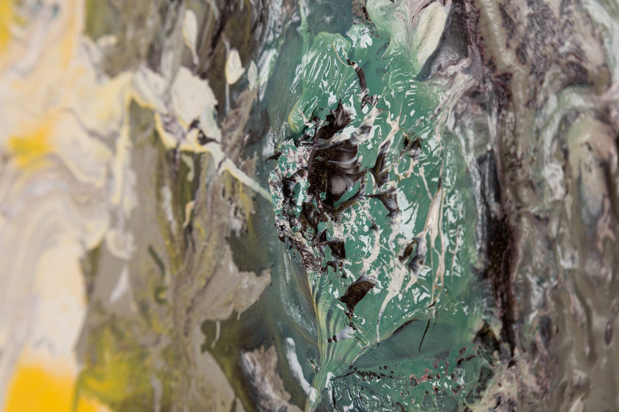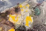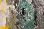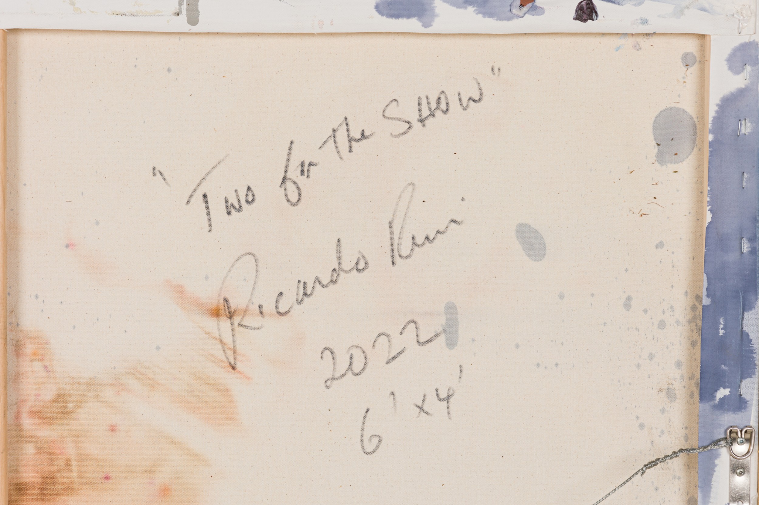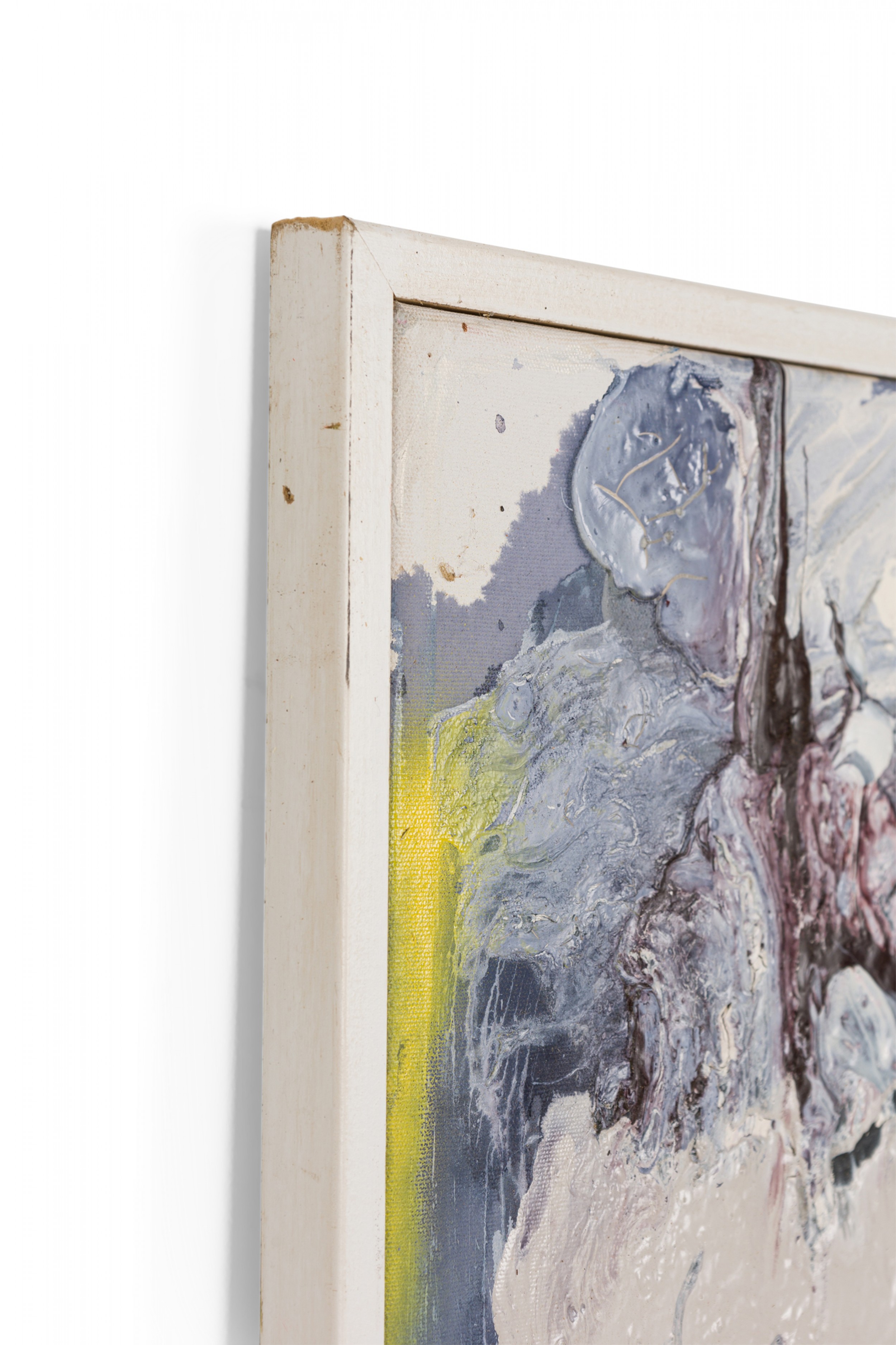 Contemporary abstract multicolored painting featuring thick brushstrokes in gray, white, yellow, and red on stretched canvas in a white wooden frame. ("Two for the Show," RICARDO RUMI)(Companion piece: NWL6779).