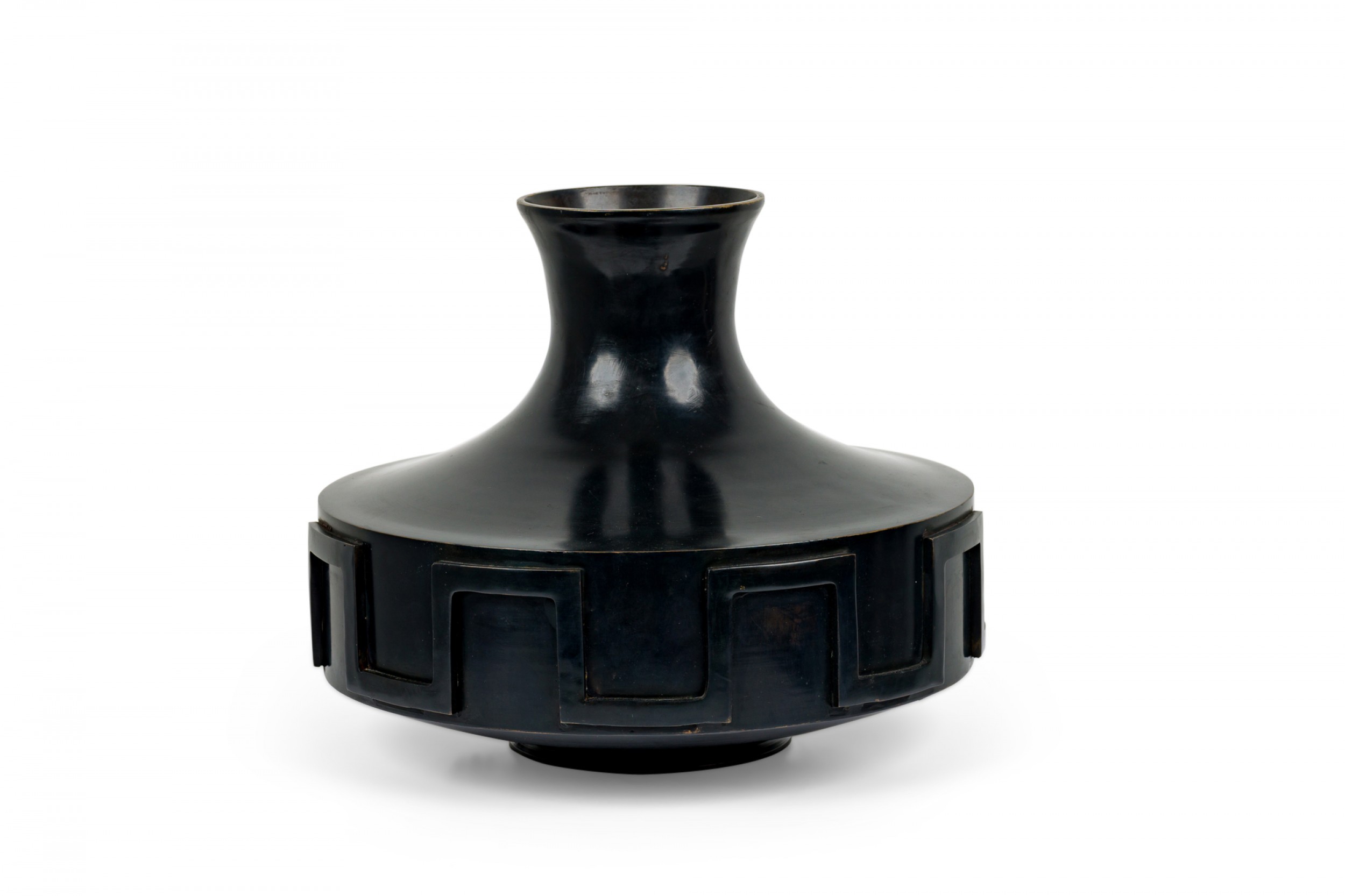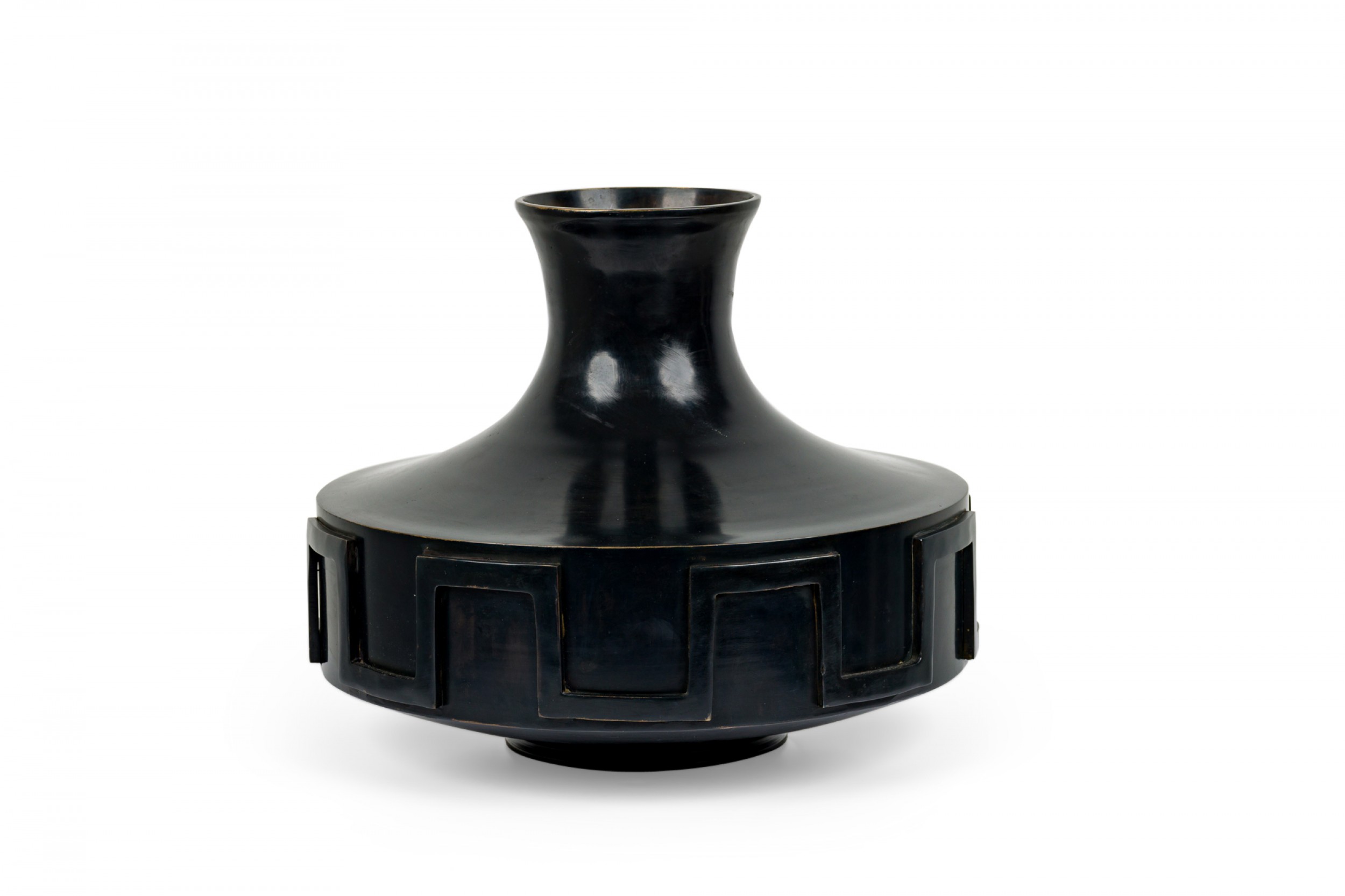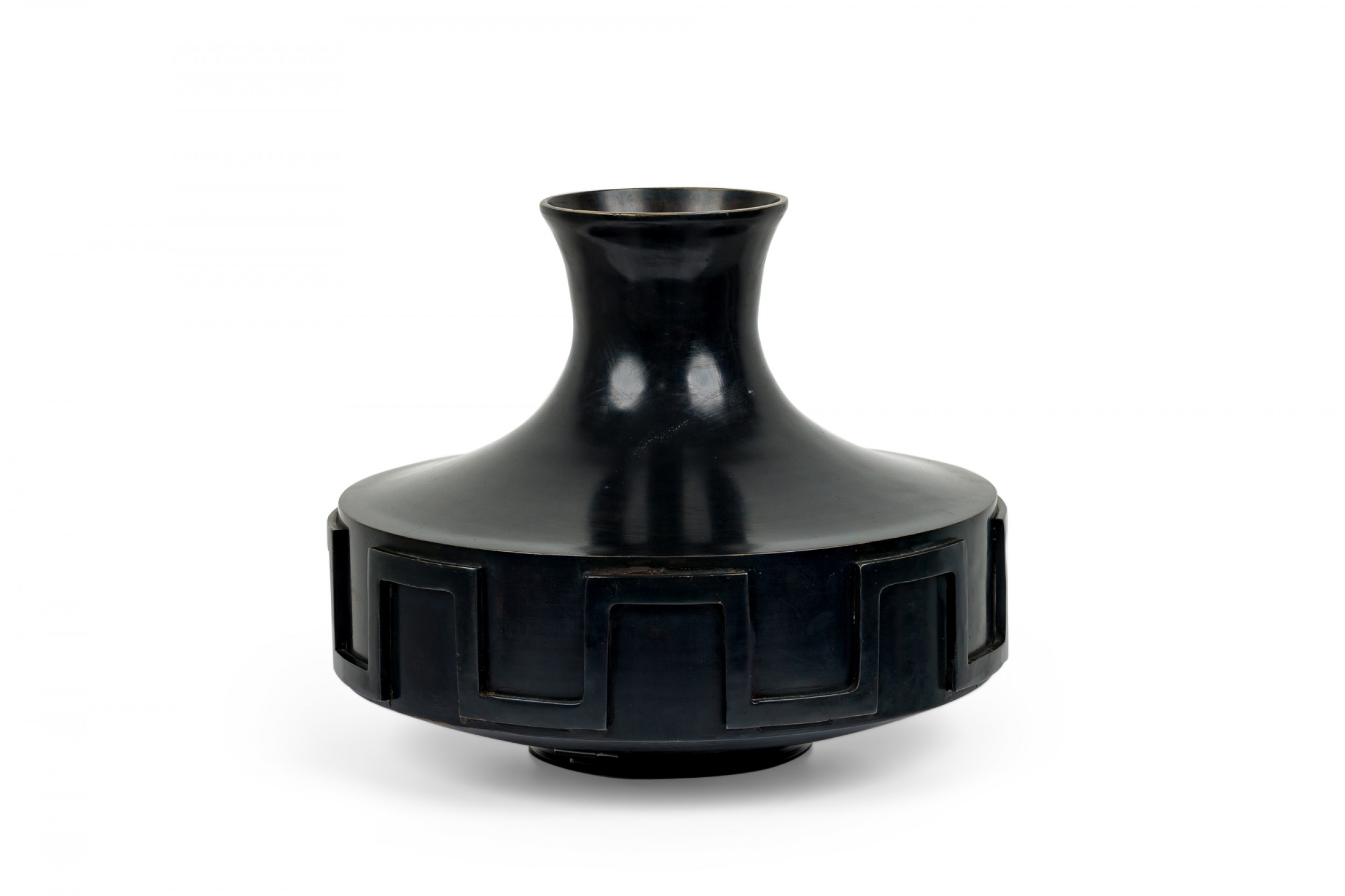Mid-Century Greecian style cast bronze urn / vase in compressed bottle form with narrow neck opening to a flared mouth, encircled by a relief "Greek key" patterned border with a black finished patina.