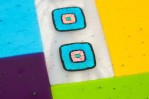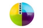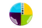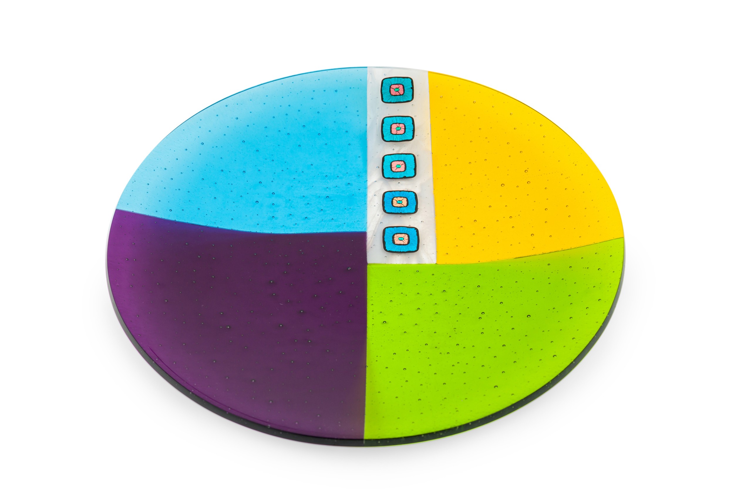American Contemporary colored and fused plate geometrically divided into blue, purple, green and yellow sections with surface painted metallic squares