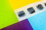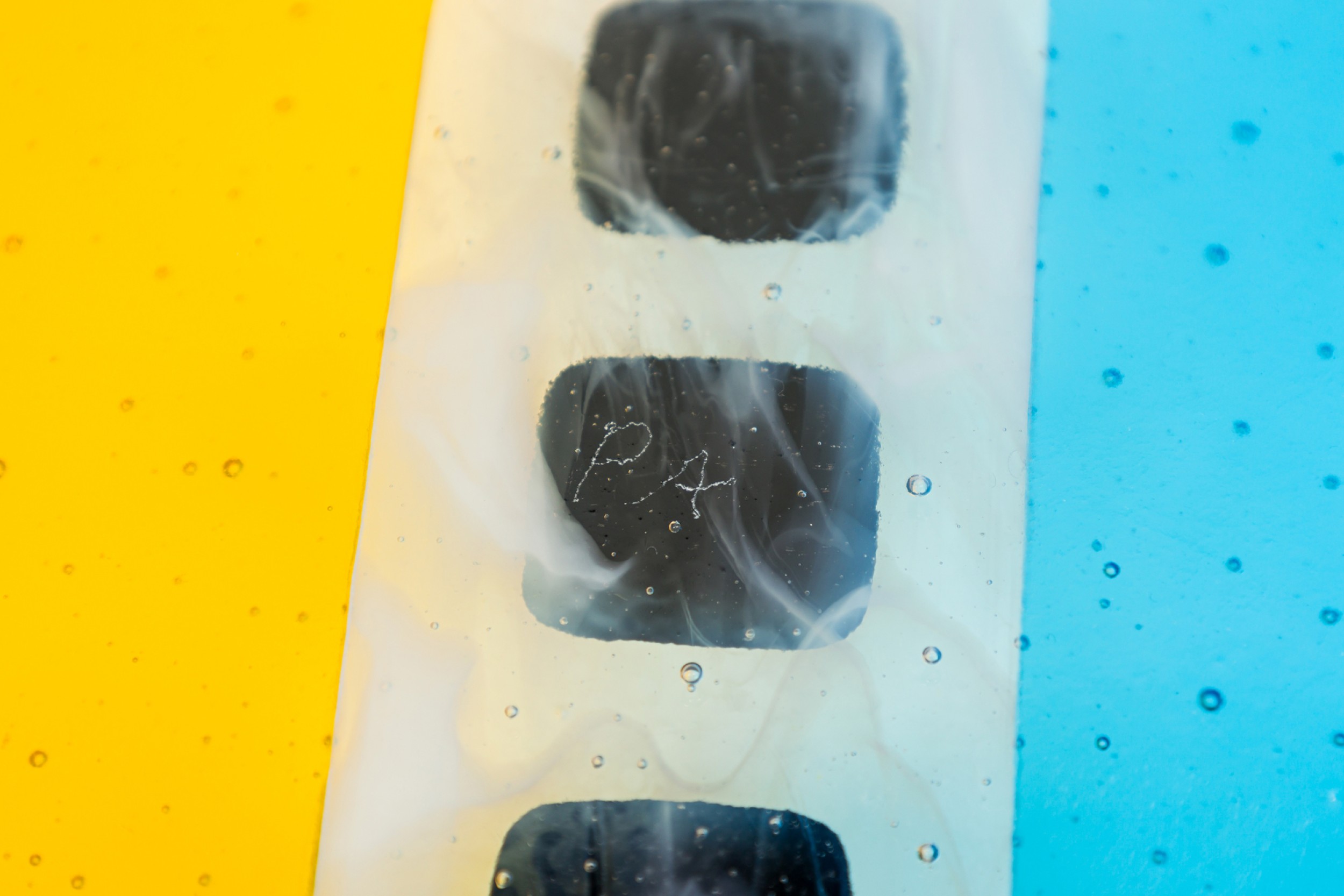 American Contemporary colored and fused plate geometrically divided into blue, purple, green and yellow sections with surface painted metallic squares.