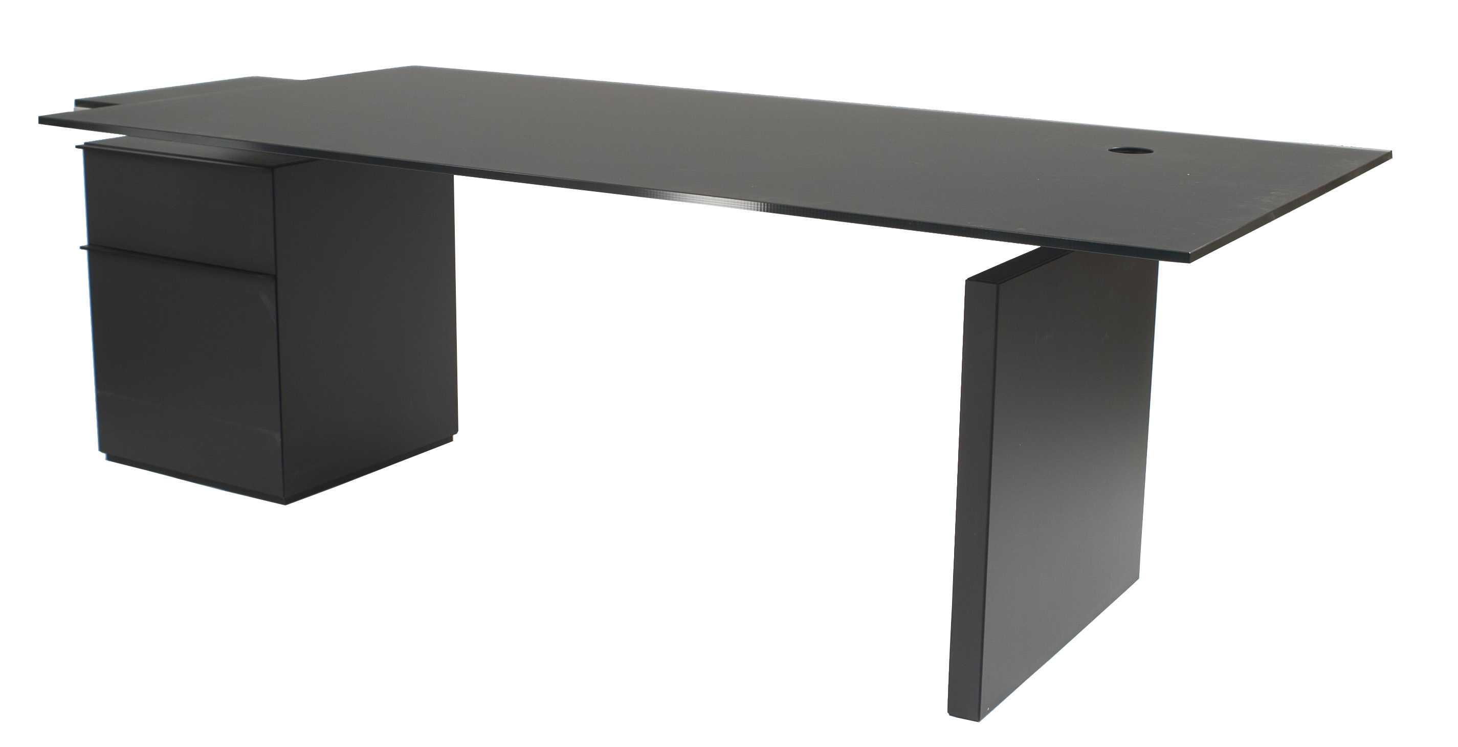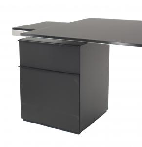 Contemporary "Icon" black satin glass top desk with 2 stacked drawers