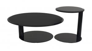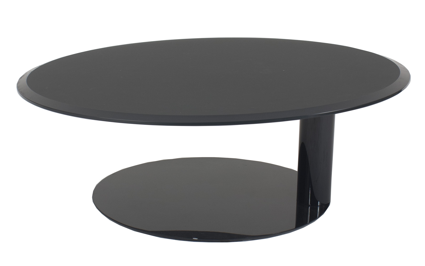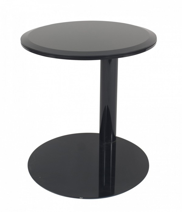 American Modern circular coffee table with a satin blue-gray beveled glass top and lacquered circular metal base (Matching items: MTL002A).