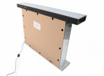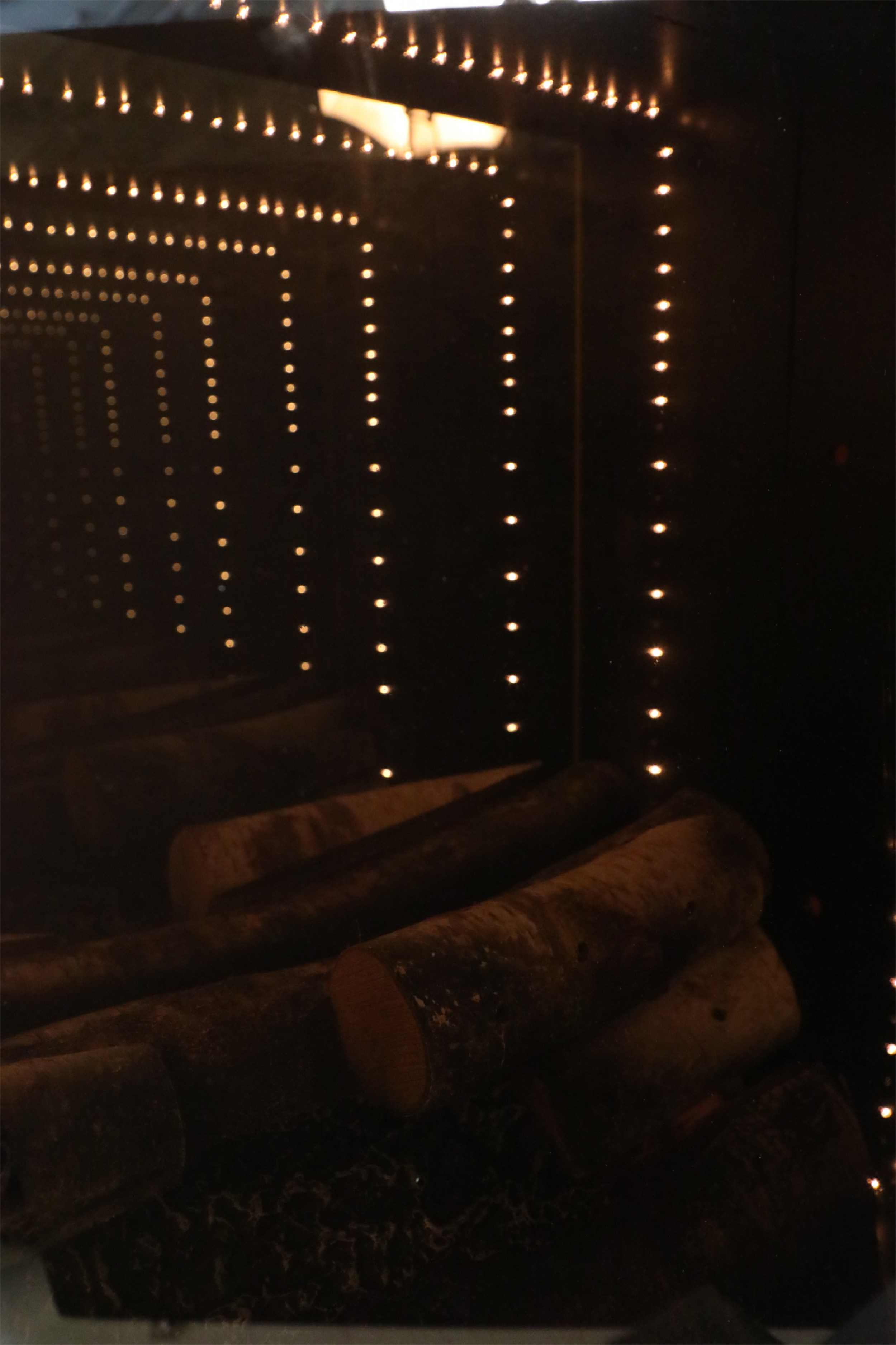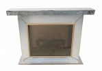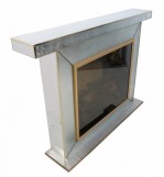 Contemporary electrified silvered metal fireplace mantel with brass trim and smoked glass front panel and having interior birch logs and a switch-operated band of lights that convert the mantel into an infinity mirror